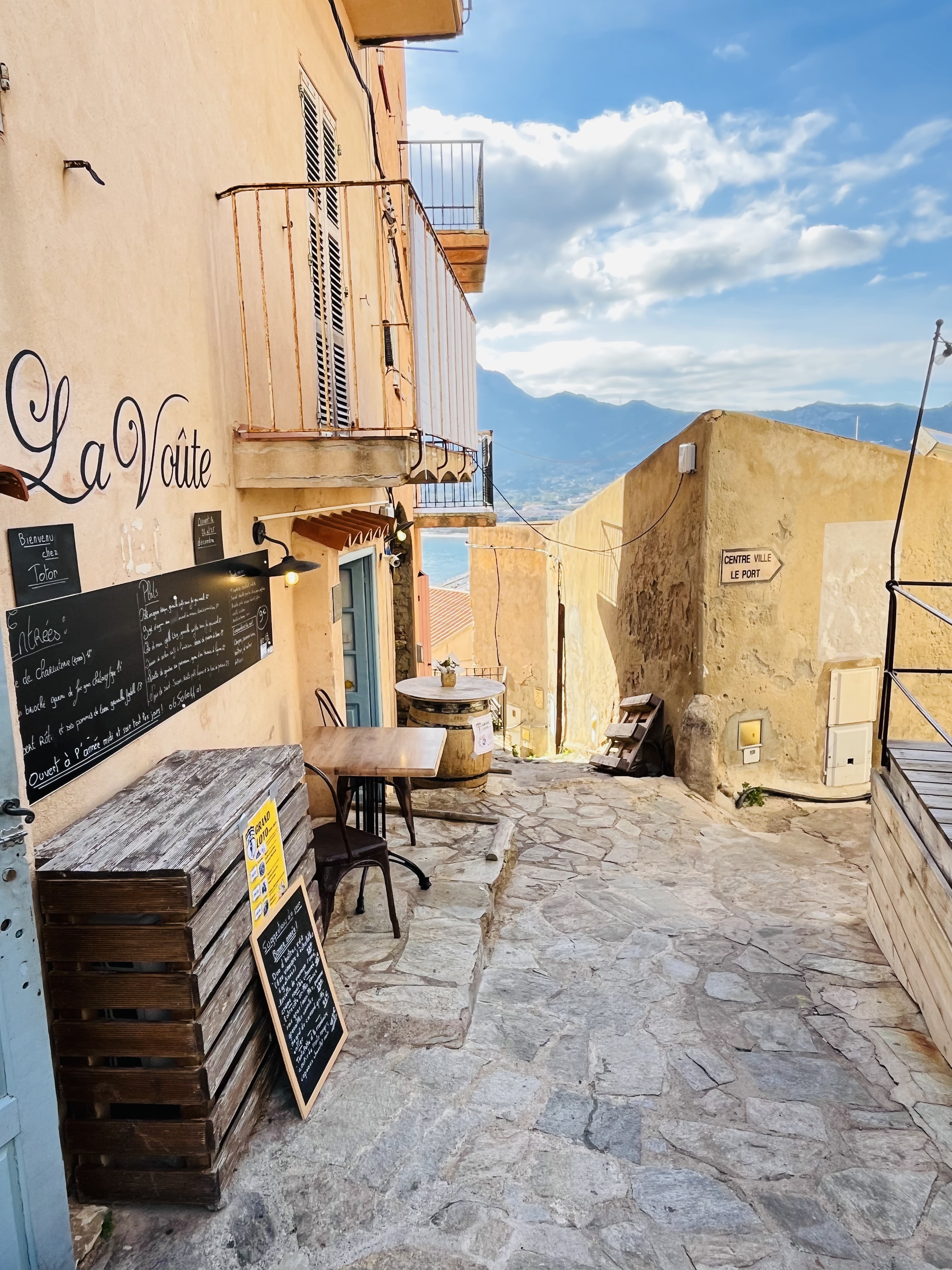 Petit restaurant traditionnel corse . Le cadre et sympathique dans un belle ruelle avec des petites vues sur la baie . Par contre il n'y avait plus de charcuterie corse , un comble pour ce style de restaurant. On a été obligé de prendre de la charcuterie espagnole . Petite carte , 5 plats principaux et il y en avait 2 indisponibles . Petite portion , j'ai pris les cannellonis (3 seulement). Quelques bons desserts mais pas tous ( fondant très quelconque et industriel).La serveuse est sympathique mais peut de personnel donc repas tres long .