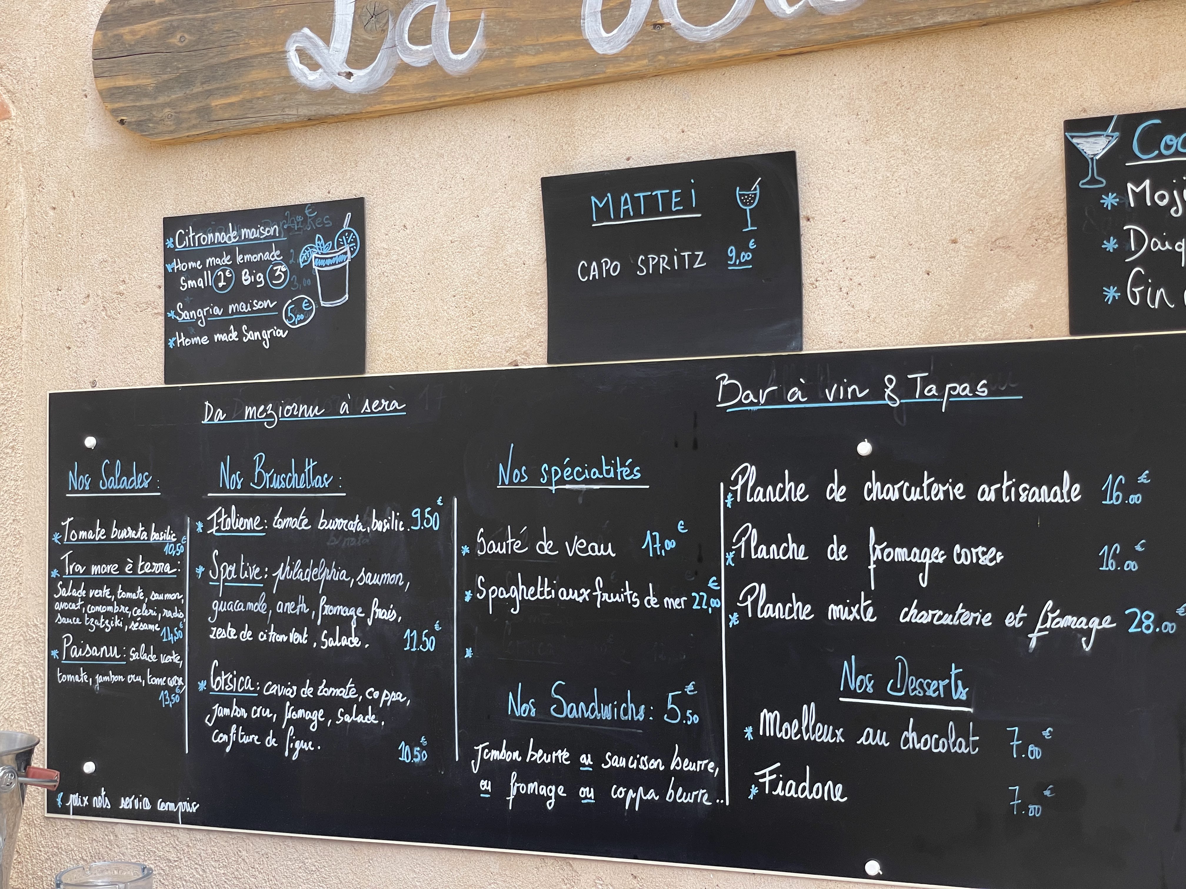 Nous y sommes allés un soir, où la carte ne comprend que deux plats chauds, dont un seul était disponible. Restaient les tapas et les boissons où tout n'était pas disponible non plus. Parmi les tapas, sans originalité, beaucoup de produits industriels. En revanche, musique Corse, musette, pour ceux qui aiment. Bref, grosse déception, en regard de la notation, et des photos.
