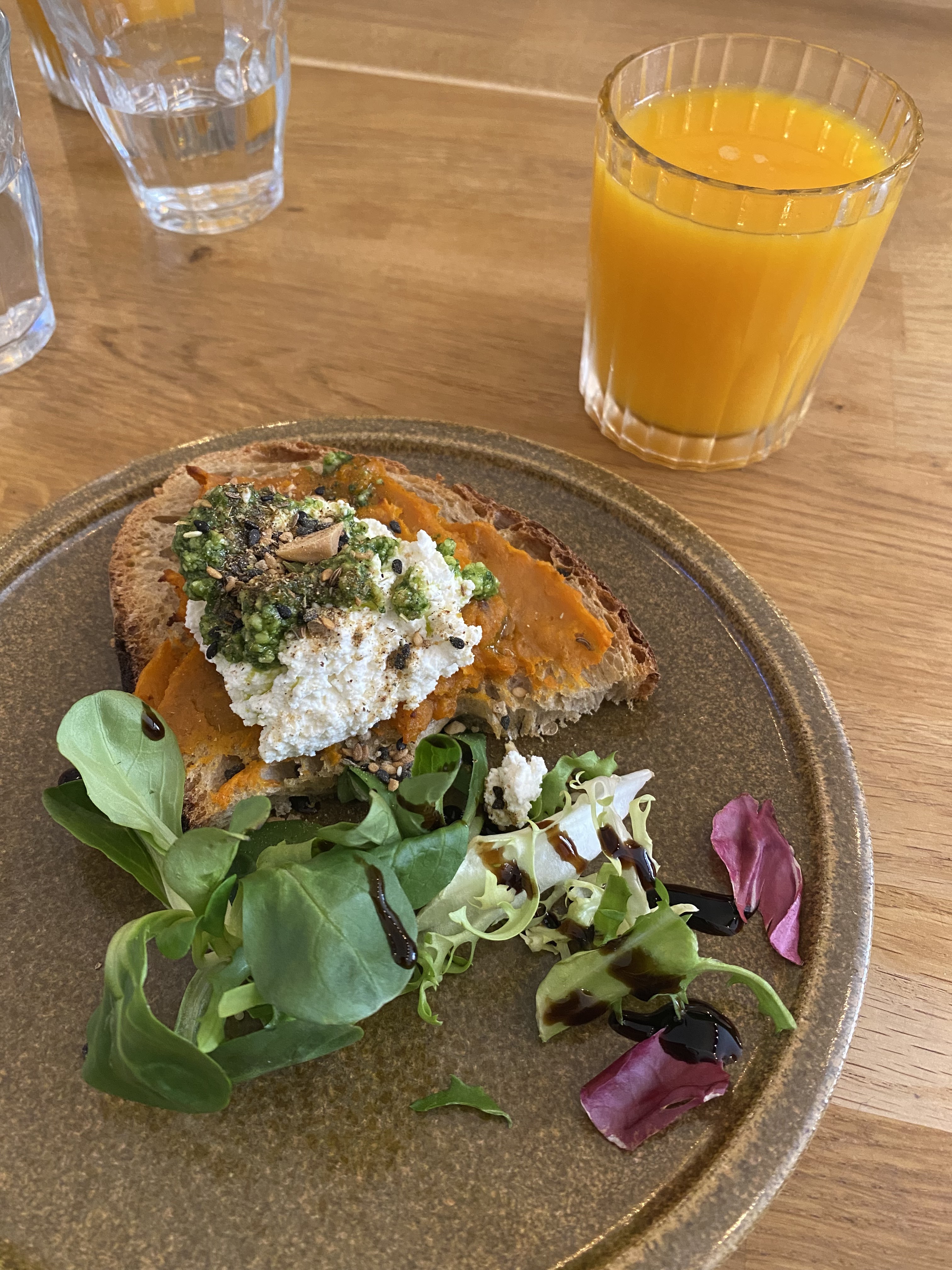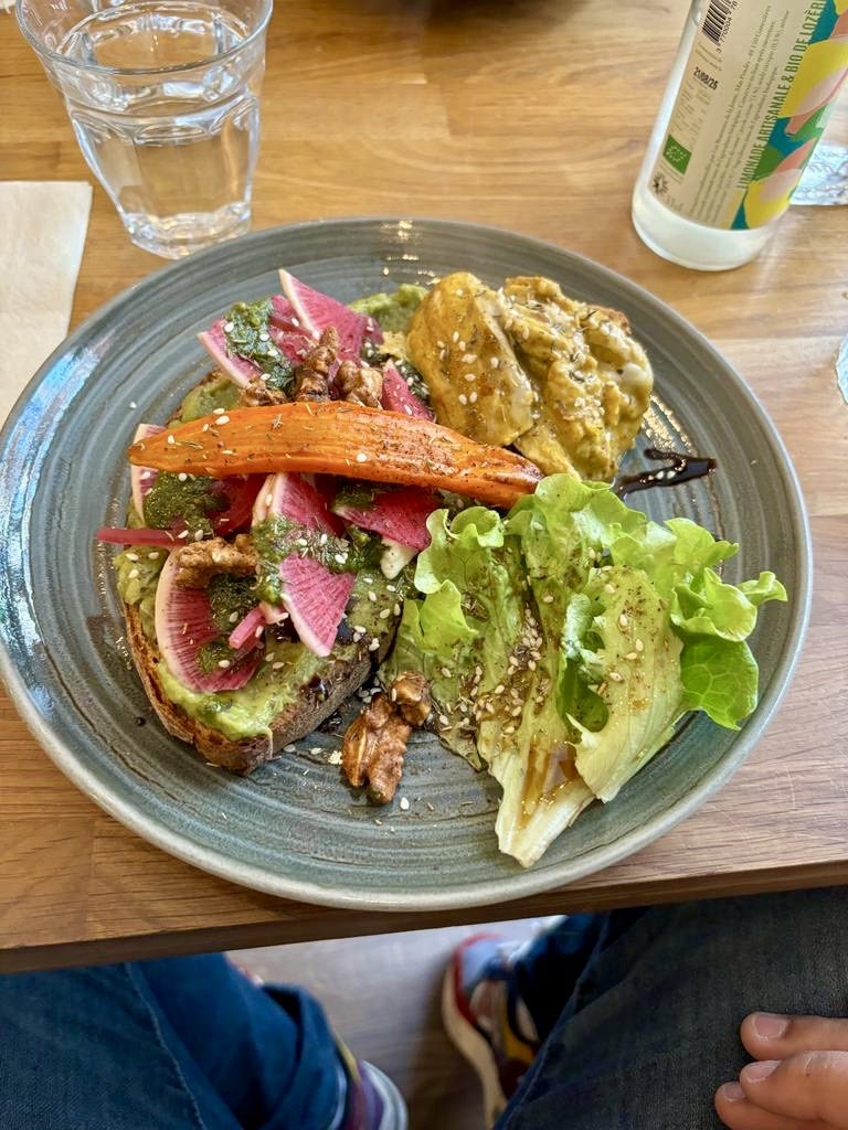 Après une petite attente de 30/45min devant le restaurant un dimanche matin (très vite oublié une fois à table !), nous avons testé la formule brunch a 27€ composée d’une boisson chaude + une boisson froide + une entrée (samosas vegan et tartine ricotta/patate douce) + la tartine du moment (houmous et légumes) + un dessert (banana bread) Tout était absolument délicieux ! Il ne reste plus qu’à revenir en semaine pour tester le reste de la carte 😇