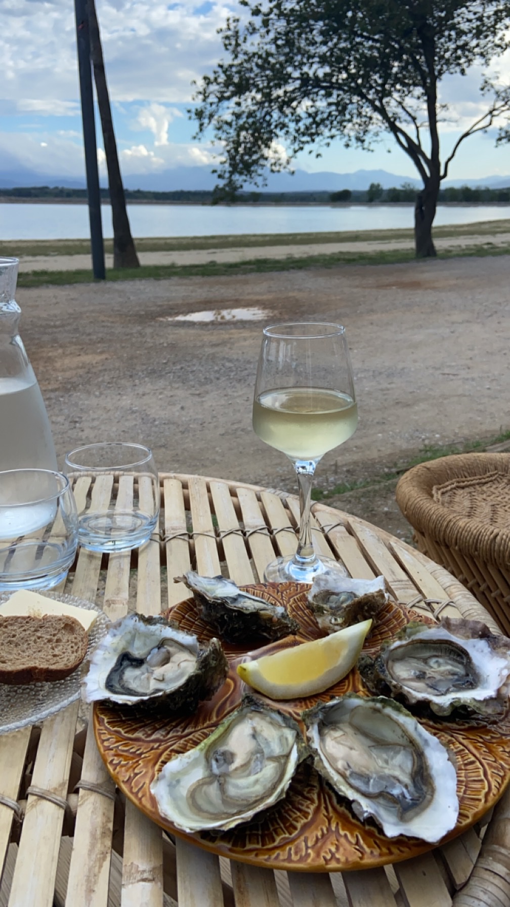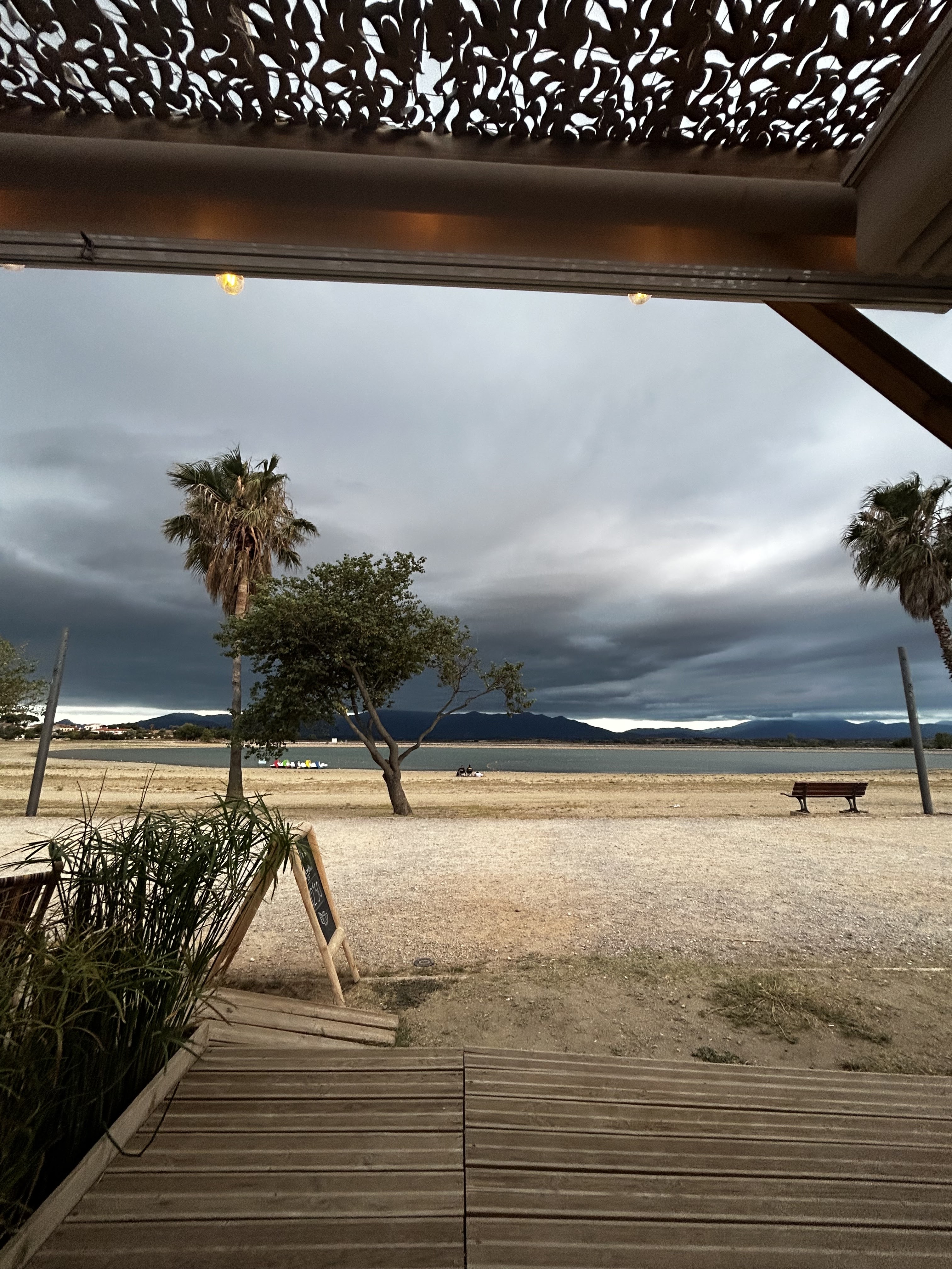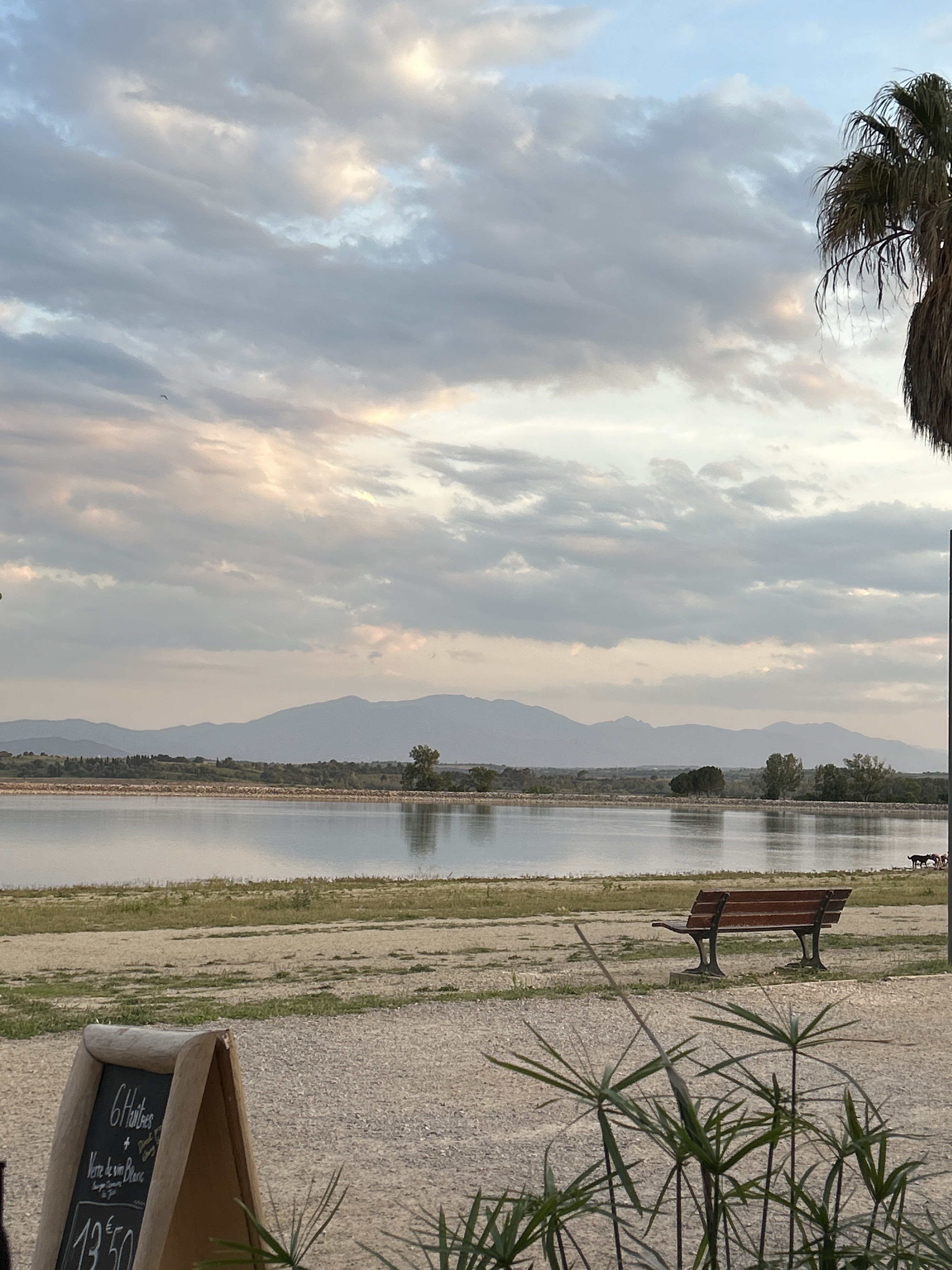 Premier soir sur Perpignan, et nous voilà parties au lac de Villeneuve de la Raho. La table nous attendait avec vue sur le lac en cette belle soirée. Rosé, Planche de charcuteries locales, une salade très copieuse (beaucoup de salade verte quand même…) et le sourire de la serveuse. Une soirée très agréable.