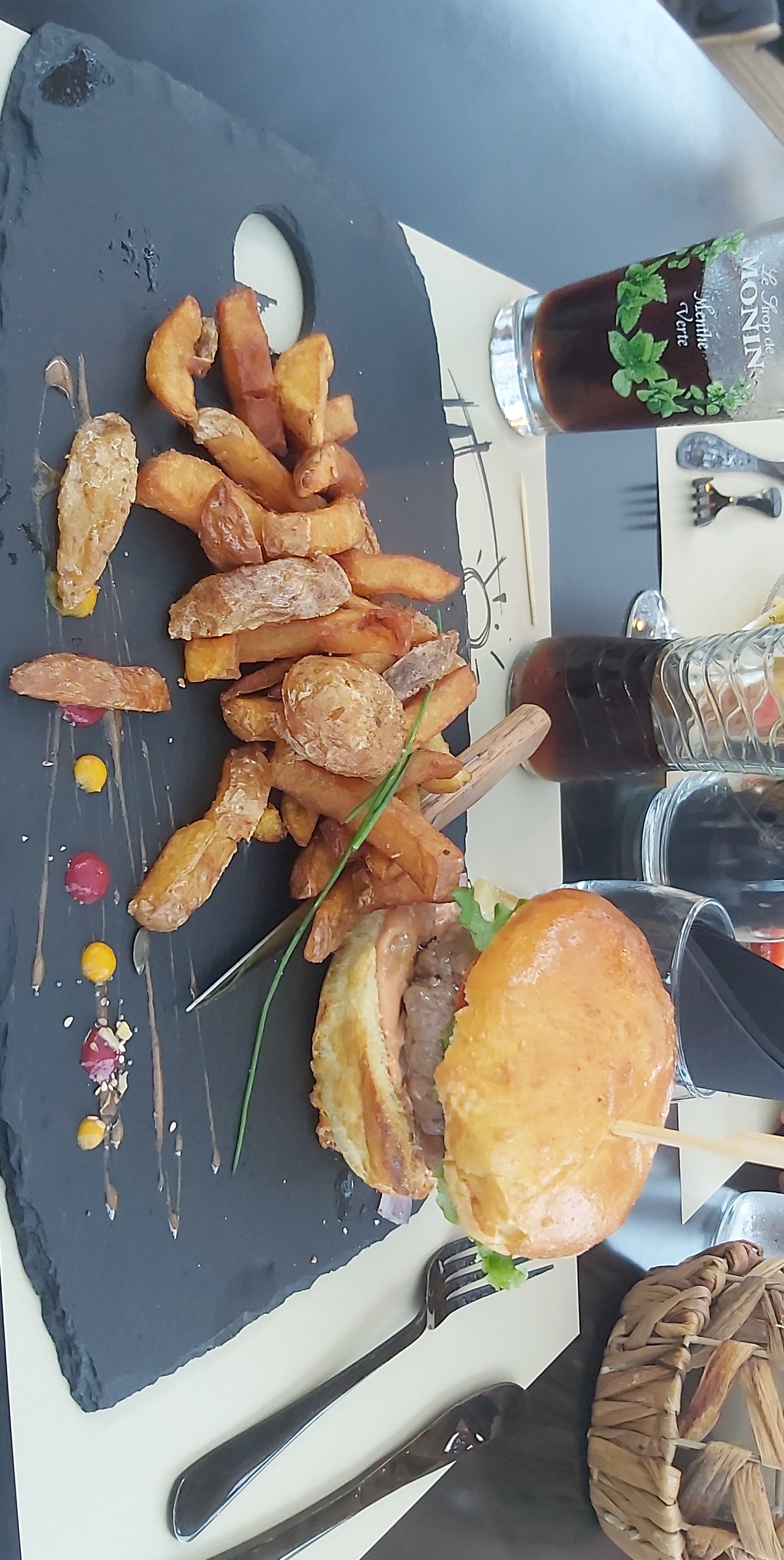 Nous nous sommes arrêtés ici pour déjeuner alors que nous étions au camping voisin, service très sympathique (la serveuse a essayé son meilleur anglais) Les options végétaliennes au menu étaient une surprise, ce qui n'est pas habituel en France, les hamburgers étaient très bons, tout comme le dessert crumble, je reviendrai certainement ici lors de notre prochaine visite, pas cher non plus, plus de ça s'il vous plaît ?