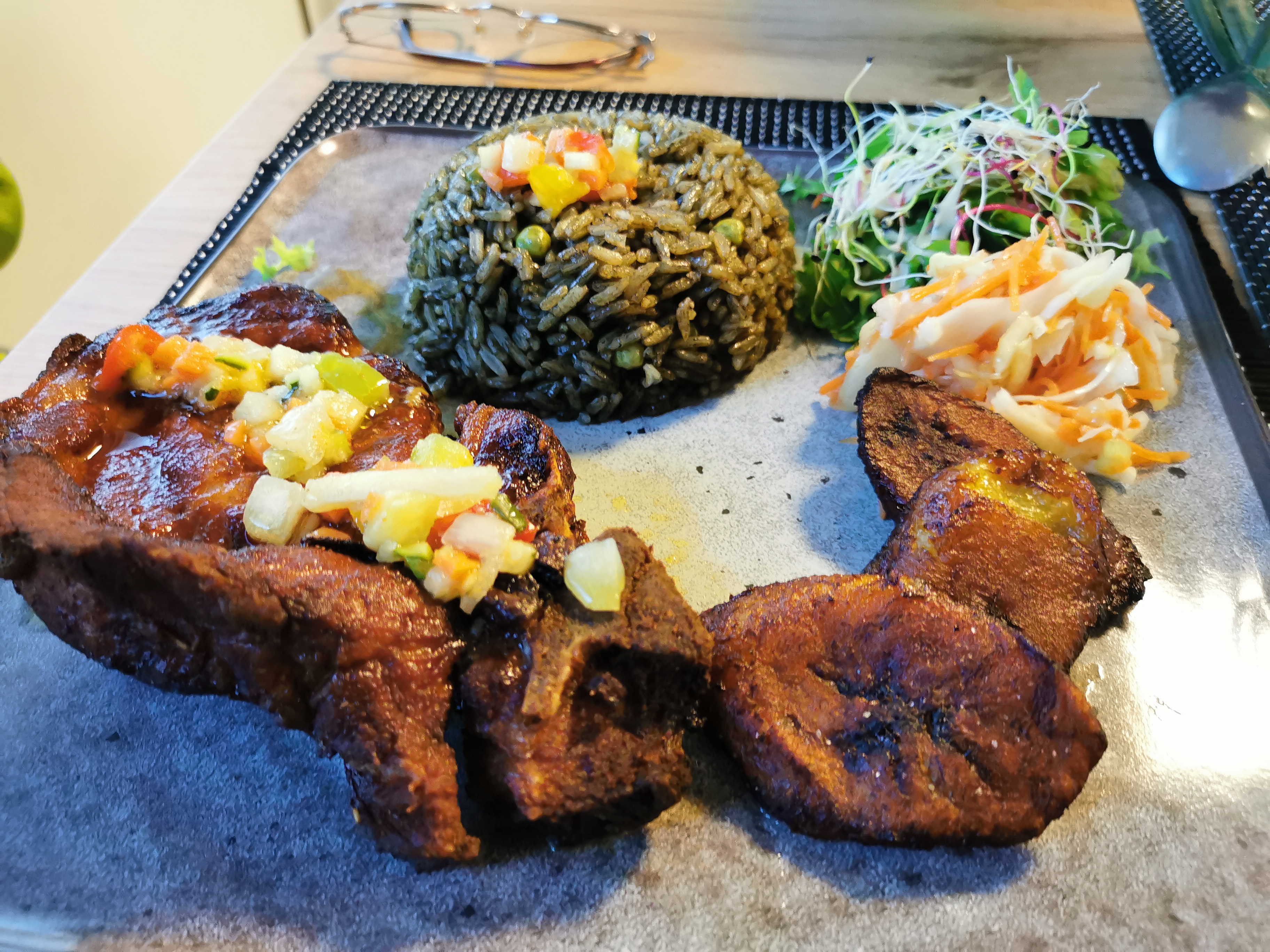Soirée agréable ou la patronne-cuisinière nous a accueilli avec le sourire et a expliqué sa cuisine créole. Le repas était très bon, épicé mais adapté au goût français. Elle fait des ventes à emporter et livraisons. Sur photos poulet jerk et cote de porc avec riz djondjon