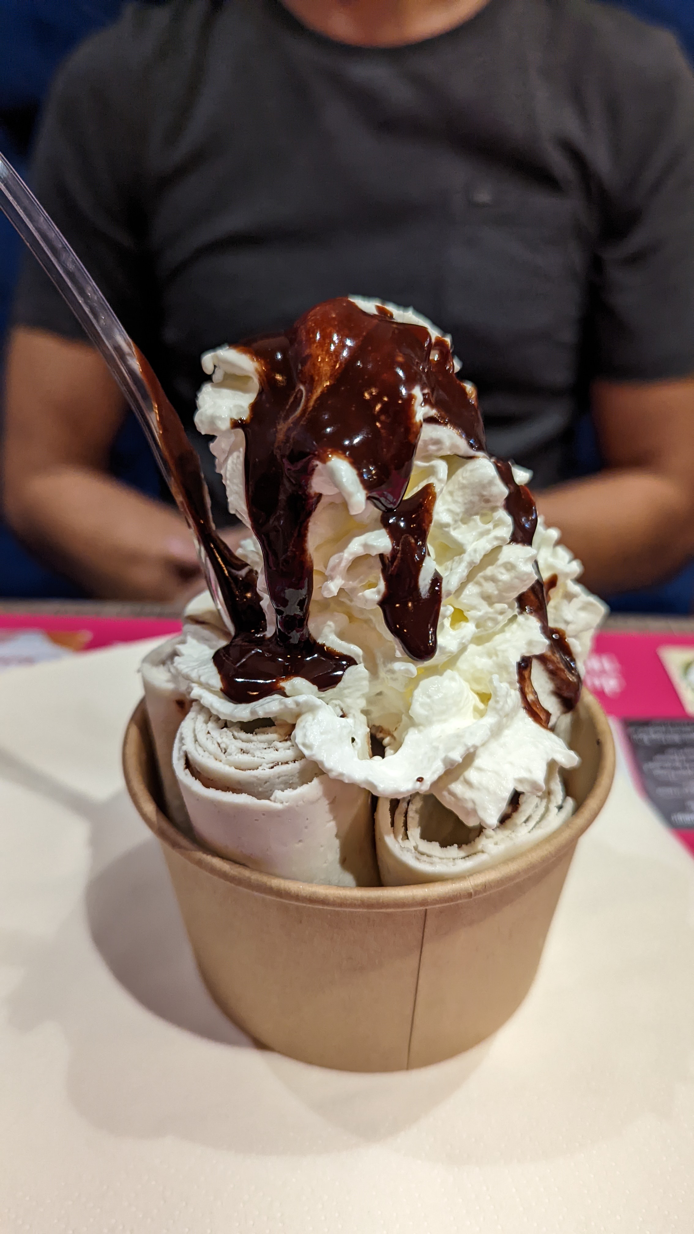 J'ai goûté pour la première fois des glaces Ice Roll. Je m'attendais à une glace sous un autre aspect mais finalement le goût est totalement différent ! C'est comme un milkshake mais version solide et roulé, très surprenant ! Je suis ravi d'avoir découvert ce nouveau style de glace. Service agréable et souriant, le cadre est très sympathique.