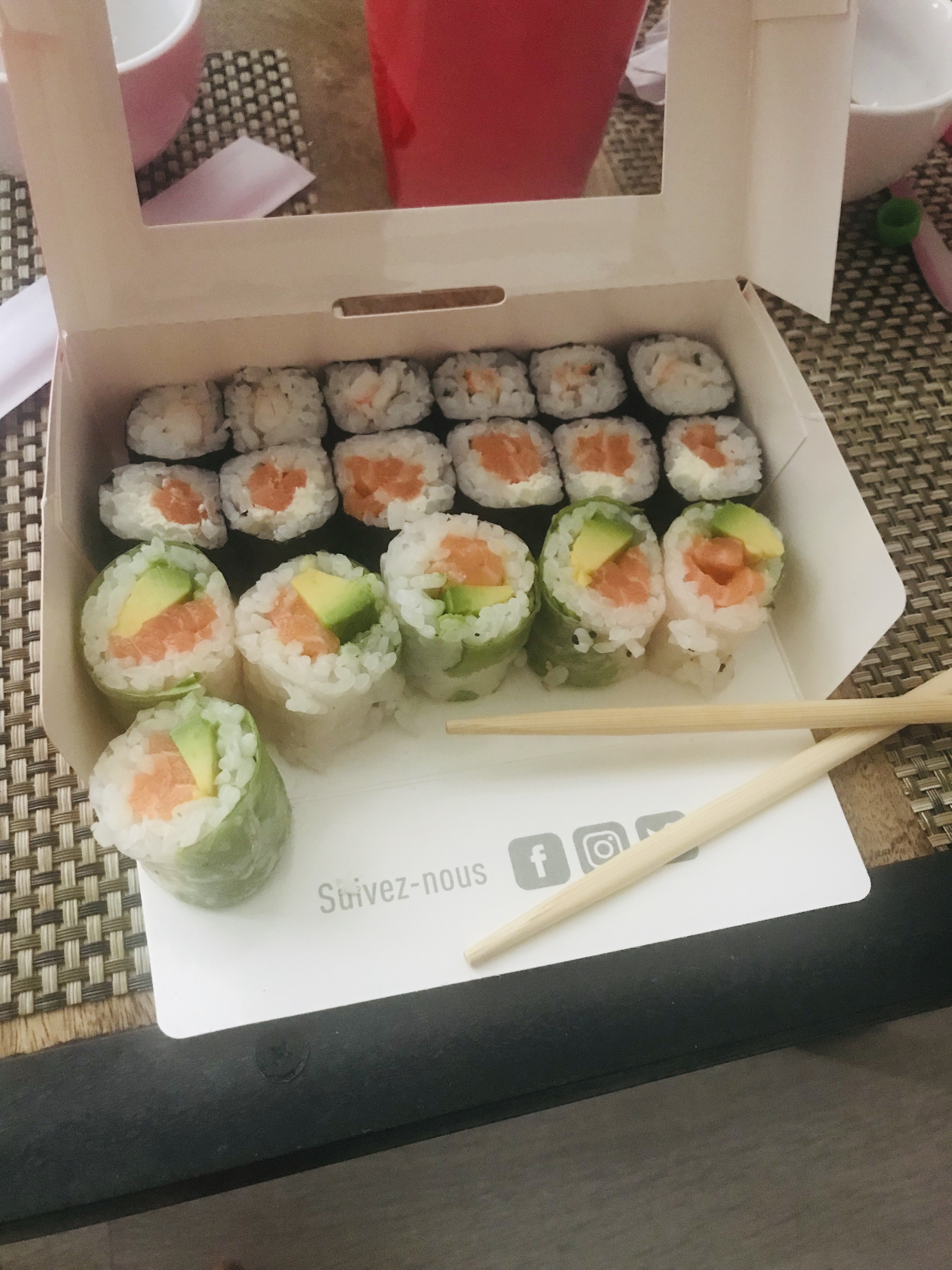 Je viens de commander en livraison avec mon mari, très déçu. Les sushis sont ultras secs, et dans les californias poulet Spicy, ou est le spicy ?? Seul point positif la livraison ultra rapide.