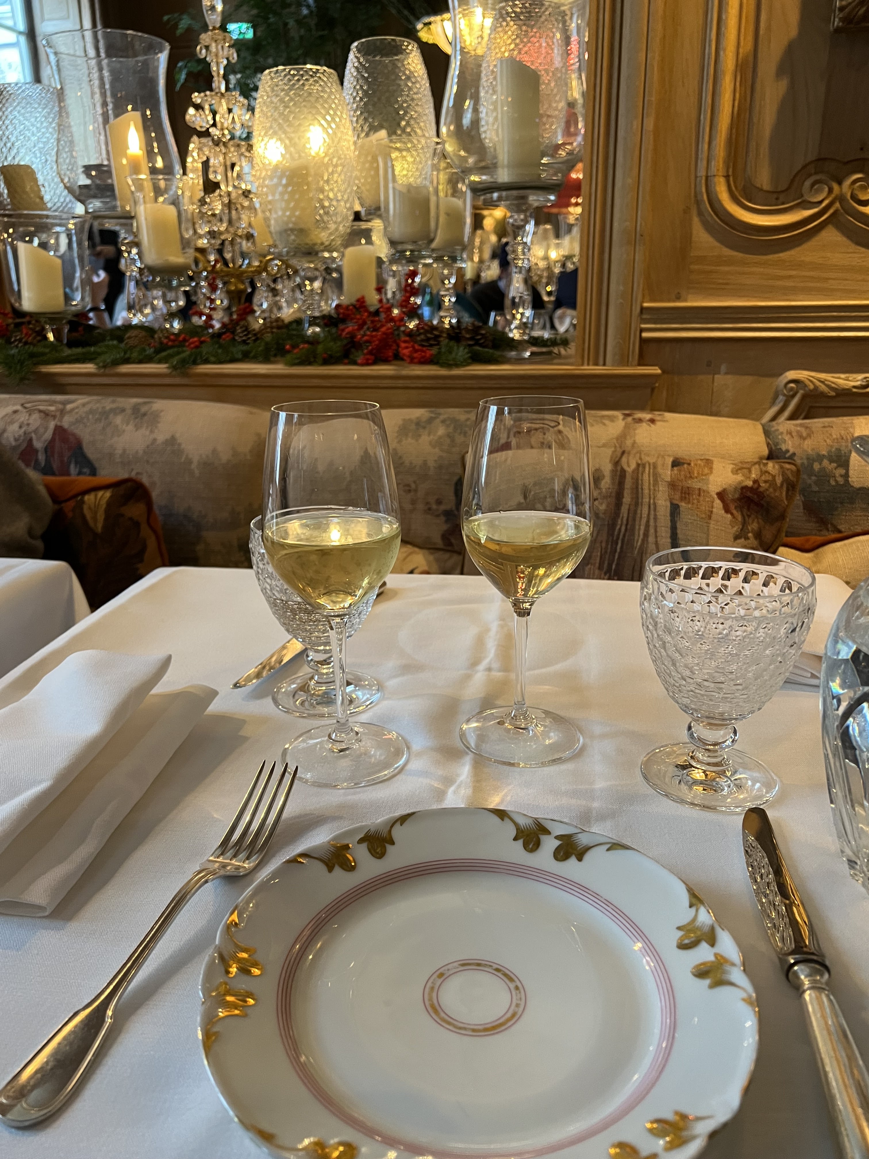 Cadre superbe, décoration dans un style grand siècle qui permet une ambiance intime avec éclairage à la bougie le soir. Personnel à l’écoute mais qui fait un peu trop son ”show”. En revanche, déception complète quant à la cuisine. Huître granitée sans aucun goût à part celui de glace pilée, entrecôte ferrée et frites pour 3 présentées dans un plat central comme à la cantine froides et molles!!! Le plus choquant : le prix du vin. Des vins de bonne qualité mais à des prix littéralement prohibitifs. Nous en avons eu pour plus de 1000 euros à 4. Endroit certainement très à la mode mais grosse grosse déception pour un vainqueur de top chef