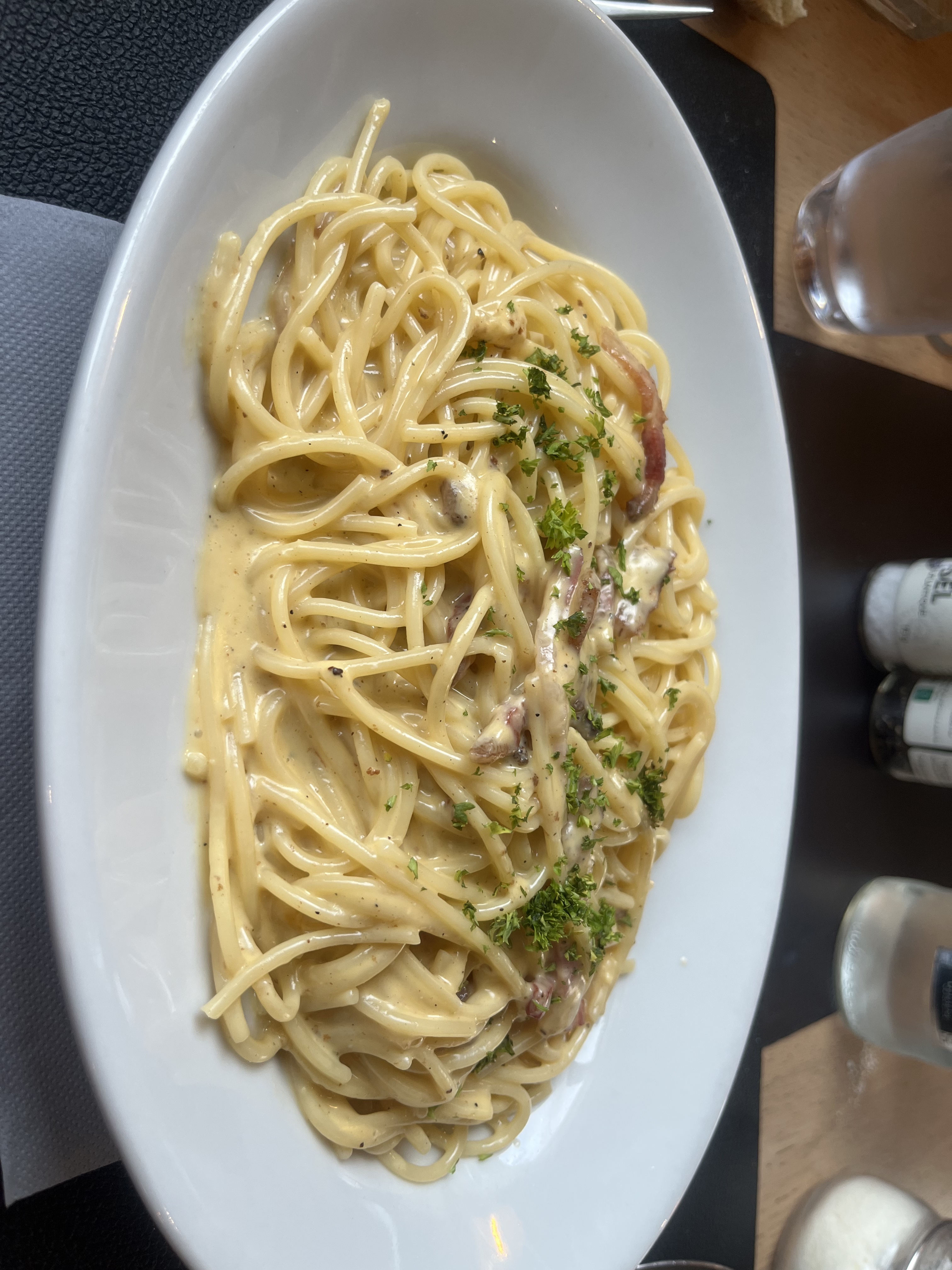 Déçue par les carbonara qui n'avaient pas beaucoup de goût. A contrario du menu du jour (gnocchis était beaucoup trop salé. Ensuite quand on nous sert les boissons, s'il était possible que le serveur ne mette pas les doigts dans les verres ce serait plus hygiénique ! S'il ne peut pas tout porter, il prend un plateau .... Et lorsqu'il se trompe dans la prise de commande (mauvais plat), pas la peine d'être ensuite désagréable avec nous ! L'amabilité avec les clients ce n'est pas qu'avec les habitués ... PS : on ne change pas non plus un dessert commandé sans demander l'avis du client si le dessert commandé n'est plus disponible