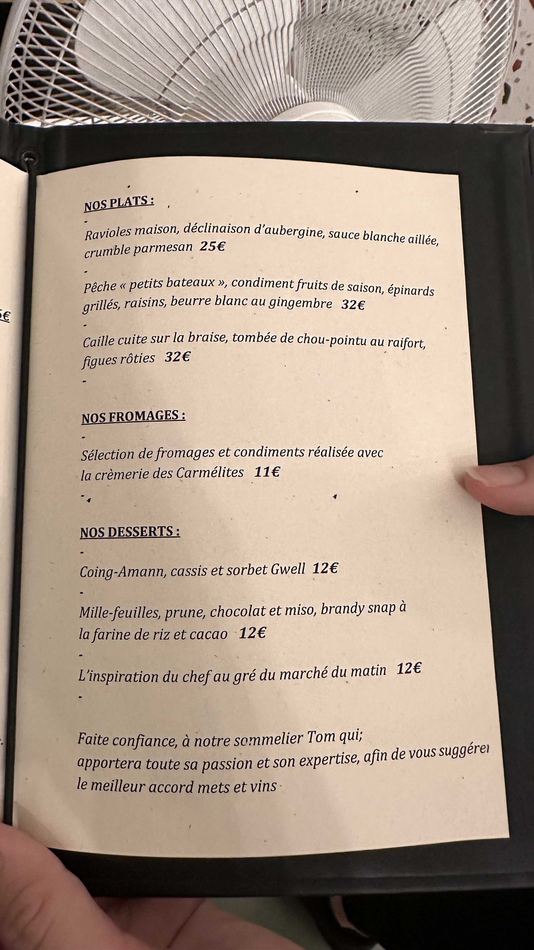 Les plats sont délicieux et raffinés, les conseils du sommelier excellent, et lieu très joliment décoré, nous avons passé une merveilleuse soirée. Seul bémol, il n'y a pas de climatisation et pendant les fortes chaleurs il fait vraiment très chaud à l'intérieur. Je recommande et y retournerai avec plaisir !