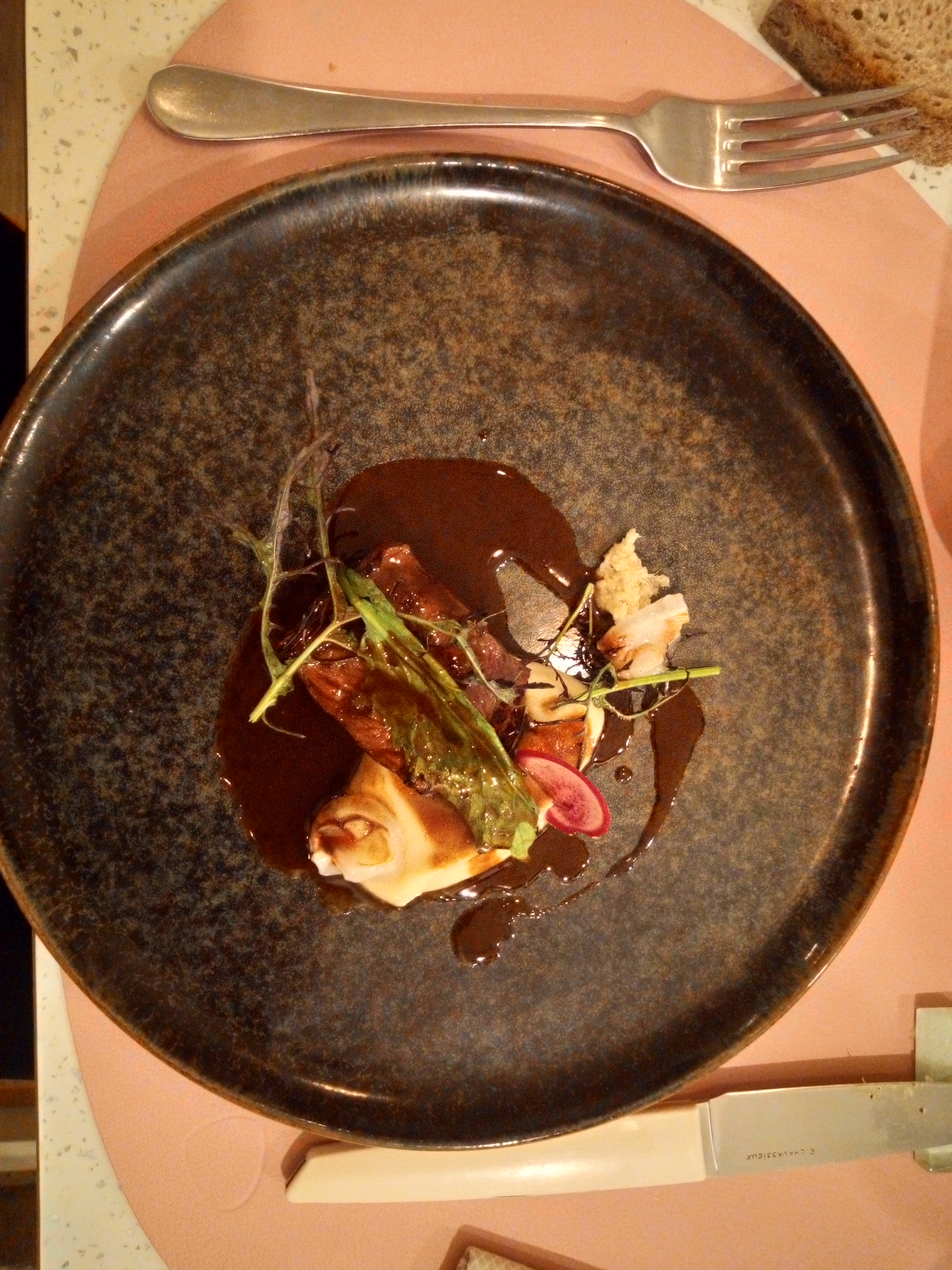 Dans un cadre aux codes actuels (suspensions cuivre, chaises de type scandinave…), le chef a décidé de vous proposer un menu découverte surprise à 55€. Contrairement aux menus « découverte » classiques qui vous annoncent au moins les produits qui vont vous seront proposés, vous laissez carte blanche au chef. Ce parti pris présente toujours un risque notamment sur des produits moins habituels comme la grenouille ce soir là. Pourquoi pas après tout, il faut aussi savoir se laisser surprendre et casser ses habitudes. Dans notre cas, pour notre week-end découverte de Nantes, et malgré la qualité des produits et des plats proposés, nous avons été déçu dans l’ensemble. Ainsi dans un menu en 6 plats (surtout lorsque les portions sont relativement petites) on s’attend à un concentré de goûts, une explosion de saveurs, un grain de folie dans l’assiette. Malgré le travail énorme visible derrière chaque assiette et le choix des produits, nous n’avons pas voyagé, et contrairement à un autre restaurant testé la veille, nous n’avons pas ressenti d’étincelle. On peut notamment citer l’exemple du bouillon très à la mode versé dans les assiettes. Servi dans une assiette plate pour accompagner la viande, les quelques gouttes du bouillon peinent à trouver une raison d’être dans le plat (si vous arrivez à les récupérer dans l’assiette). Le dessert en double (2 plats / 6) donne aussi cette impression de lourdeur à la fin du repas (sans compter les mignardises sucrées de fin), on aurait préféré un pré-dessert qui aurait fait la transition entre le salé et le sucré. Hormis ces remarques, il est néanmoins clair que le chef est talentueux, et très à l’écoute des remarques. C’est la raison pour laquelle nous notons 4 étoiles malgré tout.