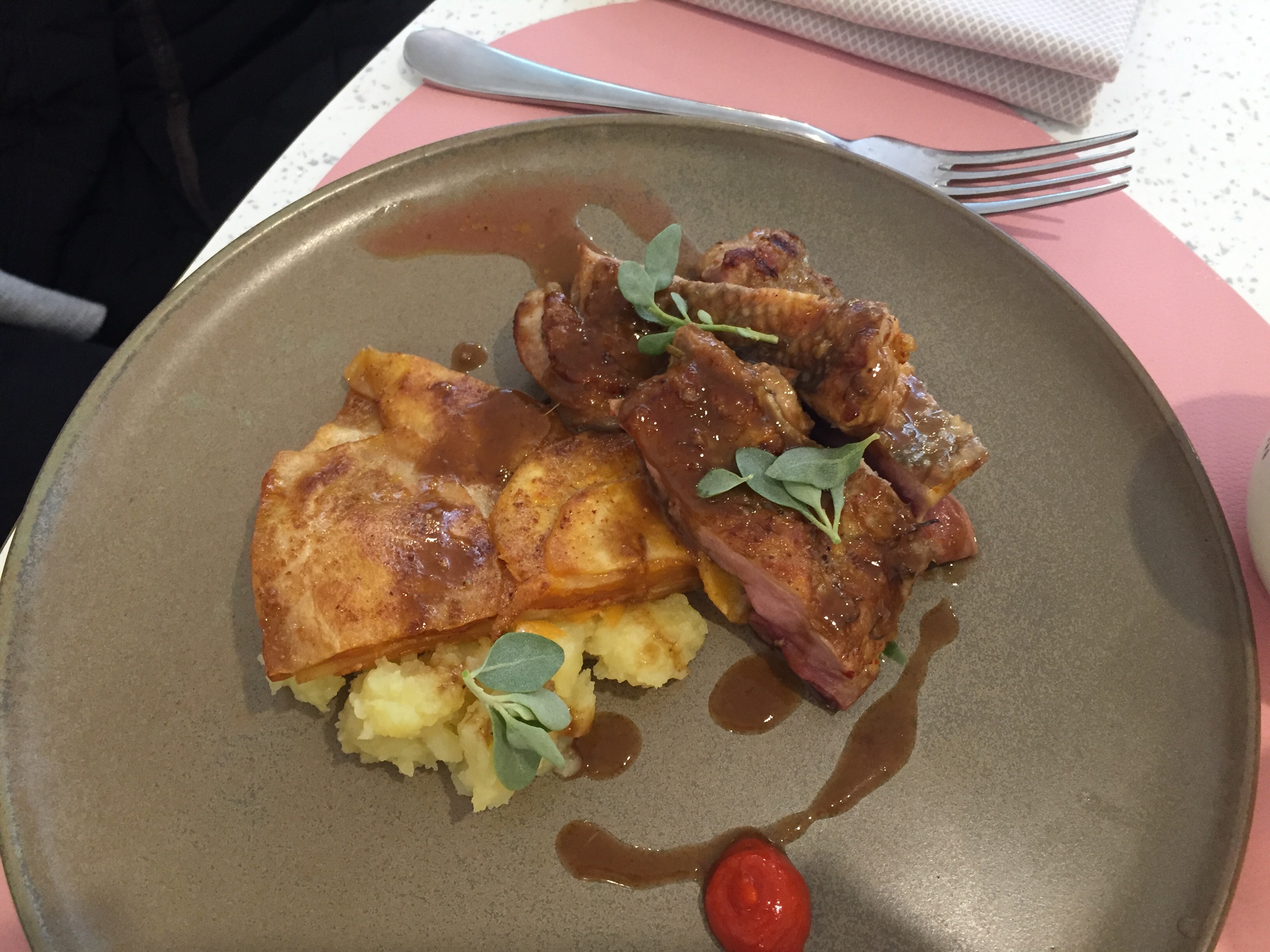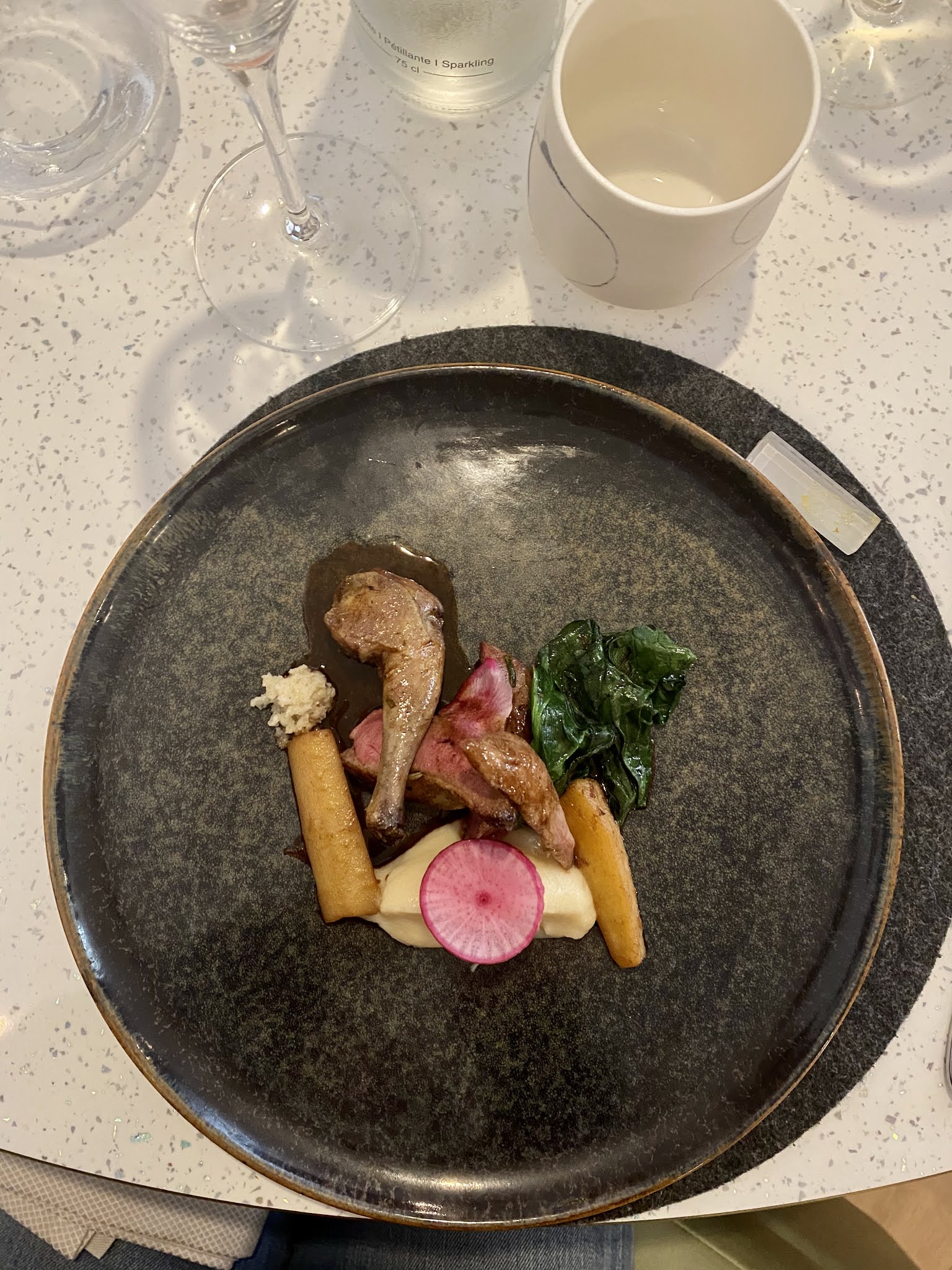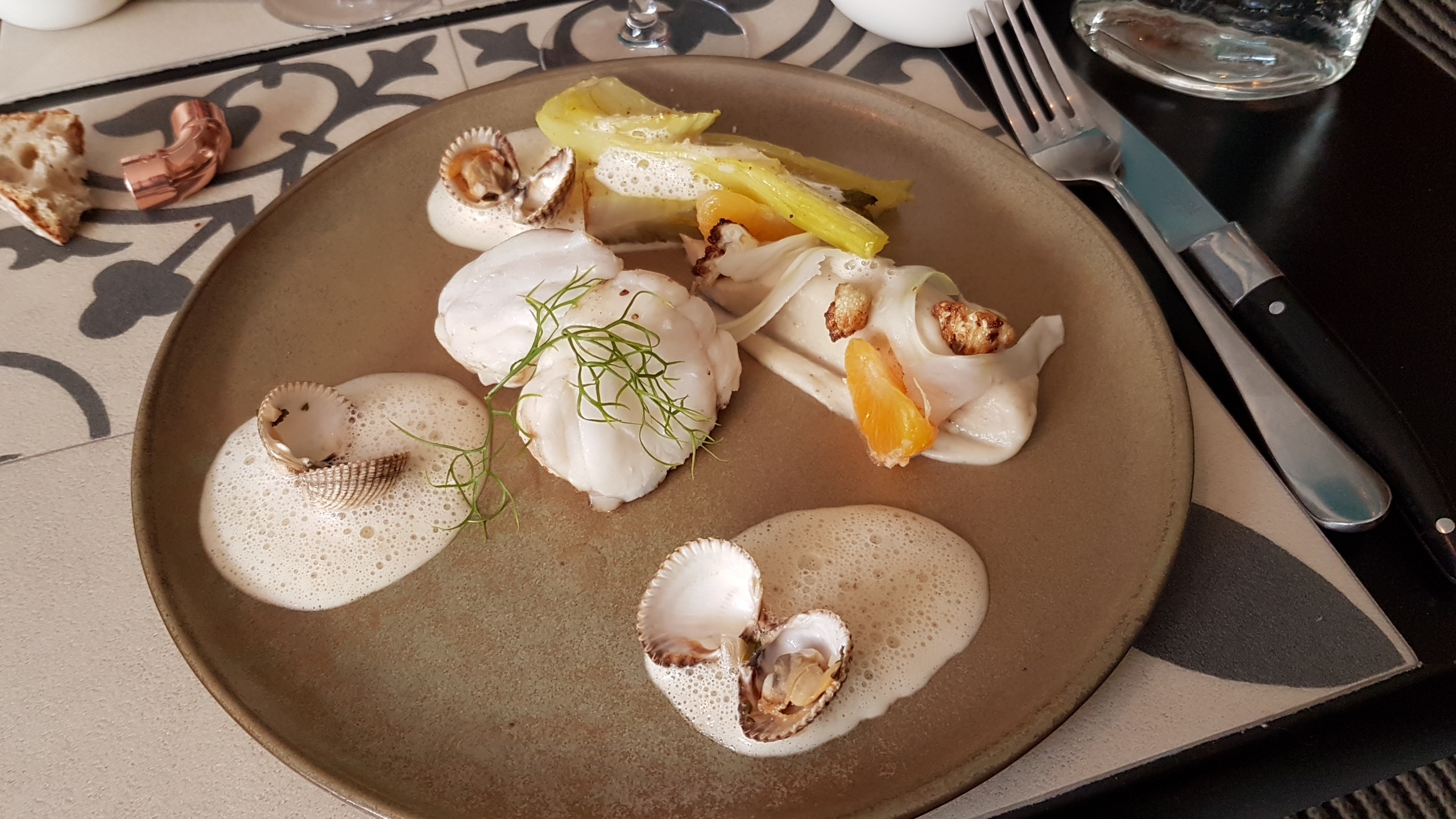 Un avis mitigé... Sur une déclinaison en 5 plats., un excellent début avec des noix de St Jacques très parfumées, une belle cuisson du merlu mais un peu gâché par une vache normande un peu dure en 4eme plat et surtout un seul dessert à partager à 2 pas au niveau (un pancake sec sans intérêt.. dommage). Un service sympathique mais difficile de capter leur regard si besoin.