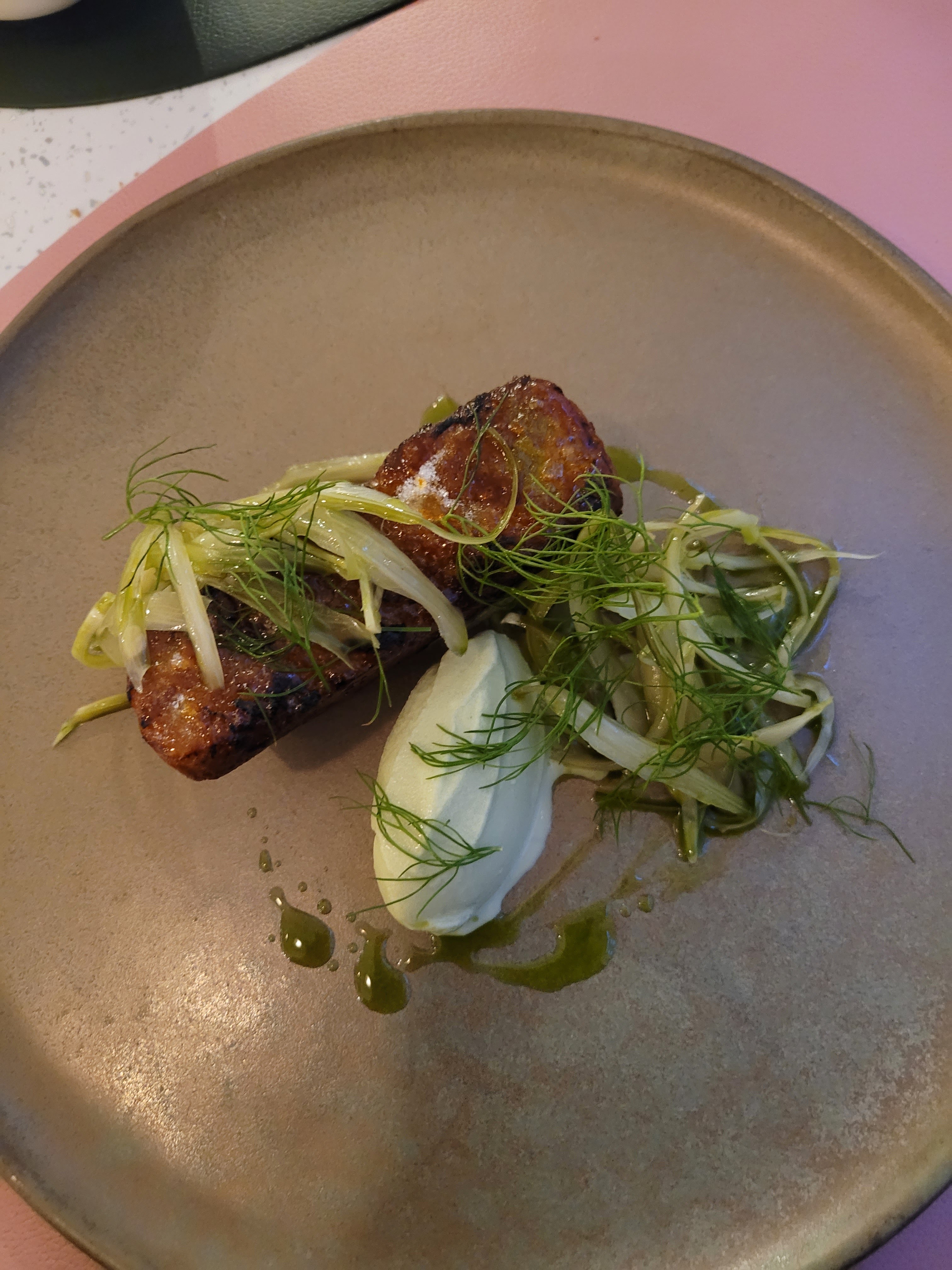 Ambiance sympa, service bon mais niveau enthousiasme peu mieux faire. Pour commencer cocktail maison. Très bon mais quantité hyper limite pour 14€. J’ai payé les glaçons. La cuisine est inventive, les plats étaient fins, les quantités bonnes. Le poisson du jour était annoncé avec des fraises. Je cherche encore, il y avait une demie fraise. Une promesse non tenue. Dessert rhubarbe fenouil non abouti, le fenouil cru n’apporte pas de plus value et n’est pas très agréable cru. Il faudrait le travailler différemment. Mes plats étaient bons mais n’étaient pas totalement abouti. Je suis critique mais je précise qu’il s’agit d’un bon restaurant vous pouvez y aller sans hésiter.
