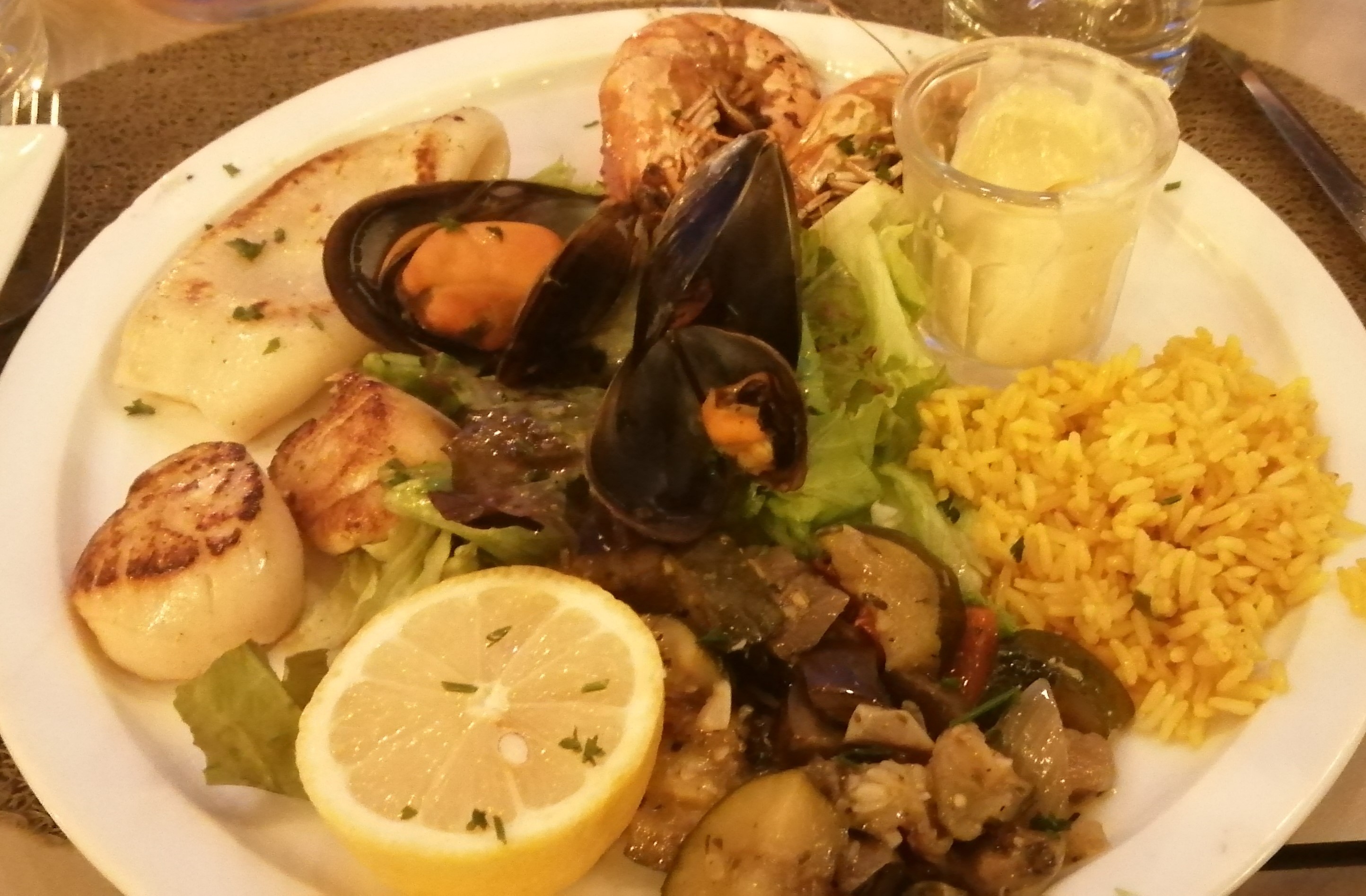 Les gambas et les moules beaucoup trop cuites ,pas de rince doigts à disposition ni de poubelle de table ,riz on compte les grains ! Complètement déçu de mon plat