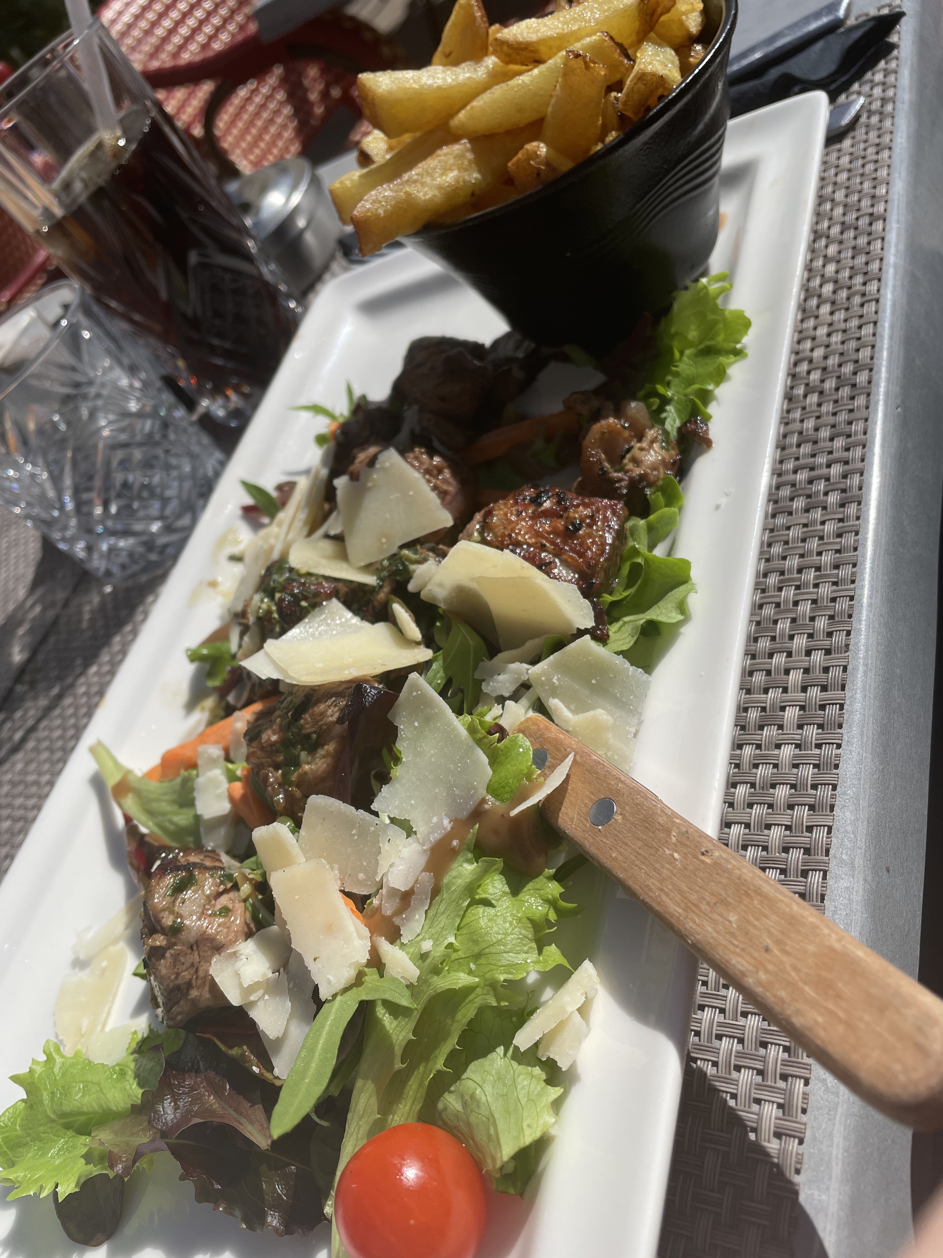 Très agréable repas sur une belle petite place tranquille. Service impeccable et qualité des plats t irréprochable. (Salade César et brochette d’agneau). Merci