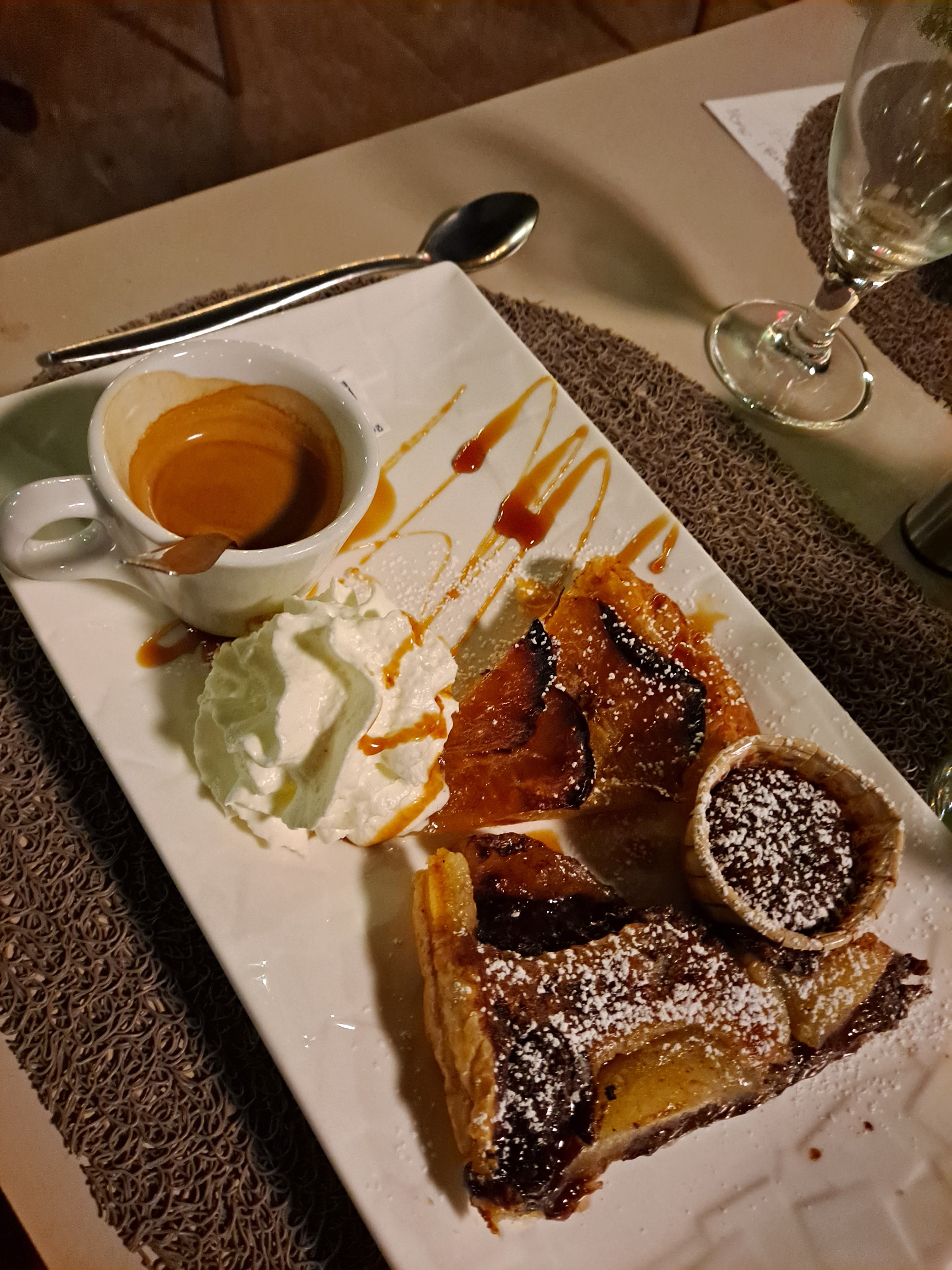 Pas terrible. Service lent, il faudrait penser à engager davantage à l’approche de la belle saison. Café gourmand pas gourmand, une part de tarte taro. Et encore une part de tarte aux poires et chocola : Lourd et peu varié pour un café gourmand