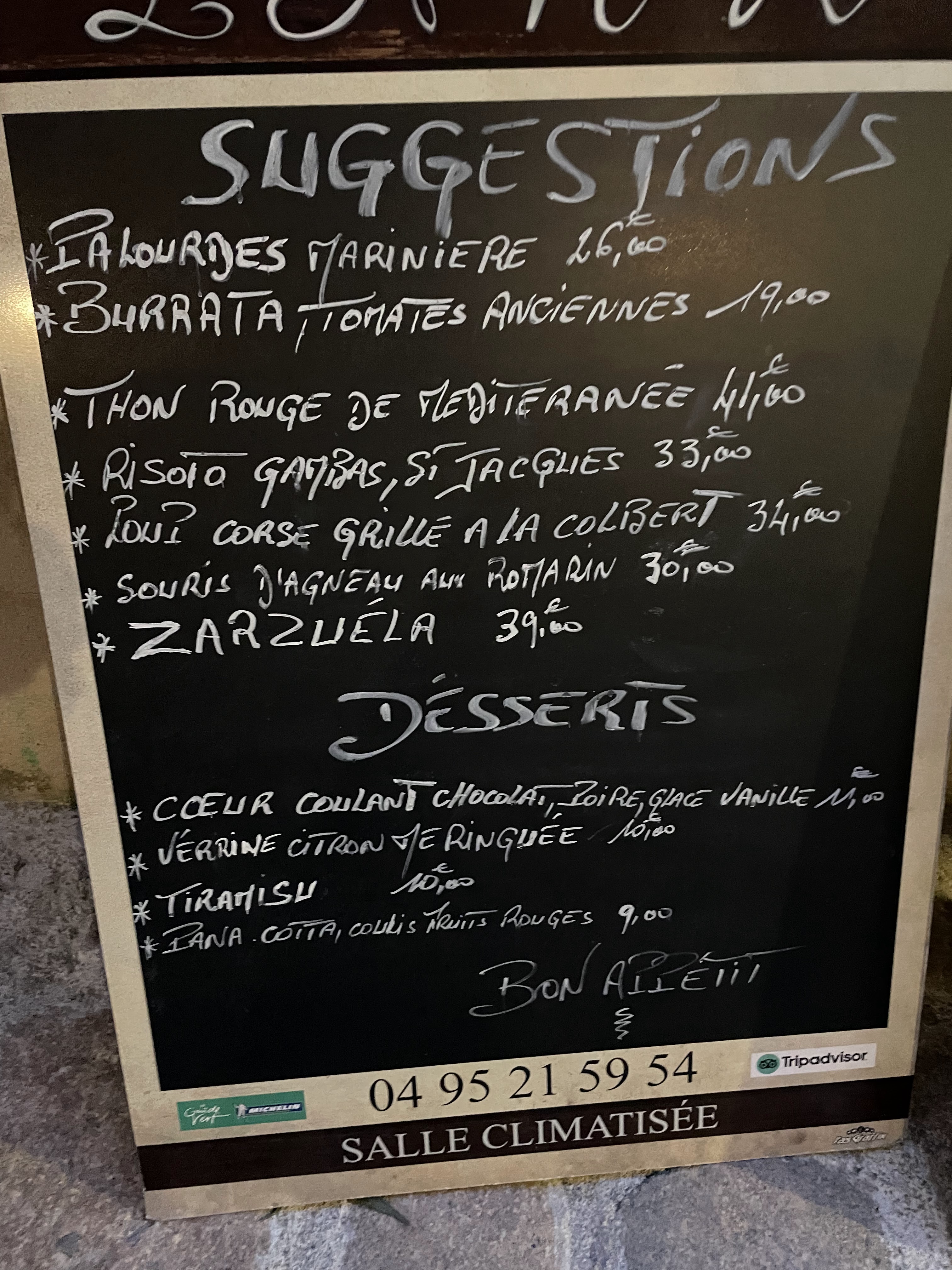 Nous sommes le 26 septembre 2022 il est 20h et nous nous promenons dans les ruelles atypiques de la citadelle de Bonifacio. Au détour de l’une d’elles, nous tombons sur une scène digne d’un théâtre de rue. Max (qui fait tout sauf la cuisine) en plein milieu de la ruelle était en pleine présentation des plats que propose le restaurant. Ses tirades énonçant chaque composition de plats nous mettaient déjà l’eau à la bouche. Nous avons donc demandé à nous installer. Sa répartie et son efficacité tout au long du repas a été un enchantement. Les plats sont superbement dressés et les produits de belle qualité. Vous ne serez pas déçu et le guide Gault&Millau ne s’y est pas trompé non plus au vue du nombre d’années où le restaurant y a été cité. Très belle ambiance sympa. Très belle découverte pour nous. Vous me direz : « Pourquoi pas les 5 étoiles alors …? » Je vous répondrai juste que je laisse de la place pour les restaurants étoilés 😉 Donc allez-y, allez-y, allez-y !! Vous ne le regretterez pas un instant. Merci Max La K 🙂