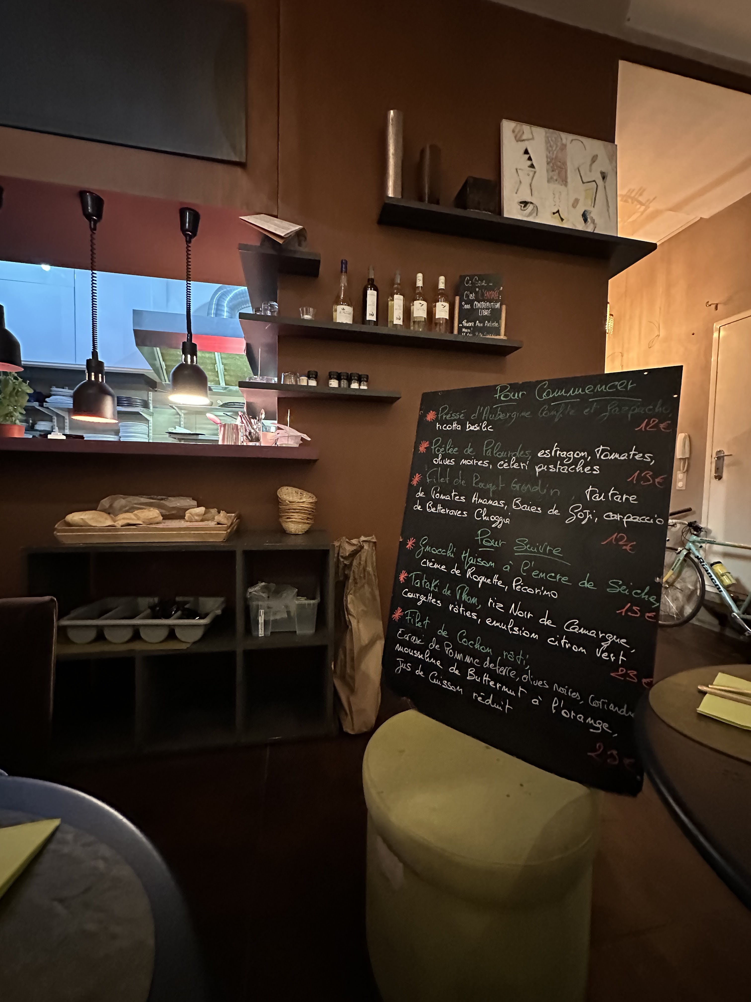 3-4 entrées et plats du jour proposés sur l’ardoise, tout était excellent, frais et créatif. D’octobre à mai, c’est aussi une salle de concerts jazz et manouche dans la belle cave voûtée