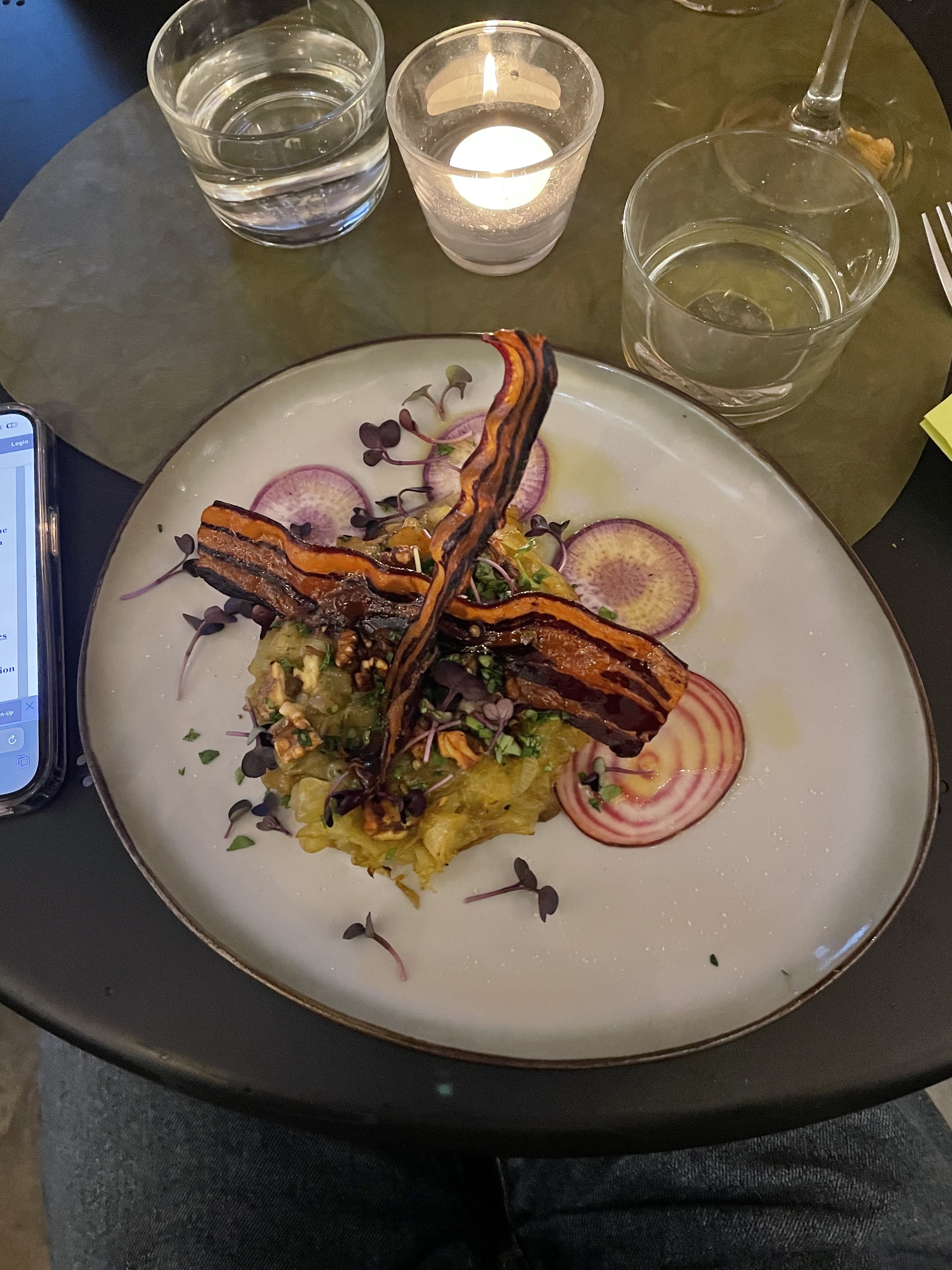 le chef m'a préparé la plus belle assiette végétarienne hors menu. le service était également merveilleux; excellentes recommandations de vins. j'ai hâte de revenir.