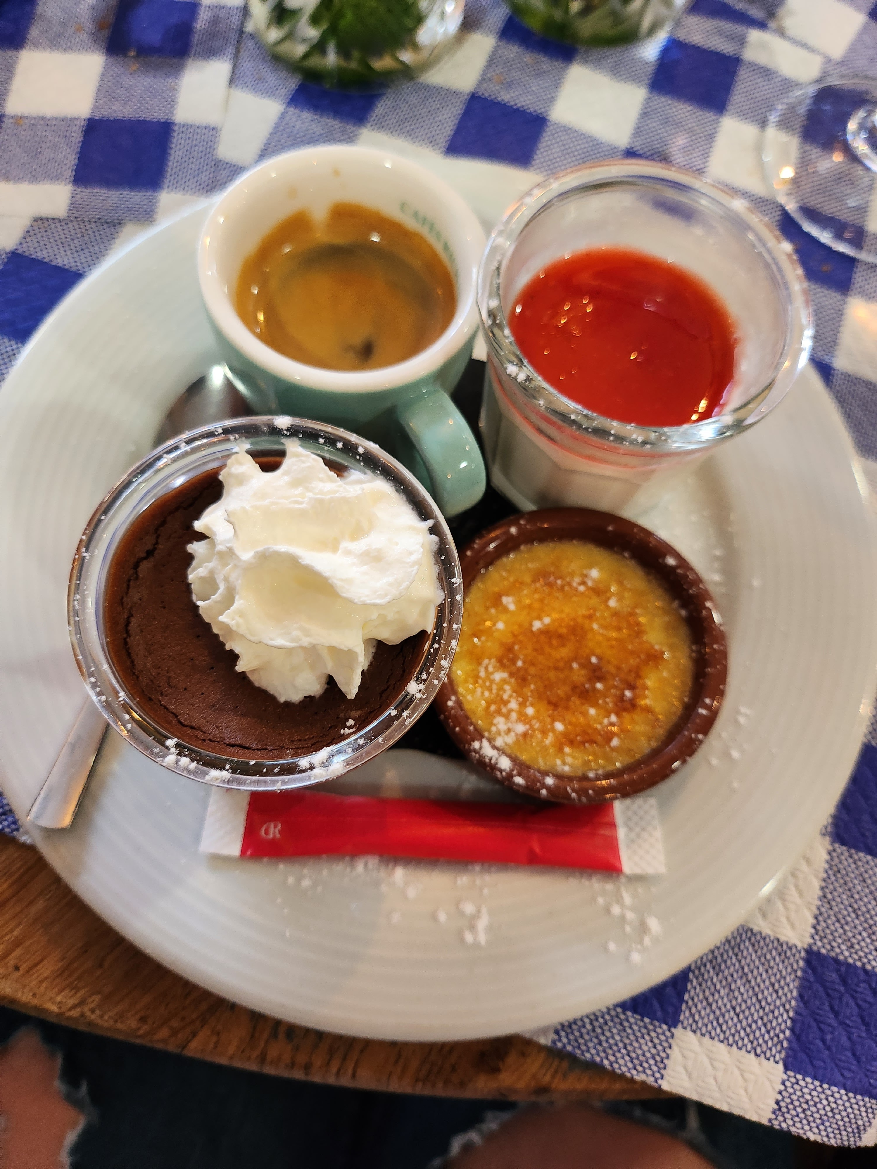 Ce n'est pas une belle expérience depuis le début. Nous étions en 2 et nous devions rester proches de 2 autres personnes (la table était à 5 cm de distance). Pas de problème, c'était une personne sympa mais le restaurant était plein à 20 % et de 7h30 à 21h00, il reste le même. Lorsque nous sommes arrivés pour la première fois, la dame à proximité vient de rentrer avec sa salade en disant que ce n'était pas sur mon test. Nous avons fait la même chose avec le Foie Gras. Le candar était plus bien cuit et je demande un médium rare. Mais ils ont de bons desserts préparés🫣. La côte des boissons est plus que la nourriture. presque 🫡.