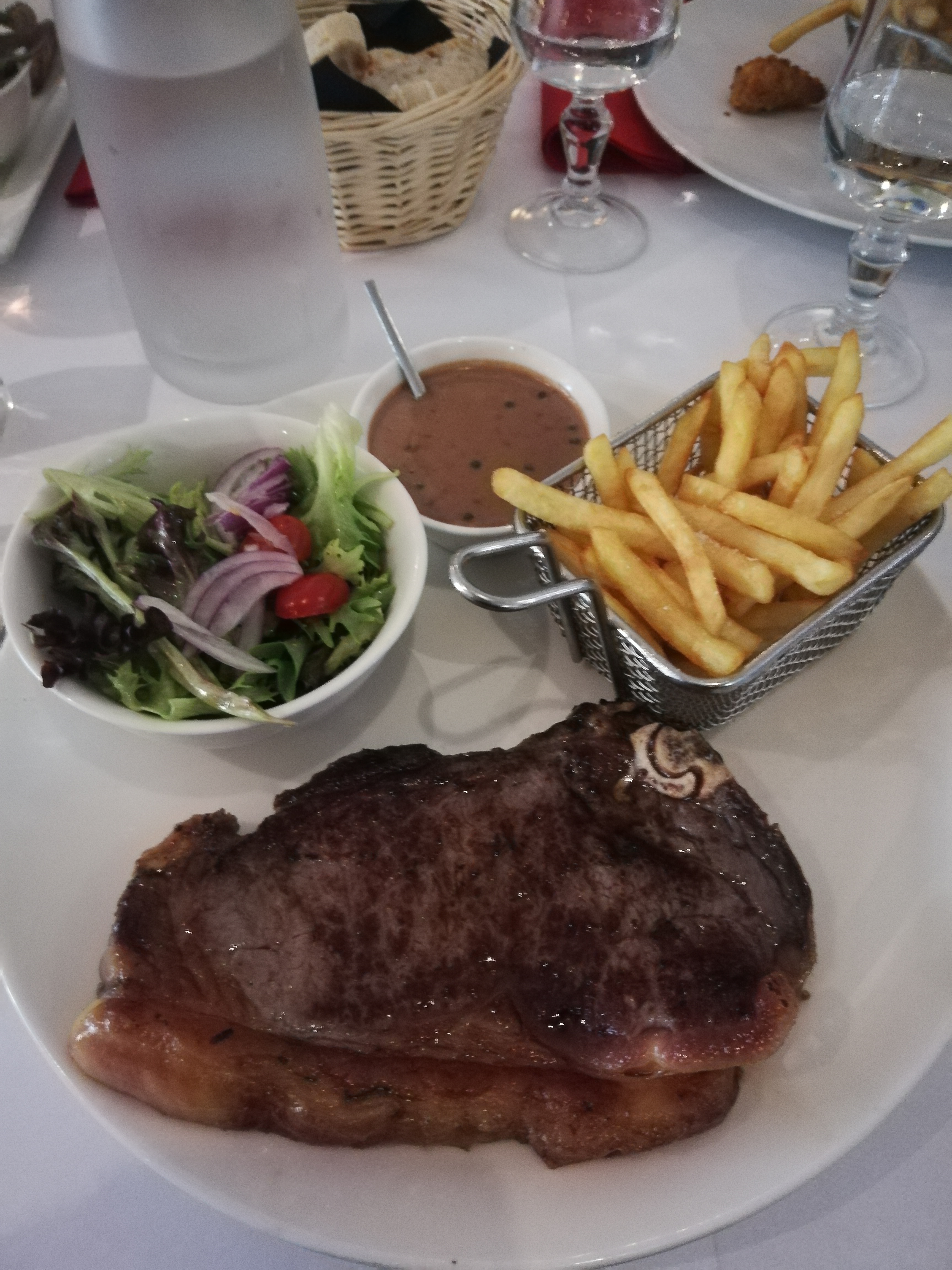 Bonsoir, On a commandé 2 entrecôtes de boeuf une a point et une saignante, les 2 étaient saignantes puis une des entrecôtes, on a manger que la moitié car trop de nerfs donc pour moi qui je suis un grand amateur de boeuf c’était la pire viande que j’ai mangé de ma vie. Puis on a commandé 2 dessert un il était très très bon le deuxième une crème brûlée qui était du liquide immangeable, la serveuse nous la offert. La chance, toute façon on l’aurais pas payé.