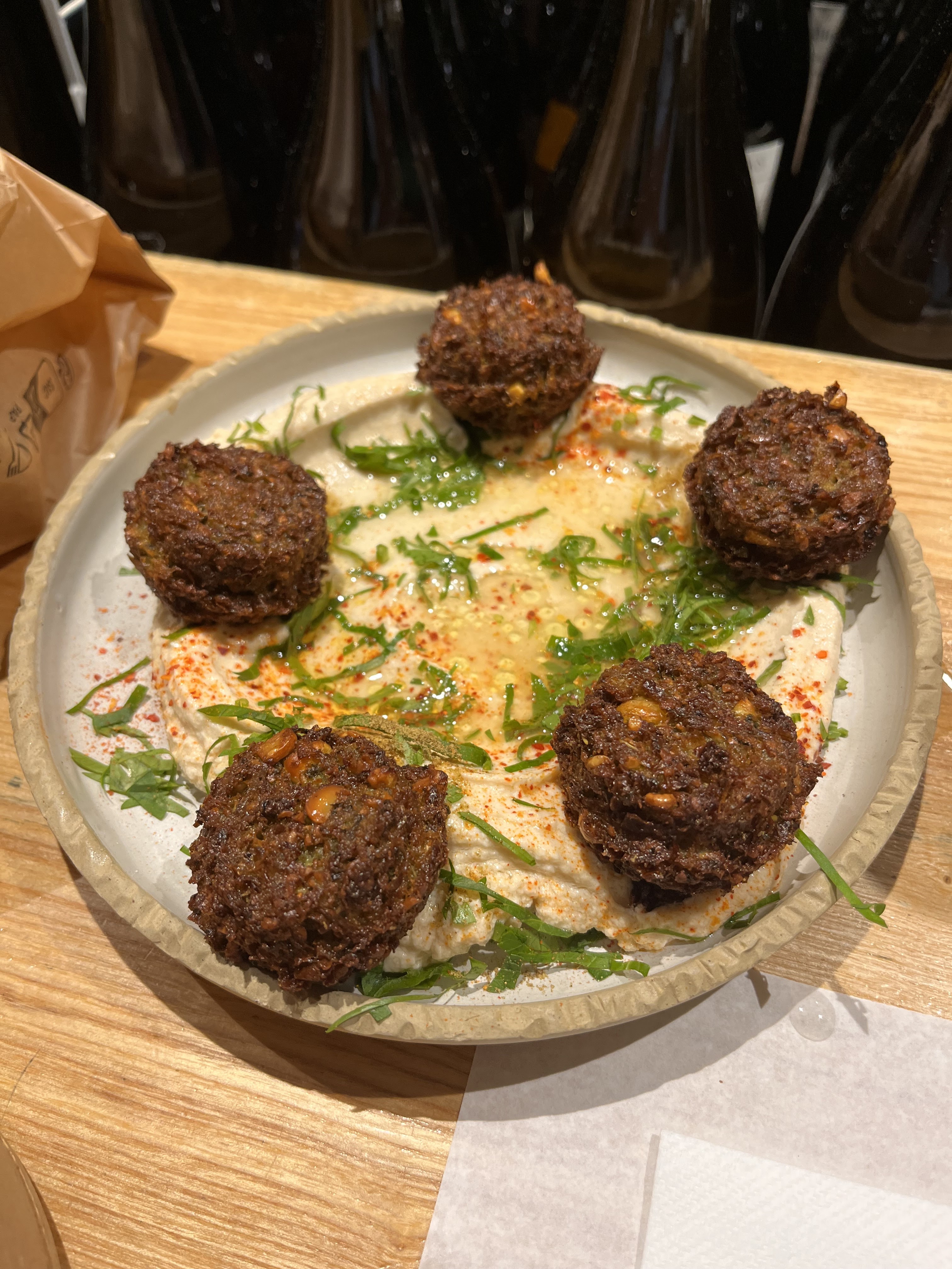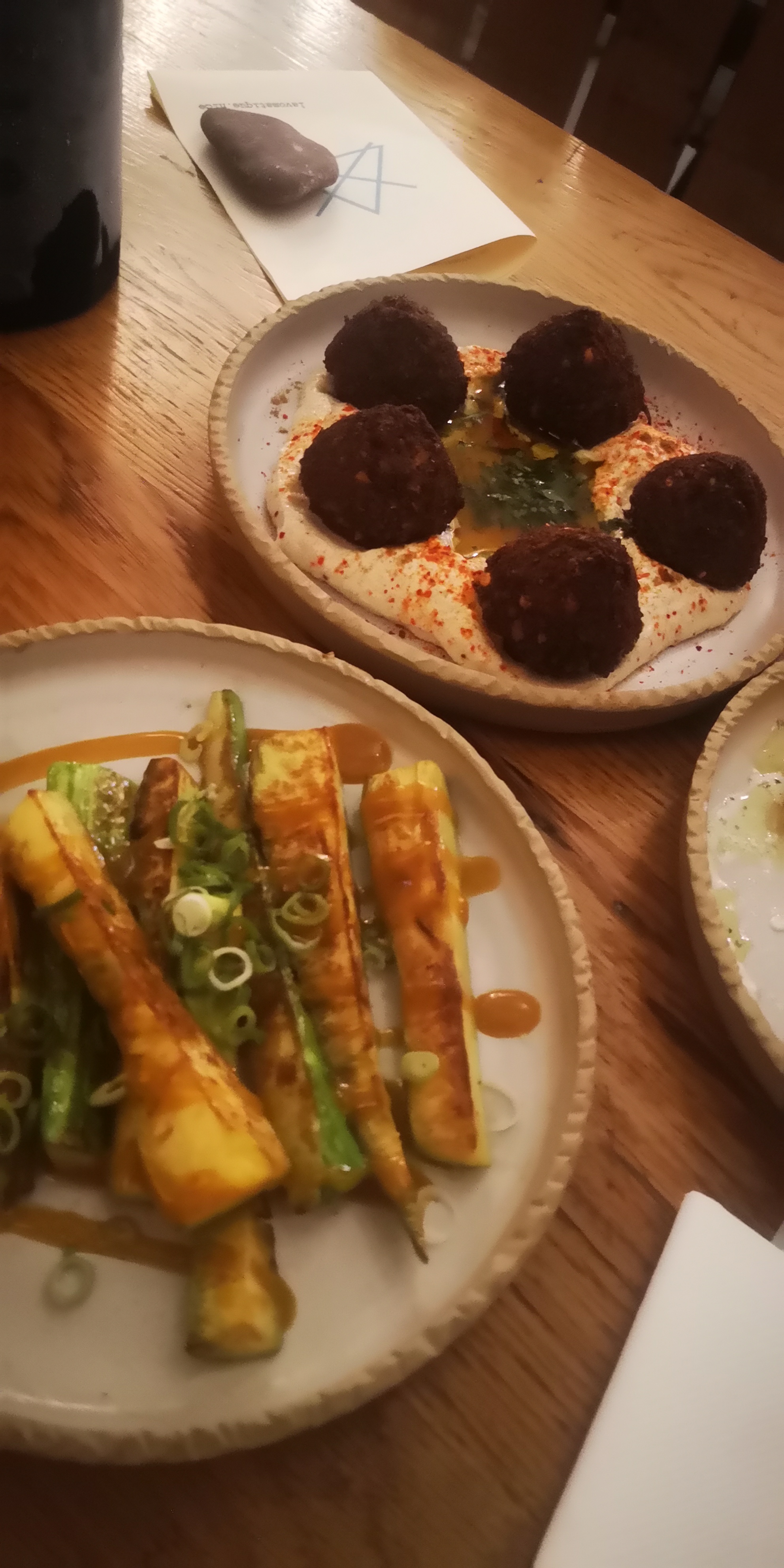 Encore une fois , quelle belle soirée ! Les falafels qui vous font traverser la Méditerranée, les ribs de cochon sauce sucre salé , le poulpe cuit à merveille, arrosé de super canon ( traduction = bonnes bouteilles de vins ) on dit merci Greg et Hugo .