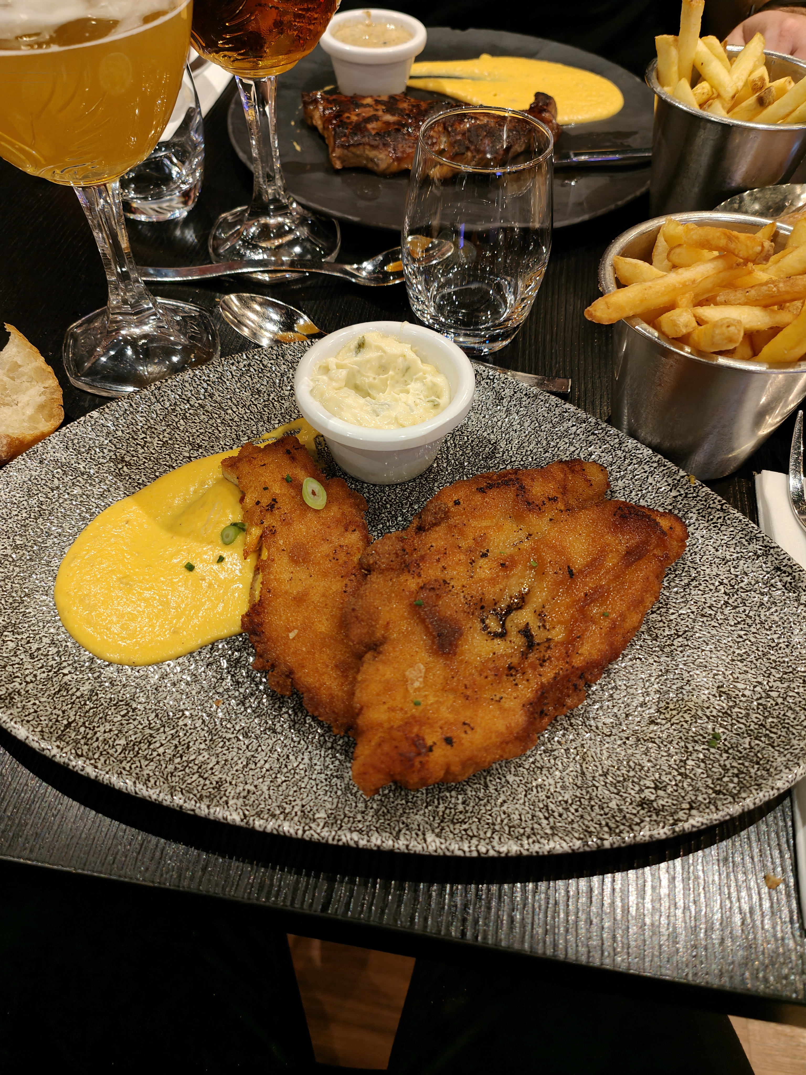 Dîner en amoureux un mercredi soir, peu de monde dans le resto. En entrée carpaccio et oeuf parfait aux asperges, à suivre une bavette sauce café de Paris (superbe) et une cote de veau. Le tout très bon, servi rapidement et sympathiquement. Je recommande
