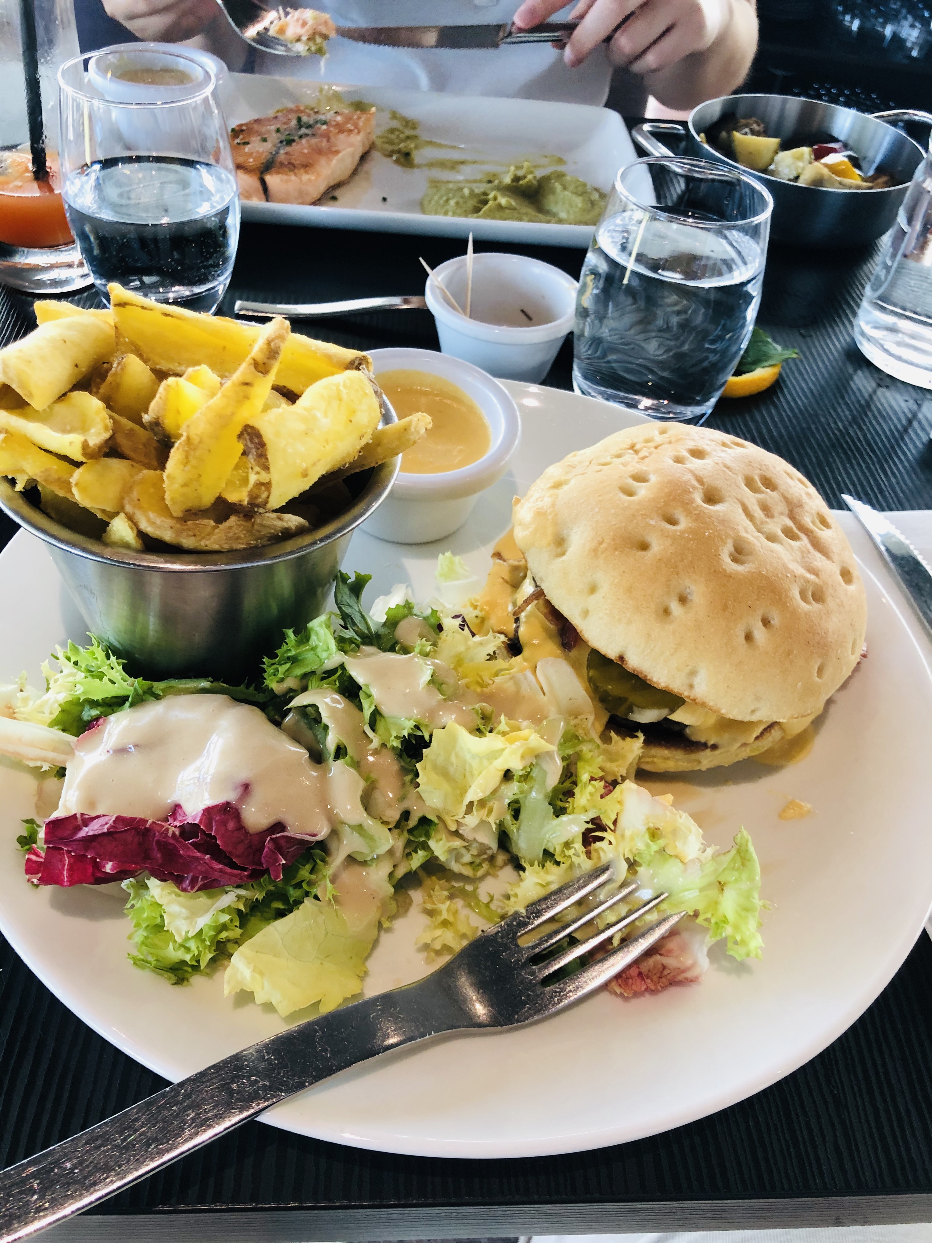 Je suis allé dans ce restaurant pour un repas professionnel, seul un soir. Je suis venu car il y avait pas d'autres restaurants disponibles. J'ai mangé un.burger a 21,95€ ce qui est selon moi très cher pour un burger. Certes il était bon mais trop cher pour un simple burger. J'ai l'impression que l'on paie un brasserie huppé juste à côté de la Suisse et rien d'autre. Je dois retourner dans le coin pour le travail, je n'y retournerai pas. JE NE RECOMMANDE PAS CETTE ÉTABLISSEMENT