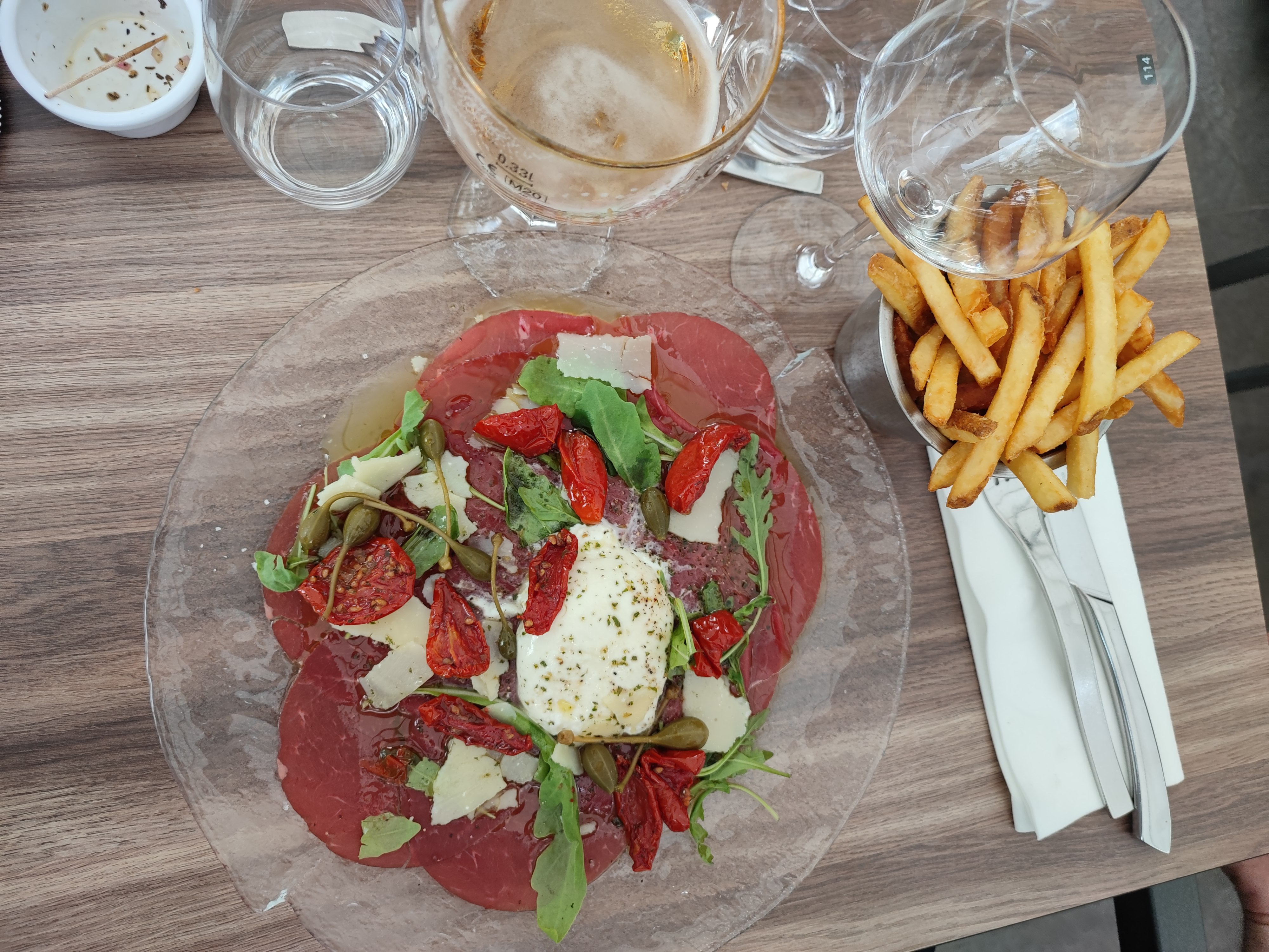 J'ai eu mon entrée avec l'apéro ! J'ai commandé un tartare de bœuf comme précisé par la serveuse coupé au couteau. Un tartare avec de la mayo quel horreur. Je pense que cette brasserie nous donne beaucoup de produit surgelé. Le prix 85.00 pour manger des produits décongelé sa reste pour moi très cher.