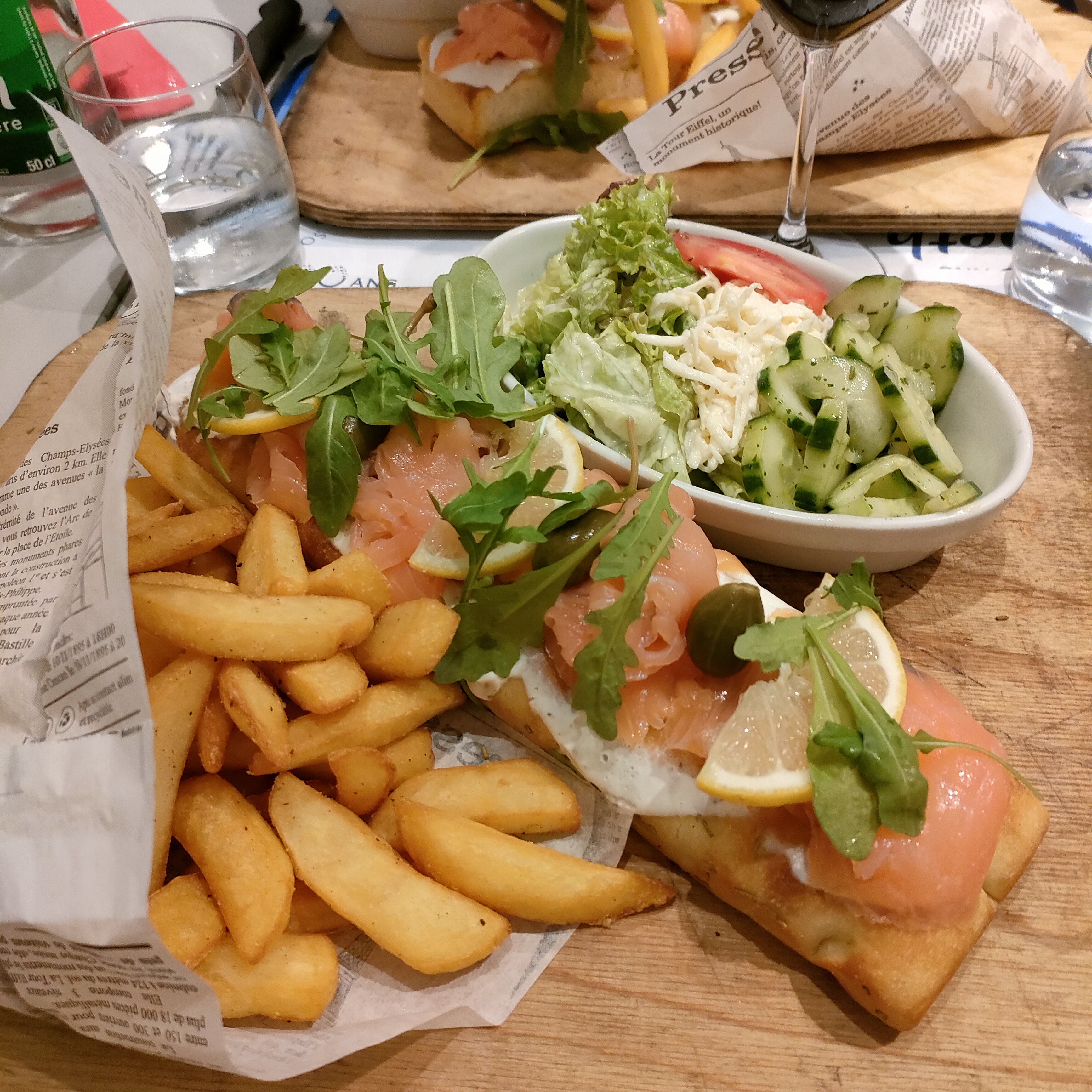 Déçue des tartines... Le pain était bon mais beaucoup trop simple et sans saveur. La première avait juste quatre tomates et de la mozza beaucoup directement dessus sans sauce. Et le jambon cru également qui n'avait pas trop de goût. La deuxième tartine était déjà un peu plus travaillée avec un mélange de poivrons marinés et d'aubergine. Mais sans plus. De plus, en rentrant chez moi je remarque que le serveur ne m'avait pas rendu toute ma monnaie. Plus de 2 euros, j'aurais dû vérifier 😩😩😩