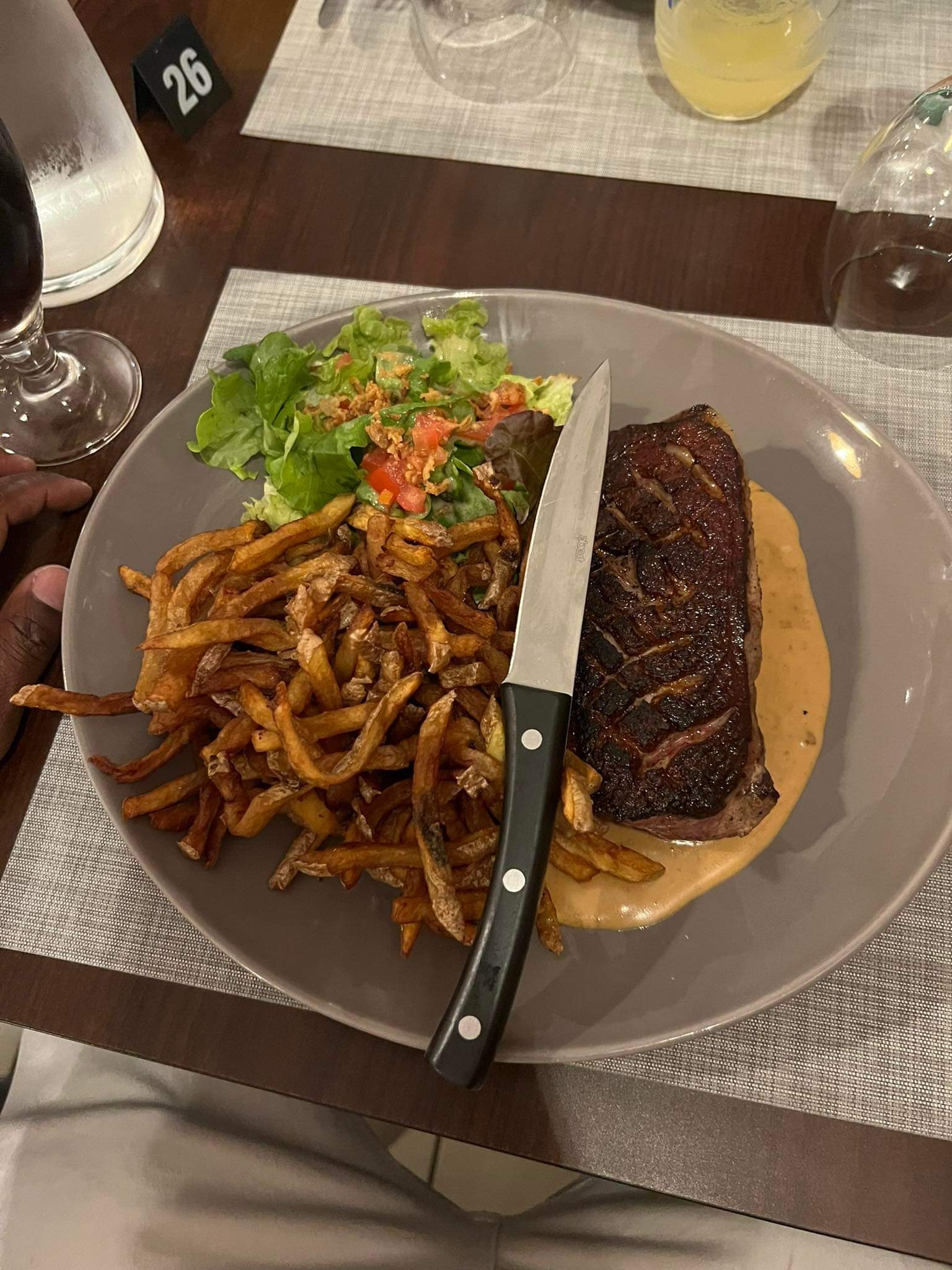 Très bonnes frites et viande très tendre et savoureuse mais il faudrait préciser qu'il y a une sauce aux champignons sur le pavé de rumsteack car cela peut donner auprès du client de mauvaises surprises. Le banofee et chocolat liégeois sont excellents. La chantilly servie est maison et absolument délicieuse. Je recommande ce restaurant.