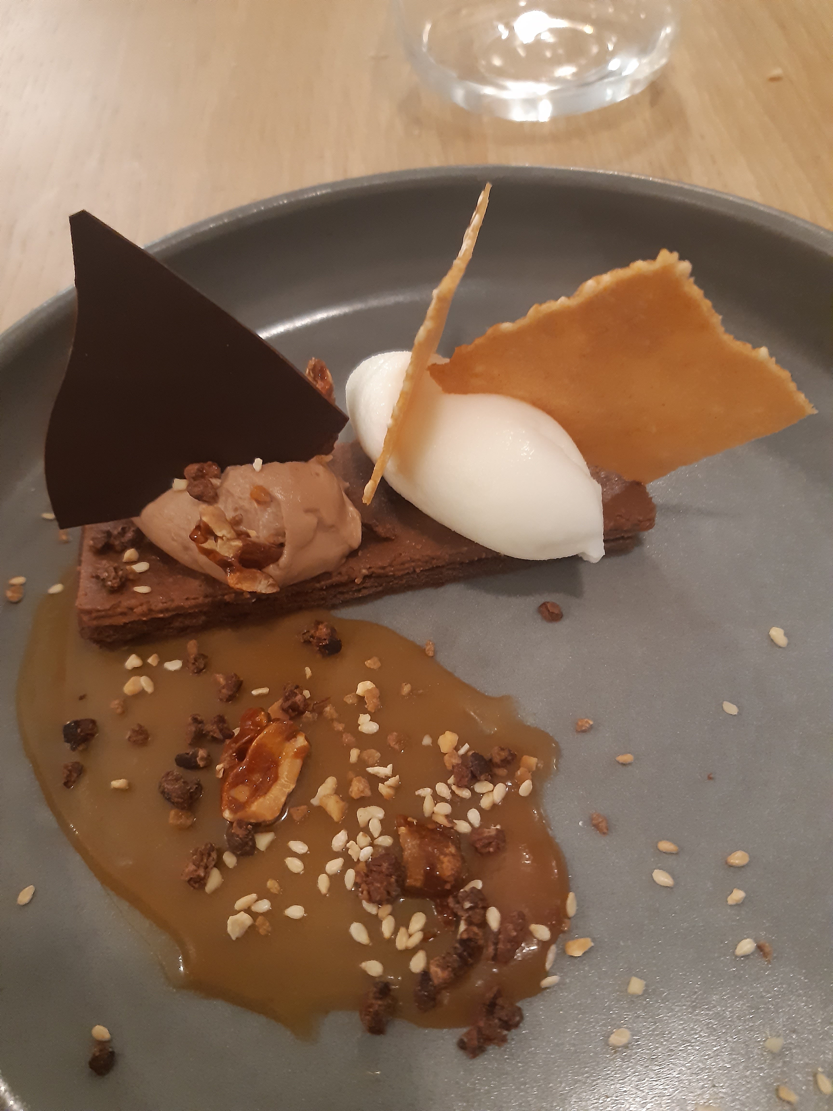 En voyant l'extérieur du restaurant on pourrait s'attendre à une salle beaucoup plus cosy pour un samedi soir. En réalité la salle est spacieuse et ressemble à une décoration de restaurant d'hôtel qui serait parfaite pour des déjeuner d'affaires. Le service est rapide. Le tarif est cher 32 Euros un plat avec quatre coquilles saint Jacques, même si elles sont bien cuisinées. Le dessert espuma de chocolat avec au fond de l'assiette une ganache et au dessus un sorbet au citron, très facile à reproduire chez soi, rien d'exceptionnel.