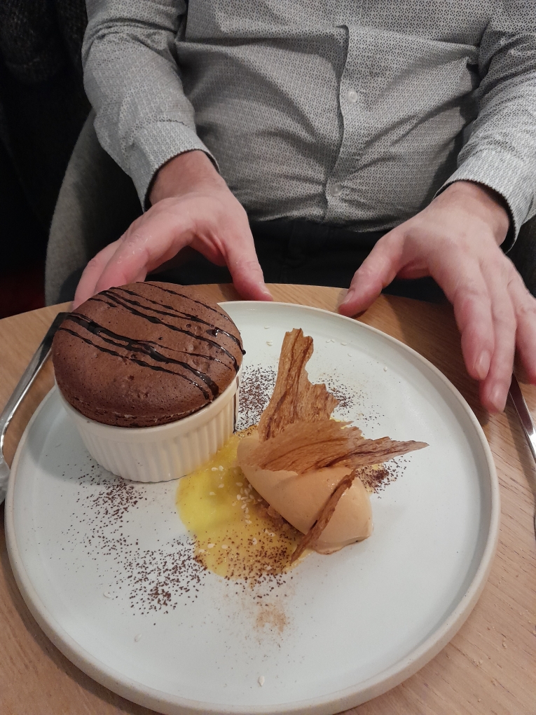 De mon côté j’ai très bien mangé, filet de bœuf sauce poivrade et ses petits légumes excellent, en revanche les Saint Jacques manquaient de saveurs différentes, le soufflé au chocolat était délicieux, je suis très satisfaite de la soirée même si je partage certains avis de la grande salle un peu froide et du manque de confort des banquettes . Côté service je suis un peu déçue de l’amabilité de certains serveurs. Le repas reste cependant cher pour y aller régulièrement, dommage.