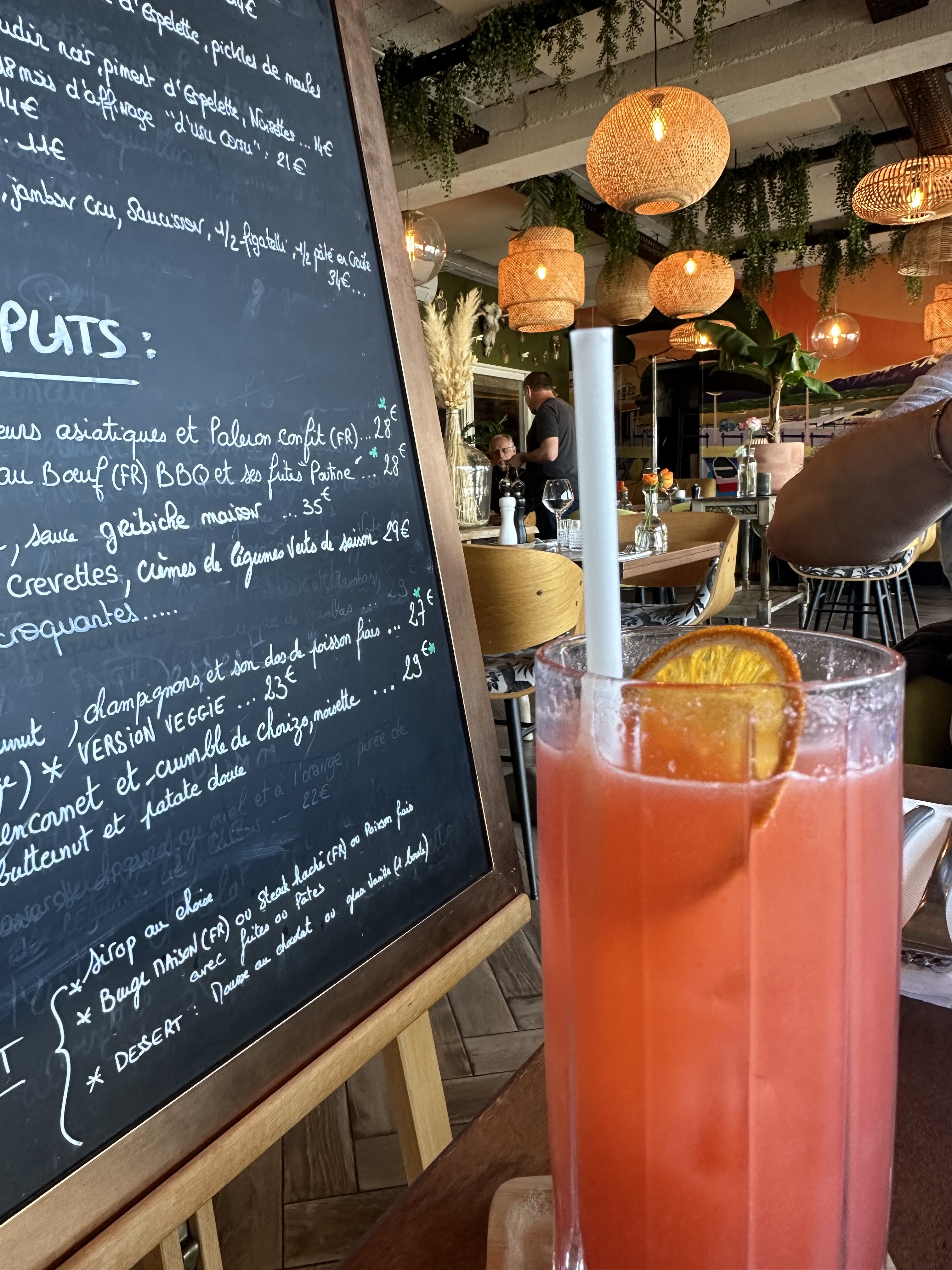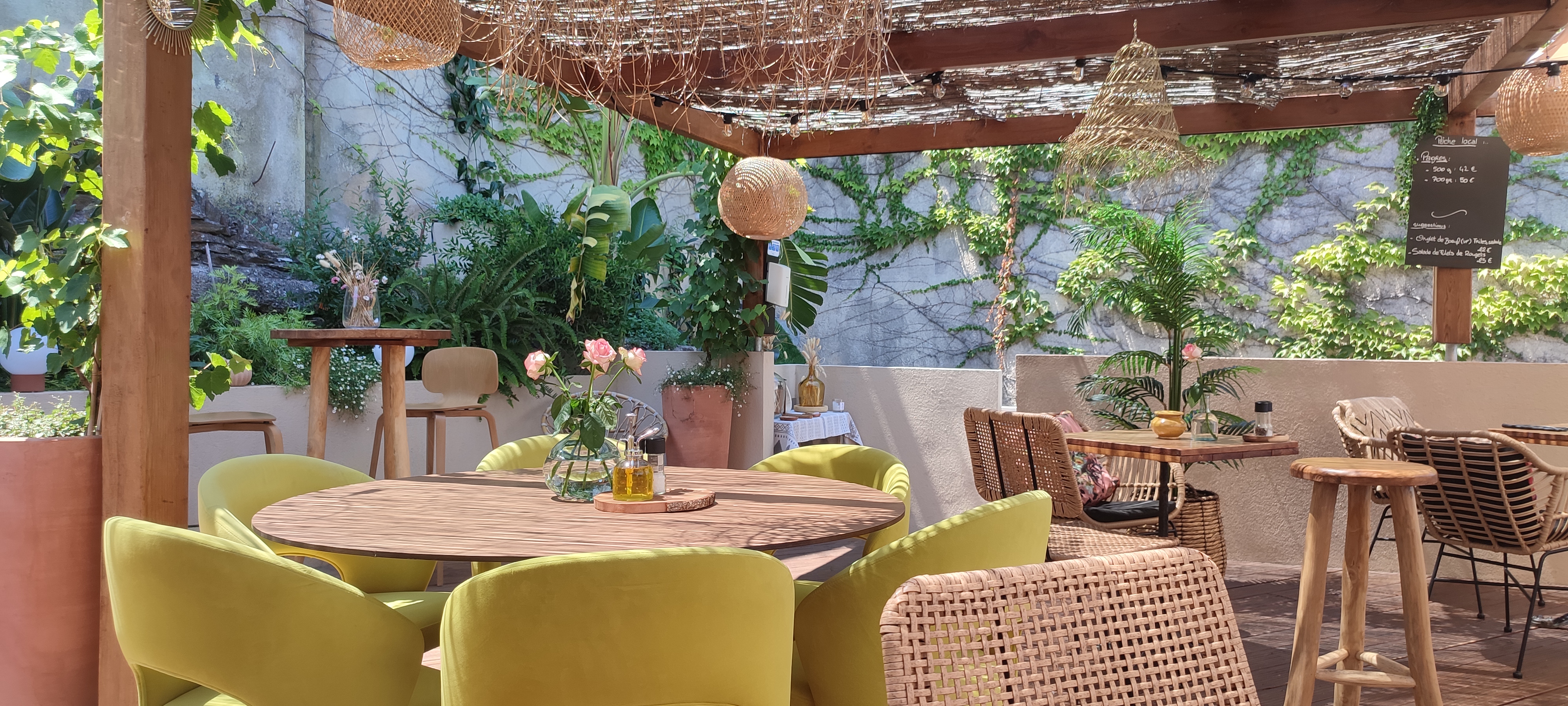 Cadre superbe du toit terrasse, déco bohème recherchée et réfléchie , ambiance tropicale , repas à la hauteur du cadre, très bons poissons aussi bien la dorade , que la seiche , glaces très originales locales , le parfum thé à La menthe très surprenante , le café gourmand beau et bon , et le serveur très sympathique , je ne trouve rien à améliorer , juste à garder ce niveau et le souci du détail bravo !!! Je recommande +++