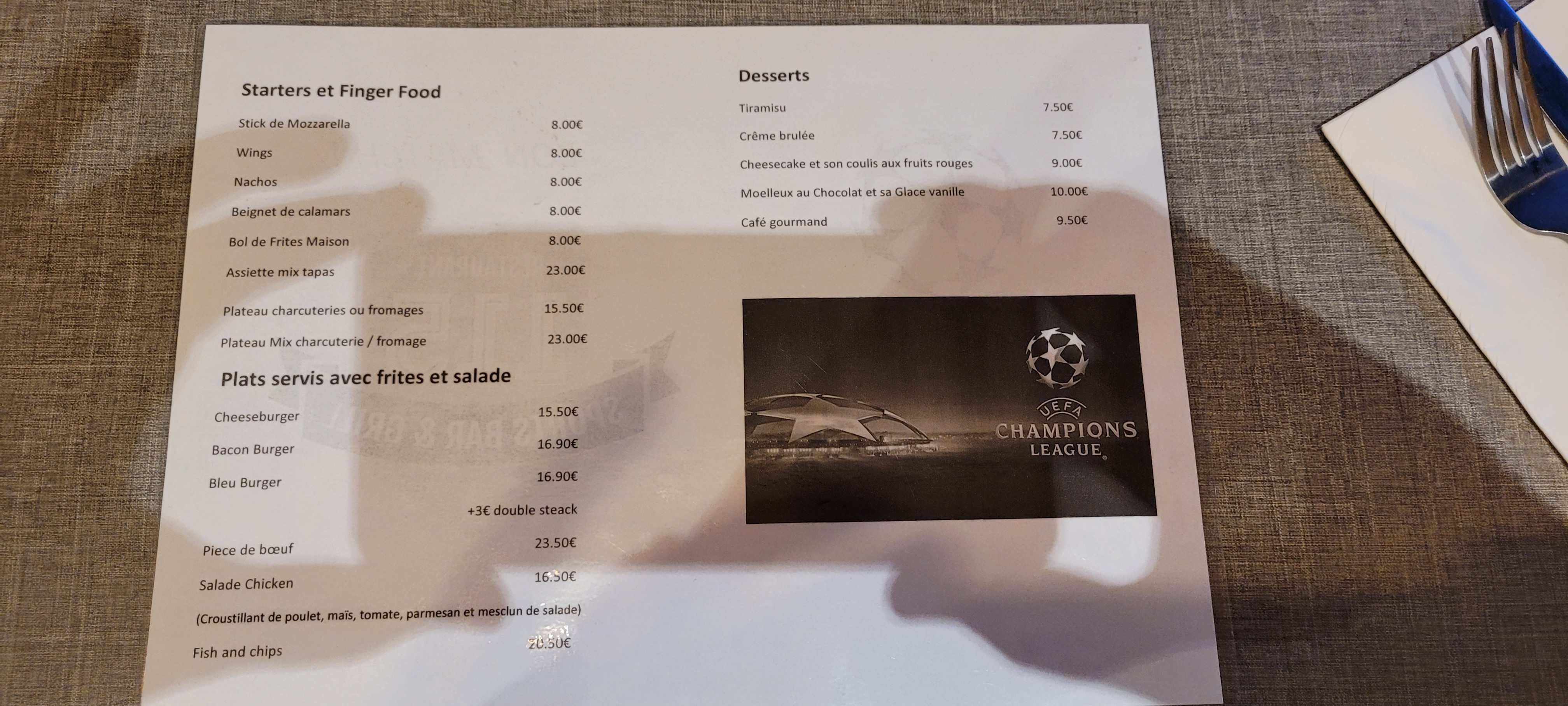 Pour regarder le Foot c'est très bien. Mais pour la nourriture, passez votre chemin ! 16,90 € un burger avec un petit steak, bien moins large que le pain du burger... Le burger est assez fade... C'est cher pour ce que c'est ! Les desserts sont également chers. 10 € un moelleux... Sinon c'est sympa pour prendre un verre en terrasse... Dommage...