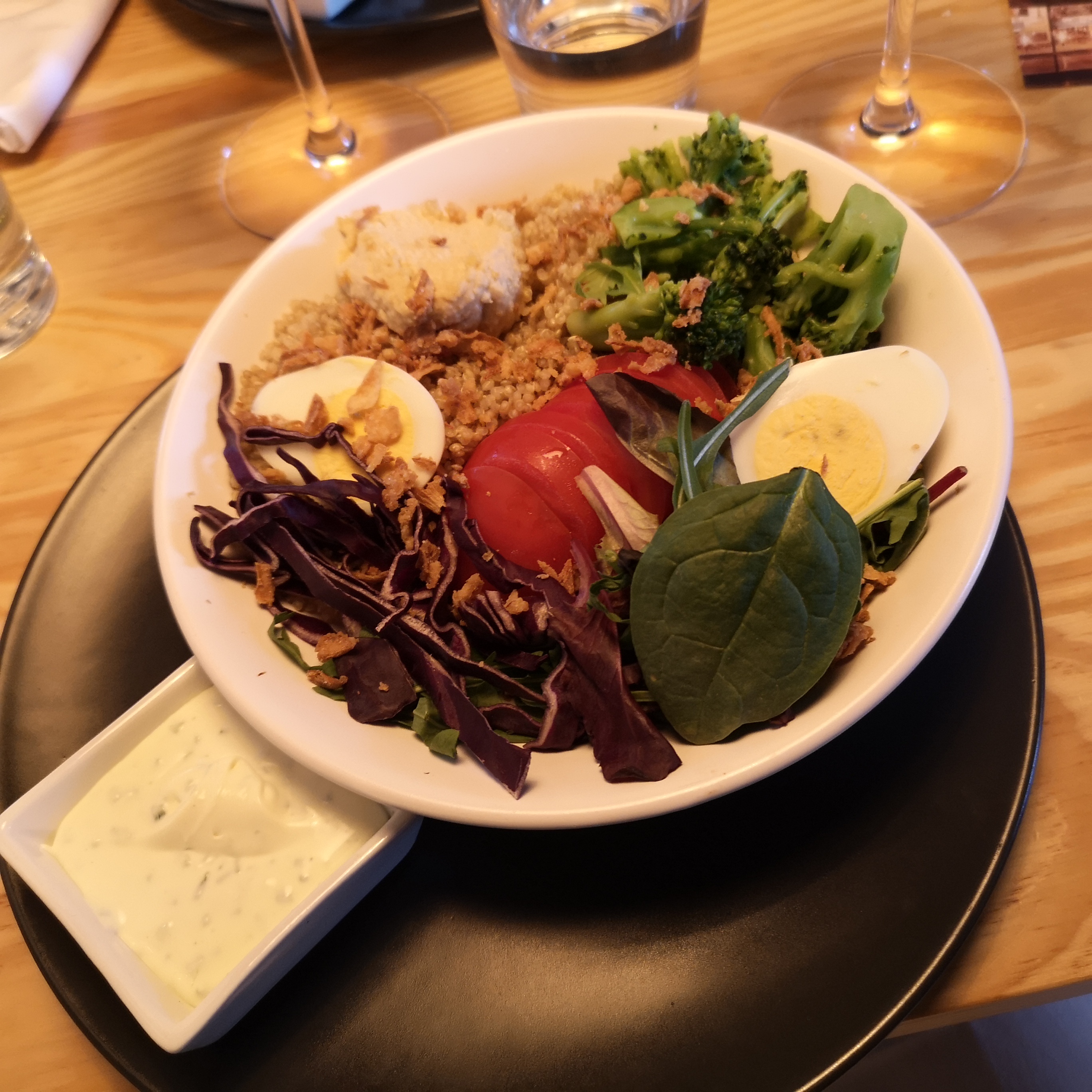 Accueil sympa, terrasse aussi mais bémol rapport qualité/prix sur ce que j'ai commandé (d'autres personnes très contentes de leur repas) : le mojito est chargé en glaçons (trop) donc peu de goût ; la bowl chèvre pas très copieuse donc 14,90€ est très excessif ! Et enfin café gourmand avec 3 très petites pâtisseries type bouchée (industrielles pour certaines) + 1 mini boule de glace En revanche les burgers au pain au charbon avaient l'air copieux et bons, la dorade (poisson du jour) était très belle et les profiteroles sont ÉNORMES....mais un peu cher pour ce que c'est