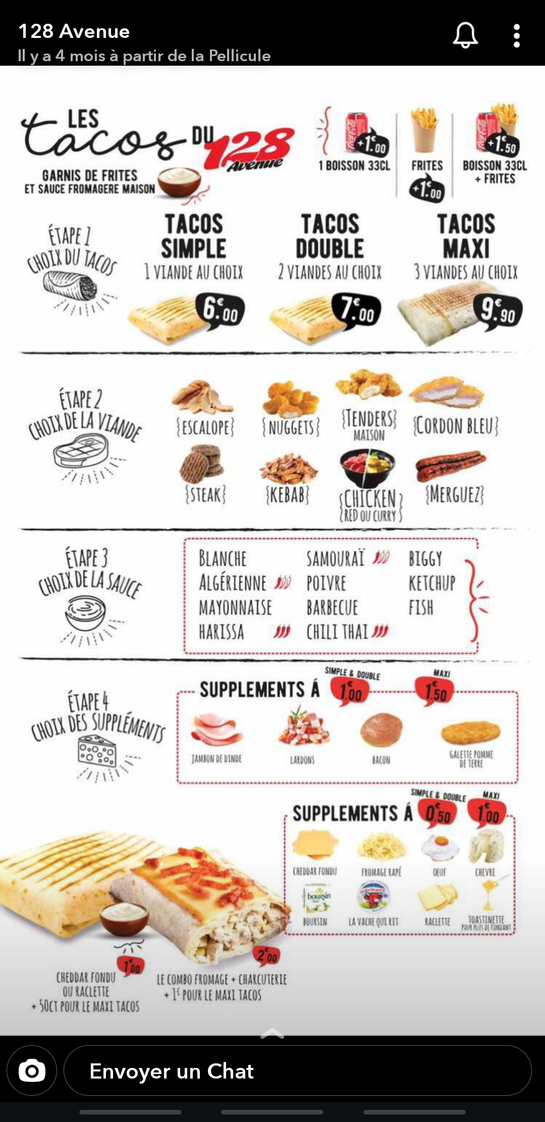 Bon mais tout le temps la même chose sauces dans les tacos et hamburger pas beaucoups voir inexistante pourtant sa fait déjà plusieurs fois que j'y mange et arrive froid mais pas tout le temps je n y retournerais plus jamais sa m'écœure a force et trop cher a chaque fois rebonjour suite a votre commentaire justement j'ai était honnête je suis toujours honnête et oui sa a aussi a voir avec le panini même si je ne ai pas préciser en premier et j'ai pris vos offres a chaque fois donc accepter mes critiques et mes premières critiques avait rien à voir avec le panini et des oublie dans les commandes des fois et aussi pas le stock a temps et aussi ont est accusé que c'est de notre faute quand ils se trompe de commandes alors que c'est juste de leur faute à eux et que c'est eux qui se trompe c'est juste à eux de faire leur travail correctement et en plus ils font payer le déplacement quand sa sa arrive n'importe quoi vraiment