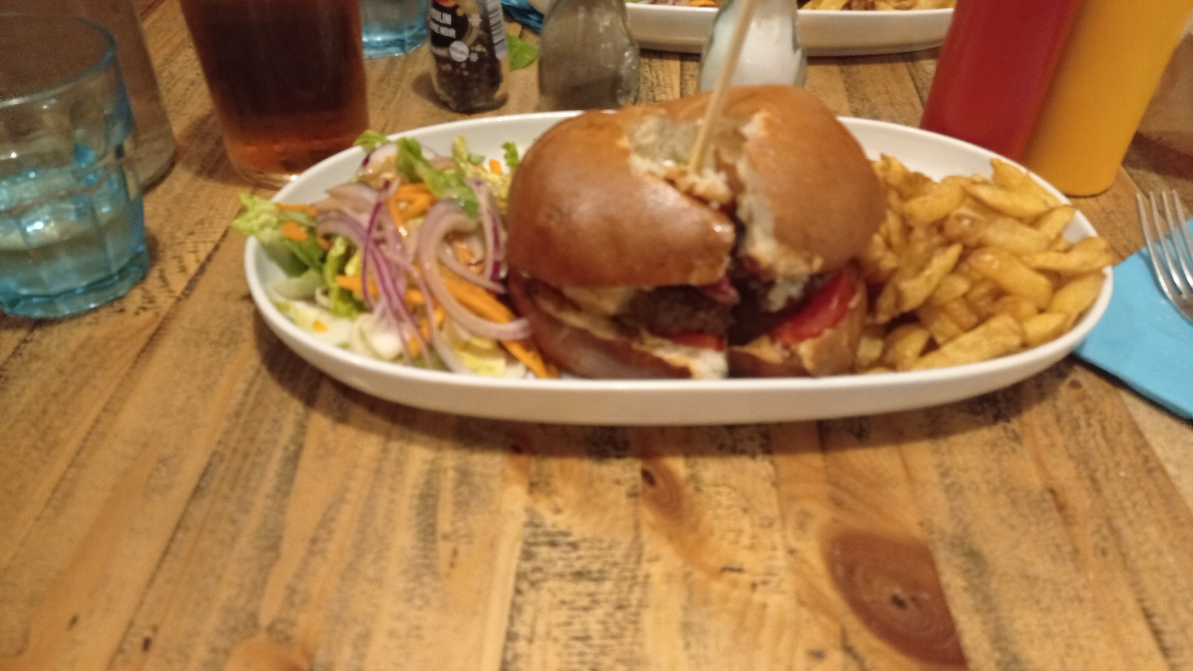 Le burger au saumon est très bon (c'est variable en vrai il était excellent 1 fois sur 2 il faut avoir de la chance) par contre la convivialité reste à revoir. Le serveur est antipathique et le service est lent.
