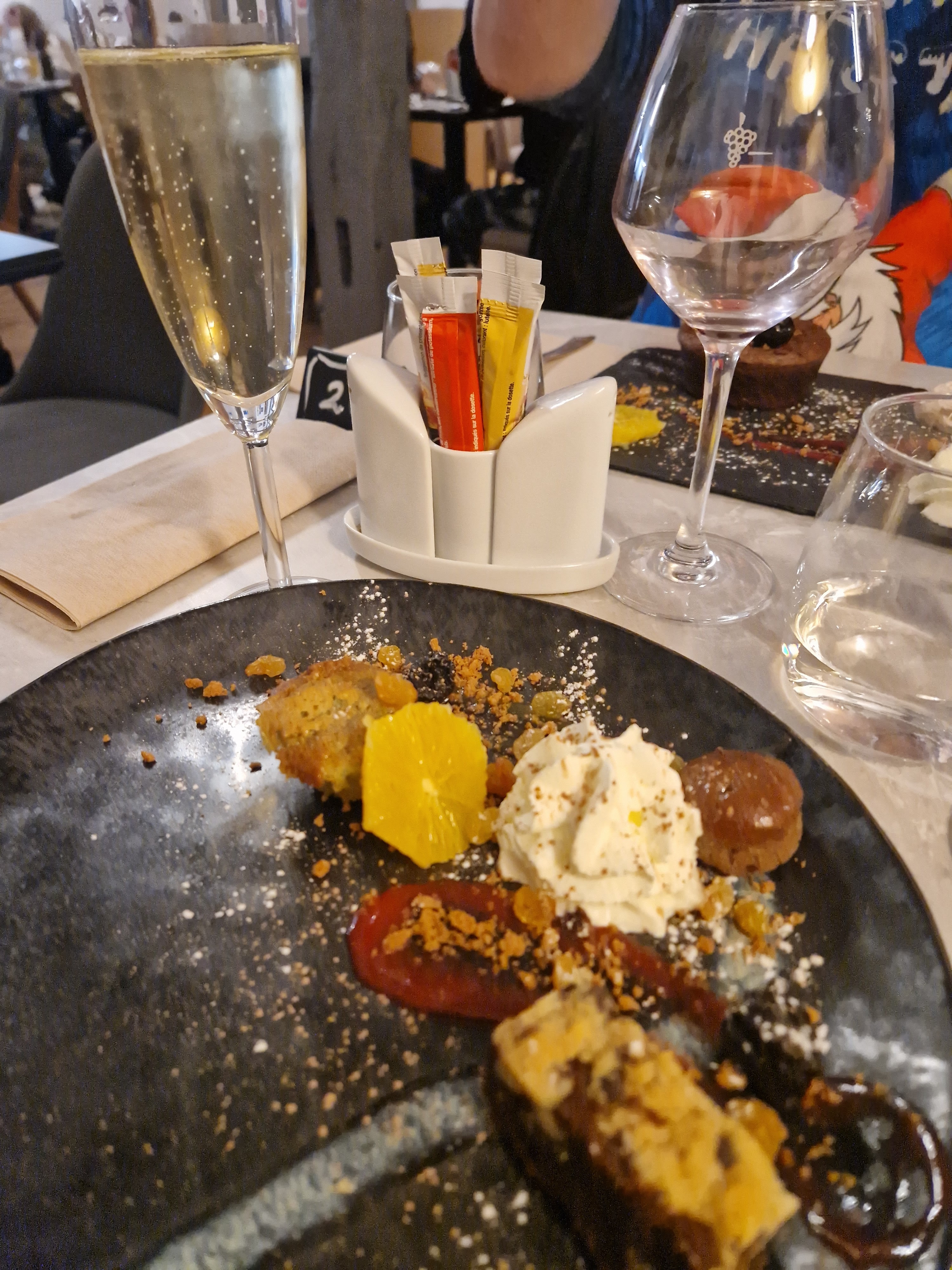 Petite escale dans la région. Serveur agréable mais seul pour gérer toute la salle, je le félicite!!! Du coup le service est trop long mais je ne le blâme pas. Nous avons apprécié nos plats avec un bon rapport qualité prix mais déçus par les desserts. Un tiramisu à l'ananas flambé au rhum à 8 euros, biscuit inexistant de même que le rhum😔. Pour le café gourmand à 9 euros, 2 mignardises : un petit financier pistache, un petit moelleux chocolat avec une demie tartelette tatin qui accompagnent mon café. Ca fait cher pour des desserts de cette qualité. A revoir.