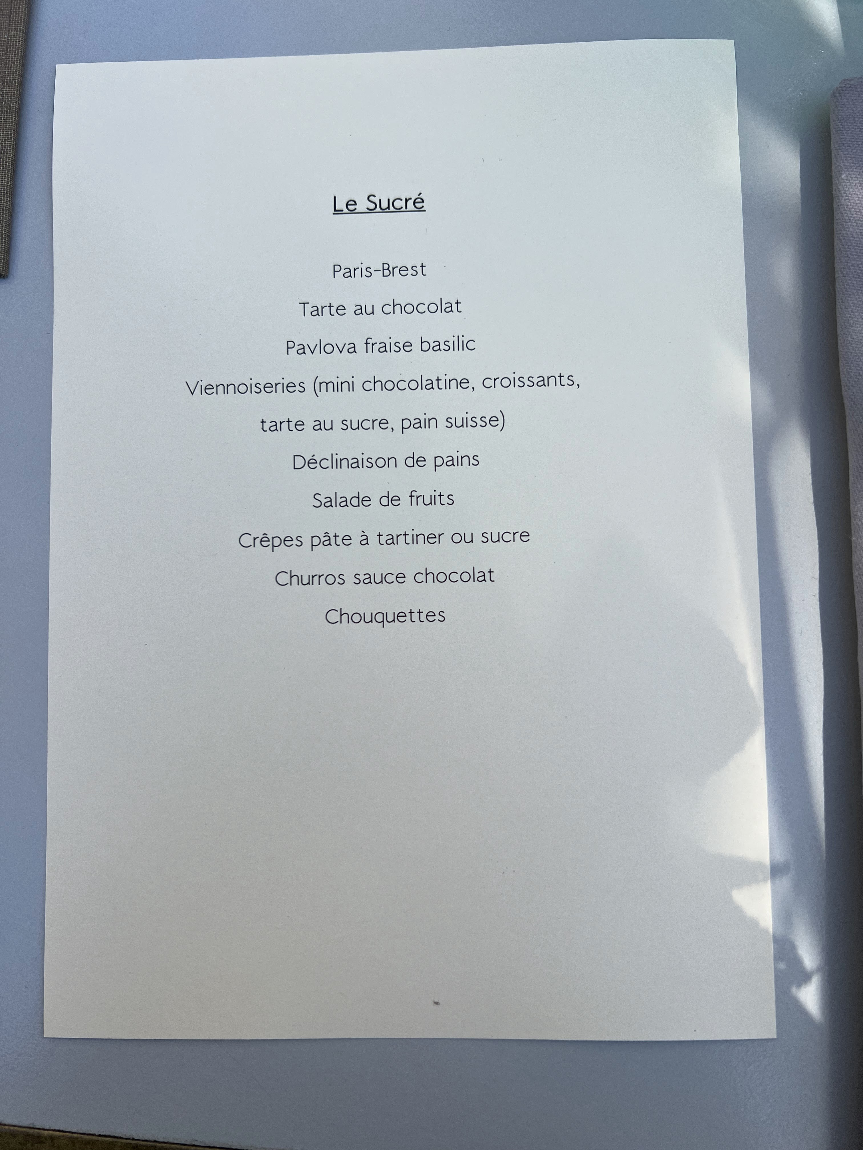 Publicité mensongère sur le site internet: pas de foie gras, pas de croque à la truffe ect. Vous ne trouverez que quelques charcuteries et fruits de mer, 4 desserts, dont des crêpes froides.a l’étage 3 sortes de viennoiseries, pas de laitage, ni confiture ni céréales. Pour le prix c’est très décevant !