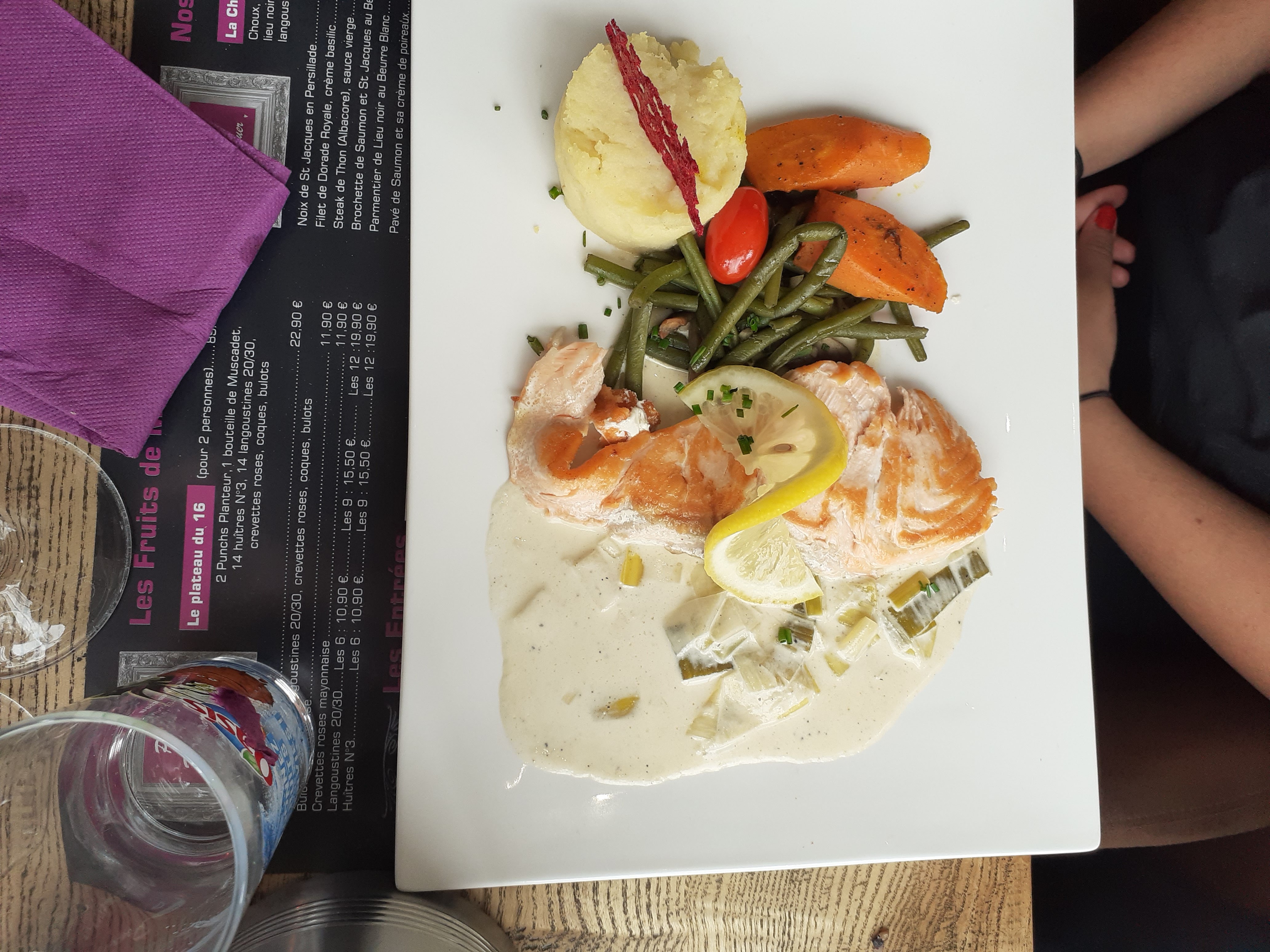 Personnel accueillant! Velouté de moules très bon. Le saumon avec les poireaux à la crème.. Saumon trop cuit, sec, très peu de poireaux et haricots verts et champignons qui n'étaient pas prévus dans le plat. Tiramisu qui avait le goût de crème et pas de tiramisu. Déçu...