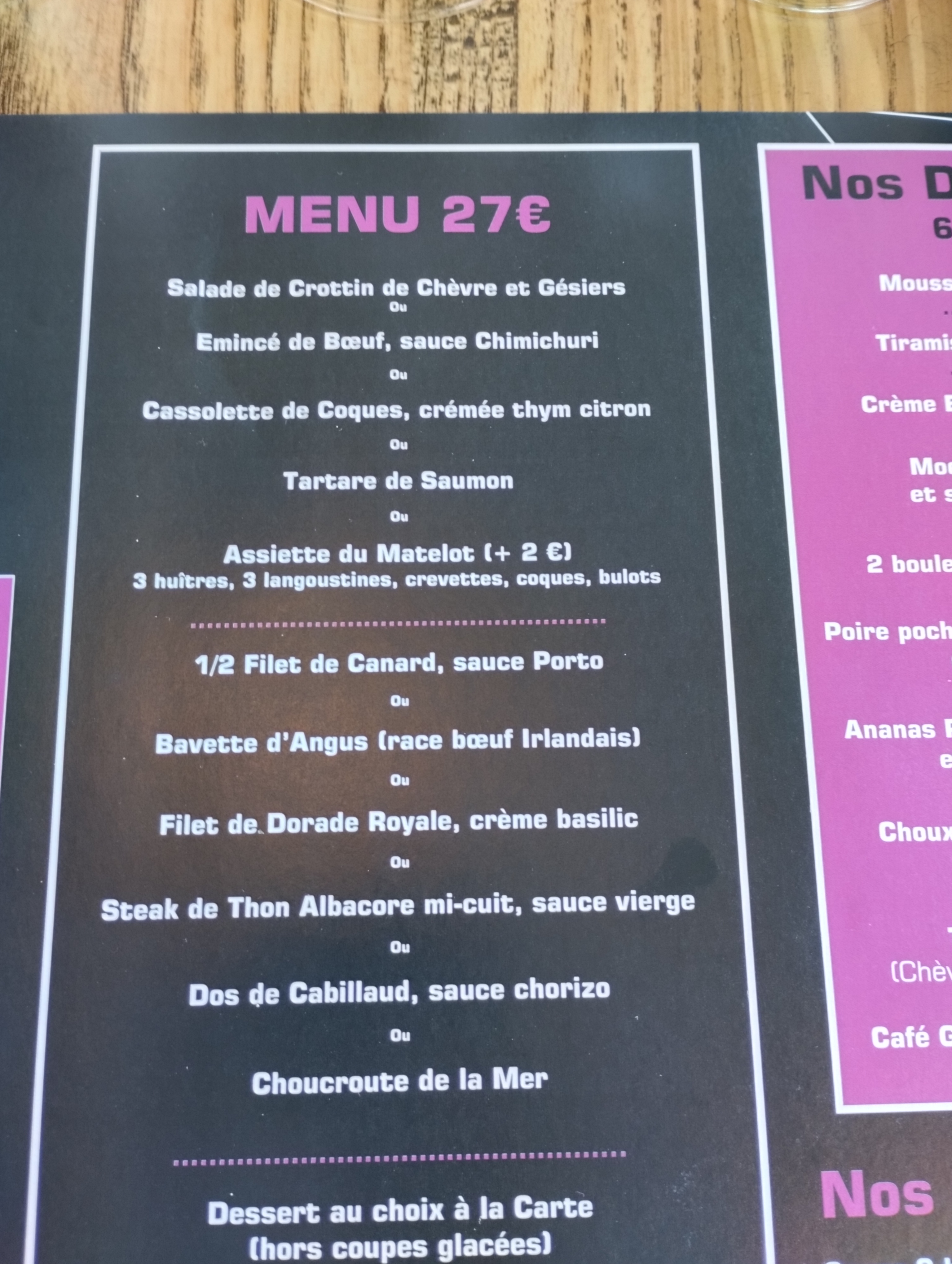 Erreur de prise de commande Prise d'une entrée à 15,90 et plat à 15,90 soit 31,80 a la carte alors que le menu est à 27 avec dessert.....On demande donc de rajouter le dessert et prendre le menu à 27 euros. Impossible car c'est déjà parti en cuisine alors que cela fait 2 minutes..... Ce qui est sûr, c'est que je ne reviendrai pas et surtout dans l'hiver lors des périodes creuses et je ne le conseillerais pas non plus à mes amis qui viennent nous voir aux Sables. La moindre des choses, c'est de prévenir. C'est typiquement le rôle d'une serveuse On ne regarde pas forcément les différentes formules.