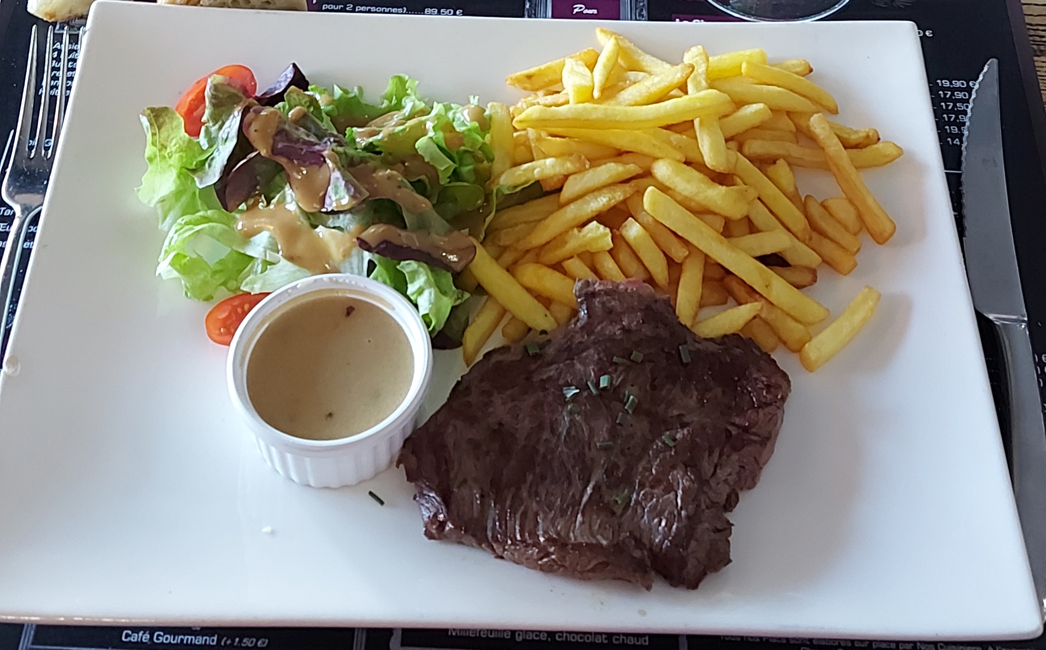 Bonne cuisine mais la sauce à l échalote était une sauce pour poisson et non pour viande. Frites pas maison quel dommage! La salade de chèvre, gésier était très bonne surtout avec la sauce tomate sous le chèvre. Service sympa. Je recommande