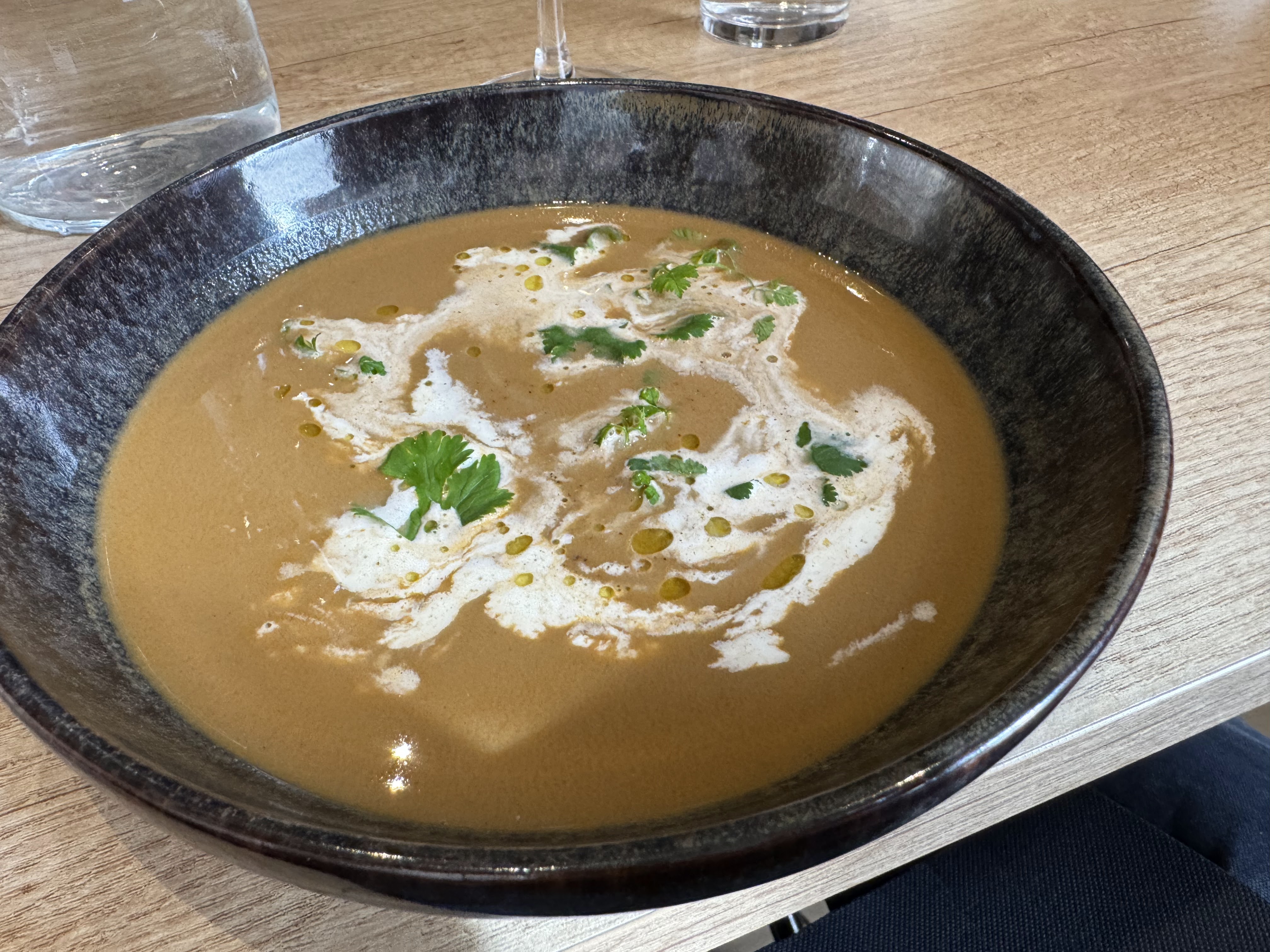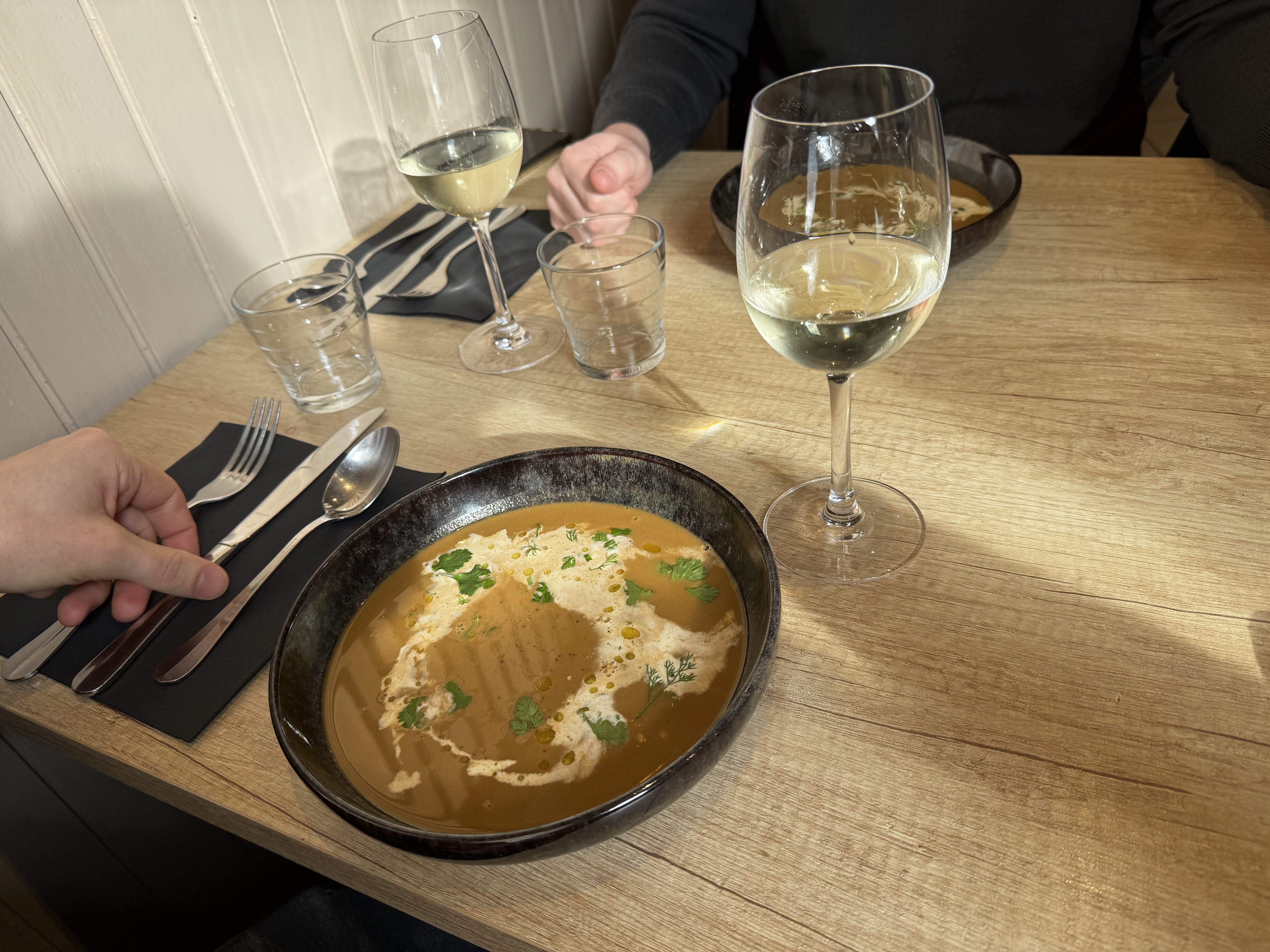 Excellente expérience tout autour pour le déjeuner. Un serveur et un copropriétaire ont apporté le menu du jour à l'ardoise qui ne proposait que 2 options : 3 plats (30 euros) ou 2 plats (25 euros), mais sinon tout était réglé. Le choix était dessert ou pas de dessert. La soupe, le plat principal et le dessert étaient à tomber par terre. La sélection de vins était réfléchie et juste. Il mérite tous les éloges qu’il reçoit et plus encore !
