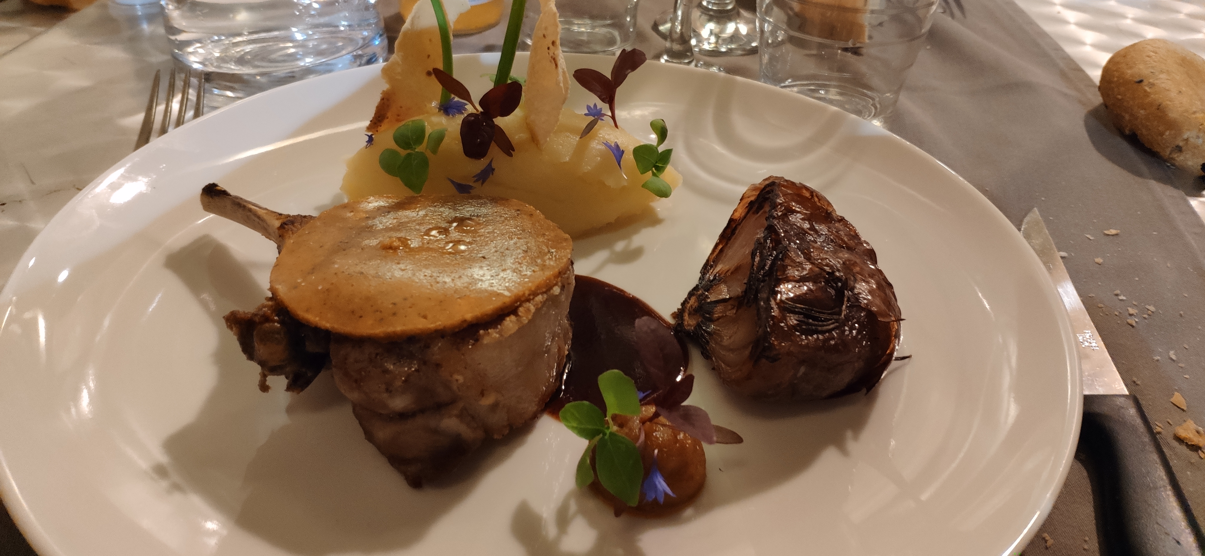 Très bon restaurant avec une carte qui change tous les jours et un menu entree-plat-desser à 29 € qui est selon moi abordable au vu de la qualité de la carte. Le cadre est très sympathique, calme, sous les arcs de l’ancienne cité médiévale. Seul bémol : les quantités étaient légèrement insuffisantes, ce qui nous a quelques peu laissés sur notre faim surtout au vu de la qualité gustative des plats.