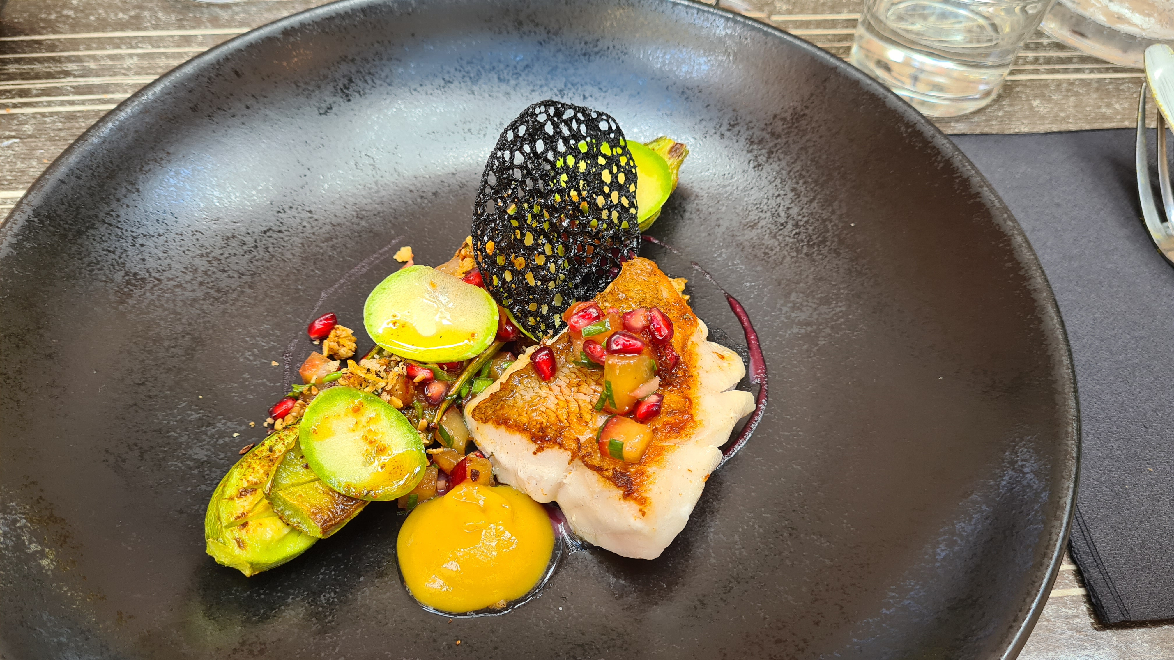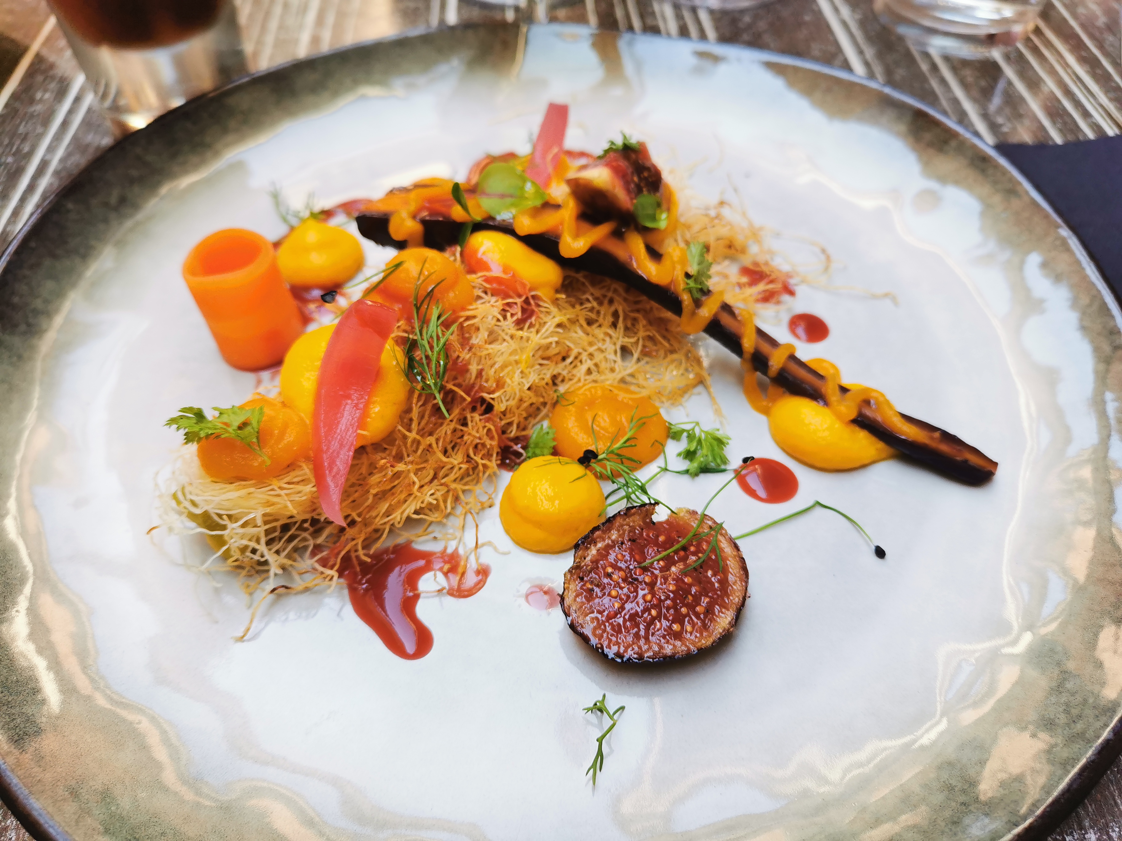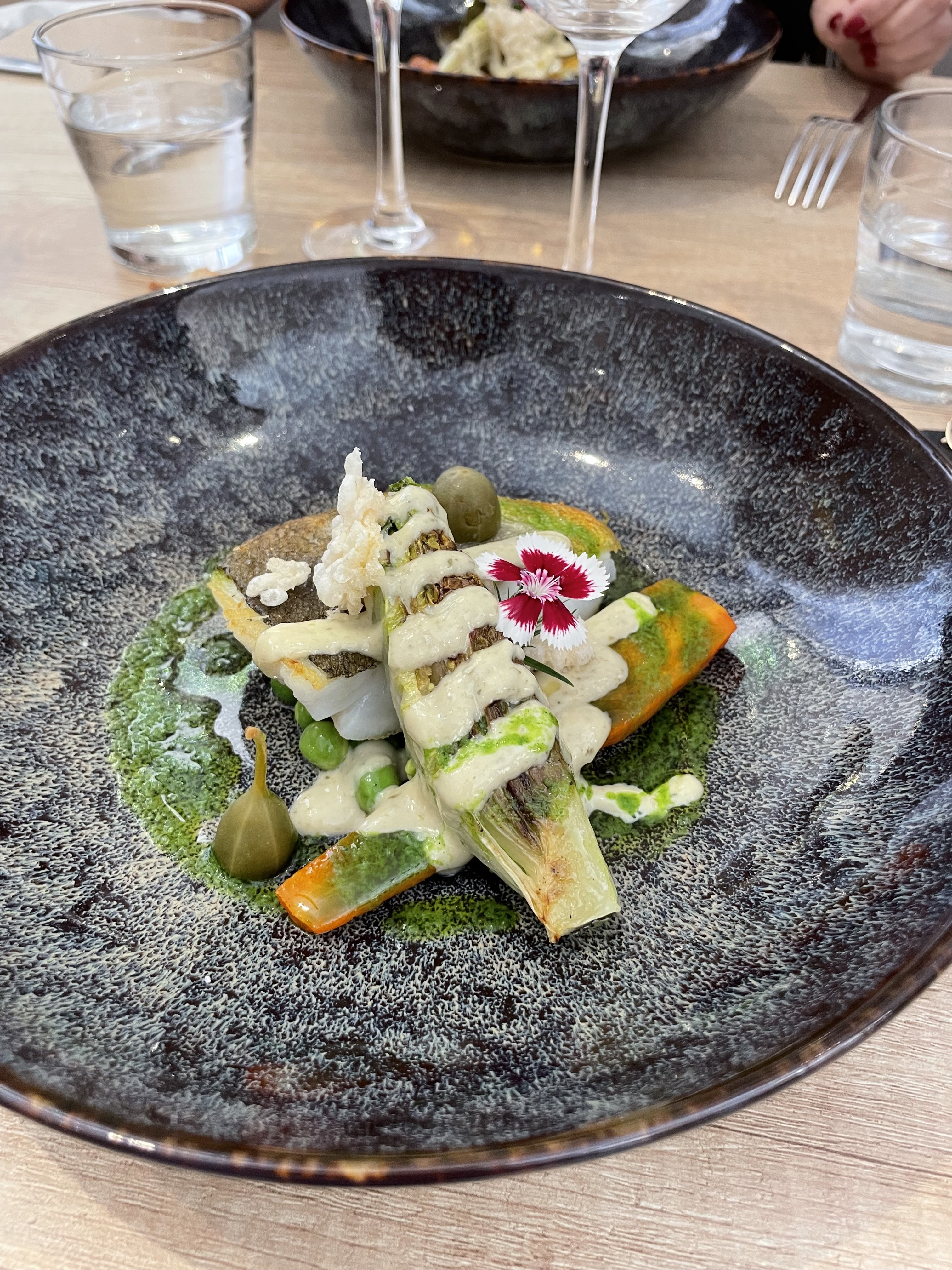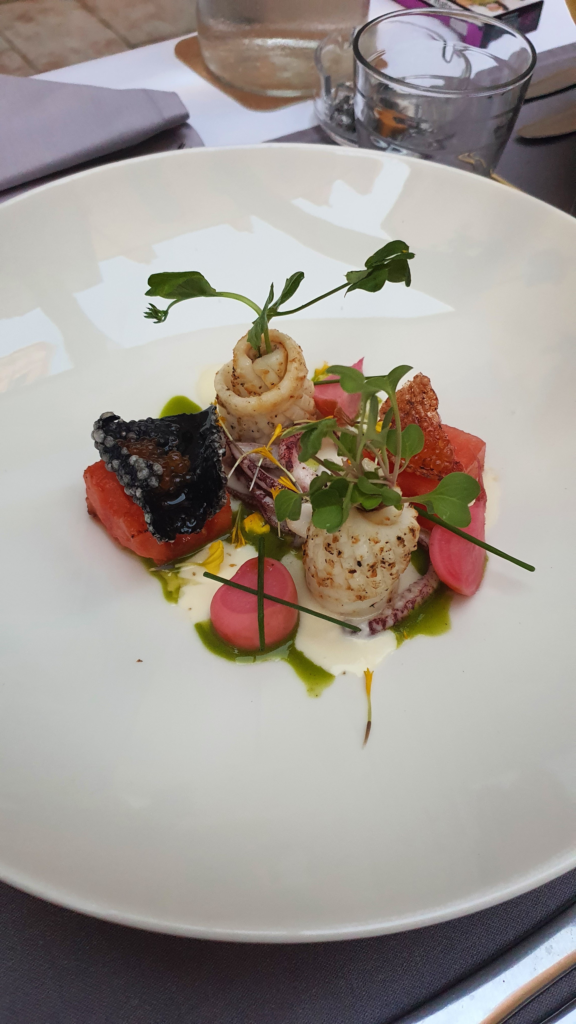 Tout était excellent. J'ai commencé avec une assiette de tomates et burrata mozzarella. Je n'en ai jamais goûté de meilleur, il y avait aussi des fraises vinaigrées et du crumble au sésame. J'ai ensuite choisi du poisson blanc (Maigre en français) avec des courgettes sous plusieurs formes (purée, grillée, moelleuse,...). Enfin, pour le dessert, j'ai eu une structure abricot/estragon, qui était absolument divine. J'ai également ajouté des photos des assiettes des autres personnes.