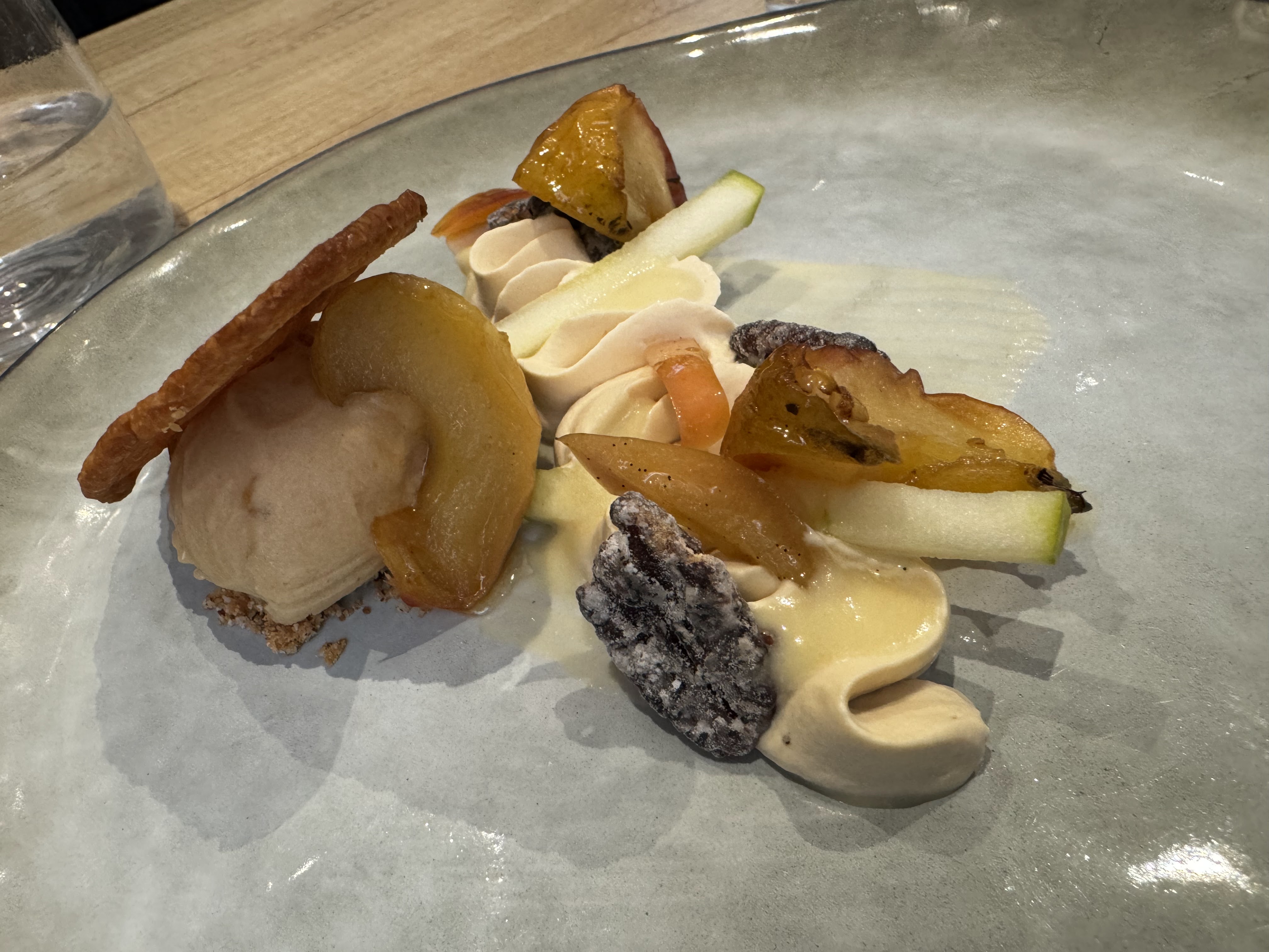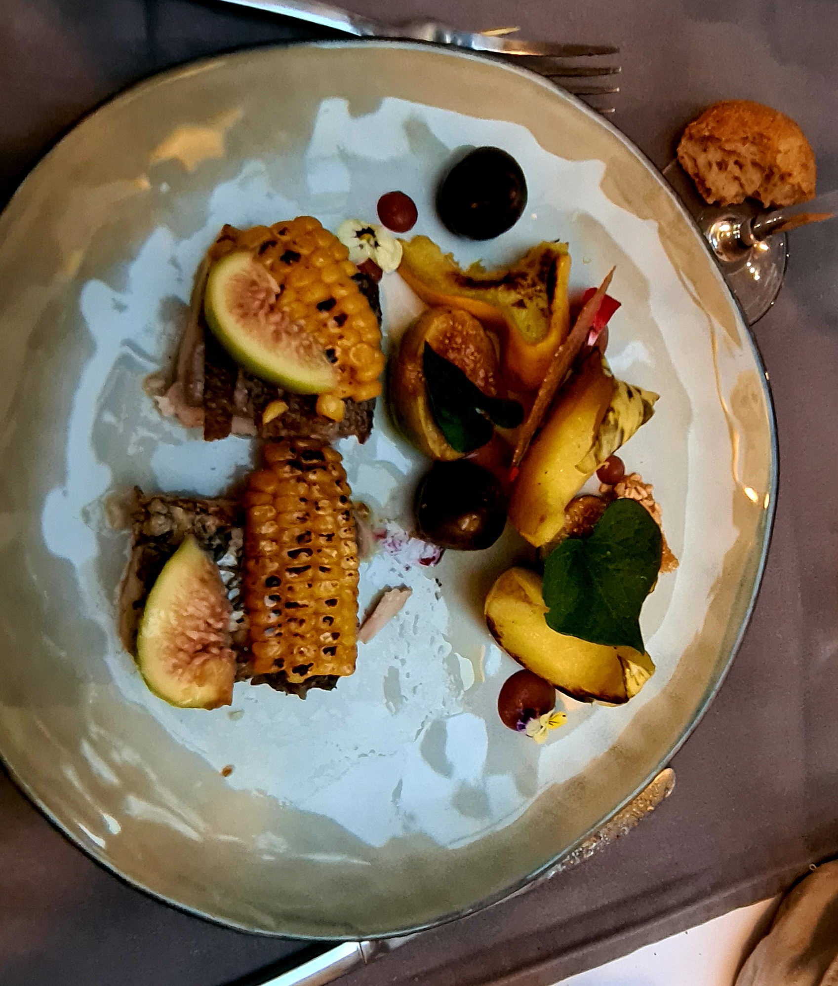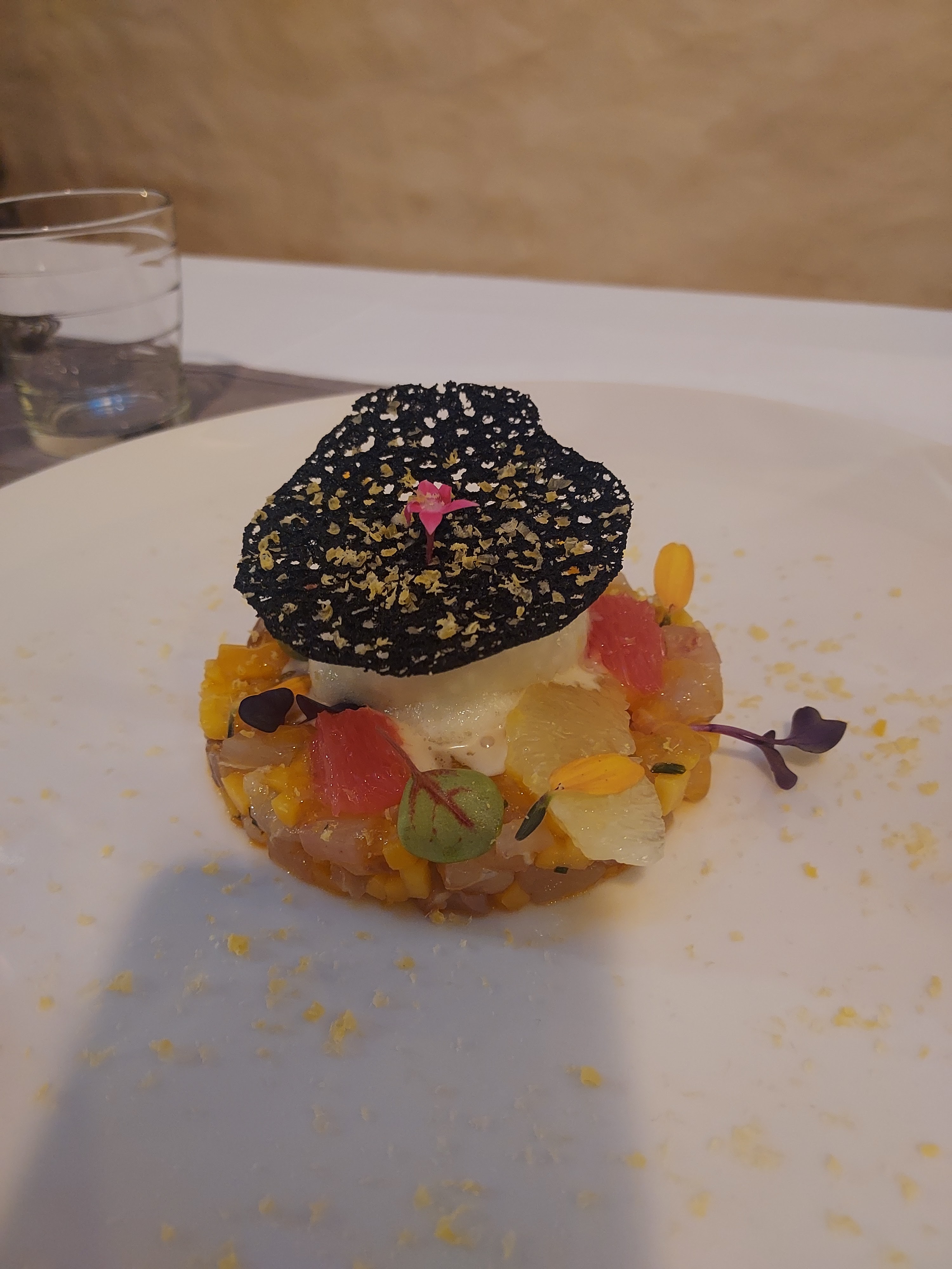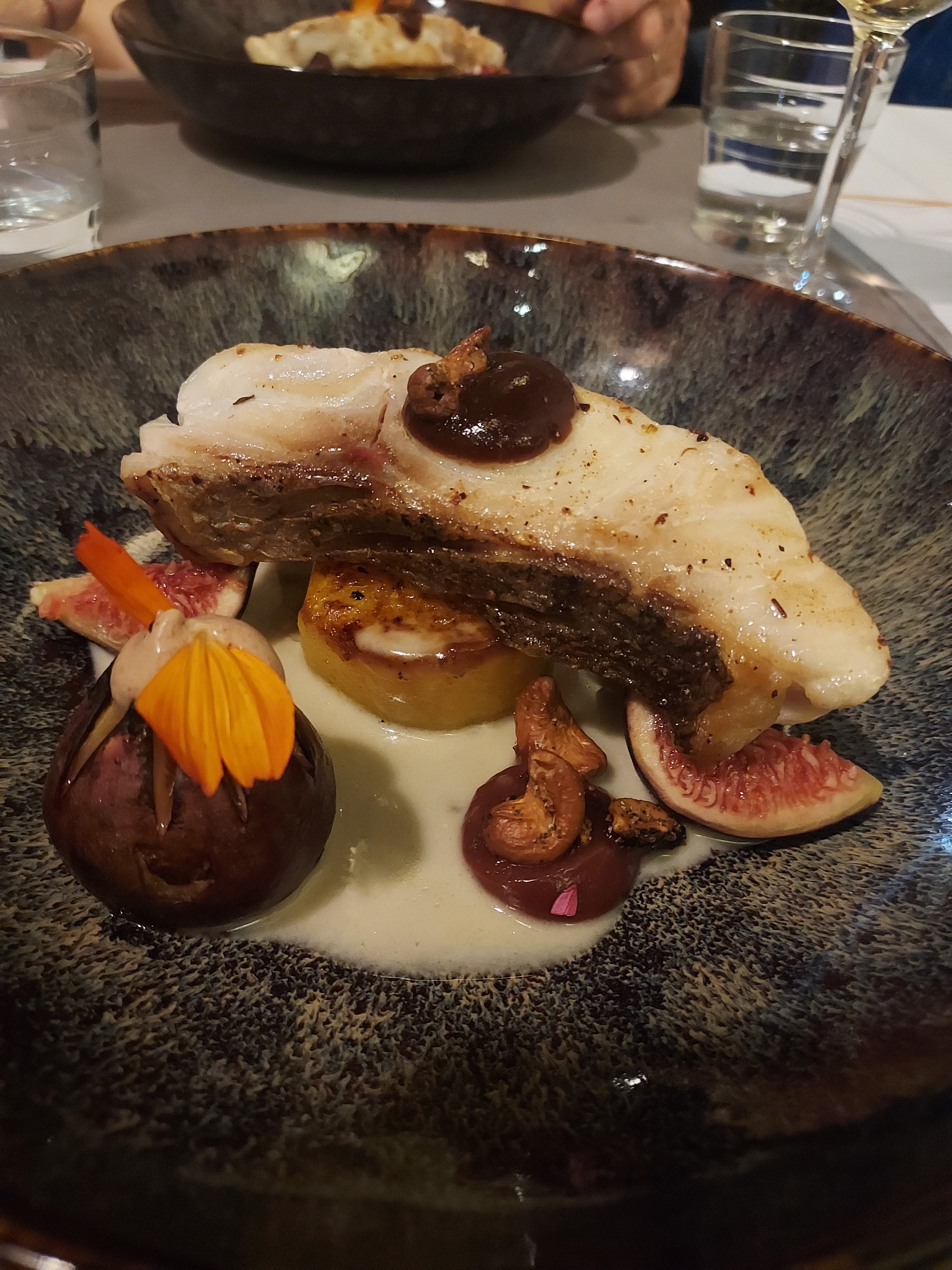 Tout était excellent. J'ai commencé avec une assiette de tomates et burrata mozzarella. Je n'en ai jamais goûté de meilleur, il y avait aussi des fraises vinaigrées et du crumble au sésame. J'ai ensuite choisi du poisson blanc (Maigre en français) avec des courgettes sous plusieurs formes (purée, grillée, moelleuse,...). Enfin, pour le dessert, j'ai eu une structure abricot/estragon, qui était absolument divine. J'ai également ajouté des photos des assiettes des autres personnes.