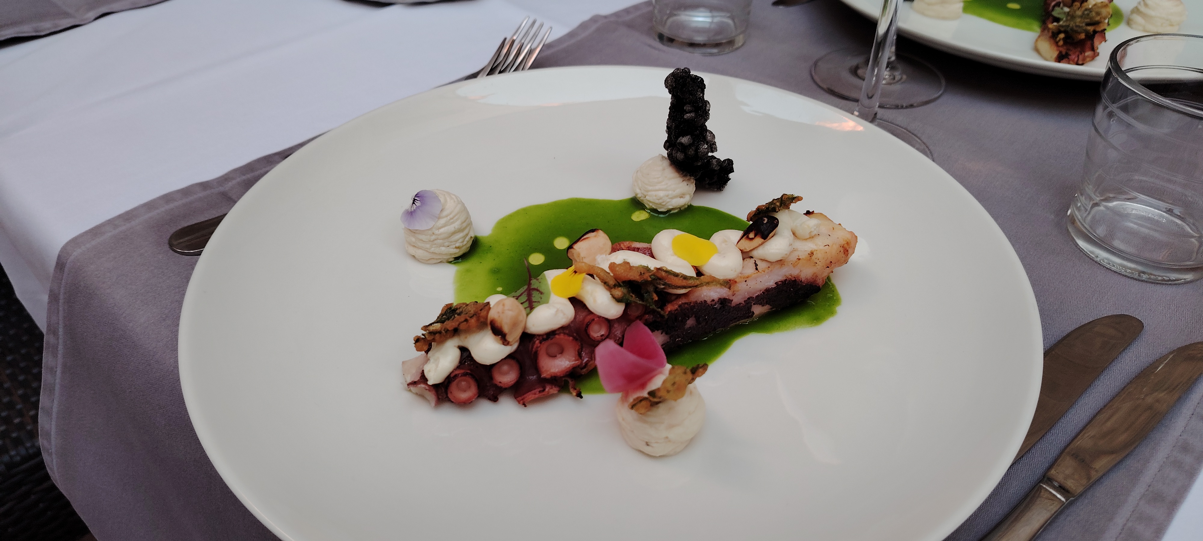 Des plats de qualité, beaux et extrêmement créatifs, élégants dans le mélange des saveurs et la présentation visuelle. Le personnel est très professionnel, sympathique et explique en détail le menu et les plats. Le poulpe est parfaitement tendre avec un assaisonnement parfait. Bien que nous ayons dîné à l'intérieur, leur terrasse extérieure est absolument magnifique dans un cadre cloîtré. Je reviendrai pour savourer davantage !