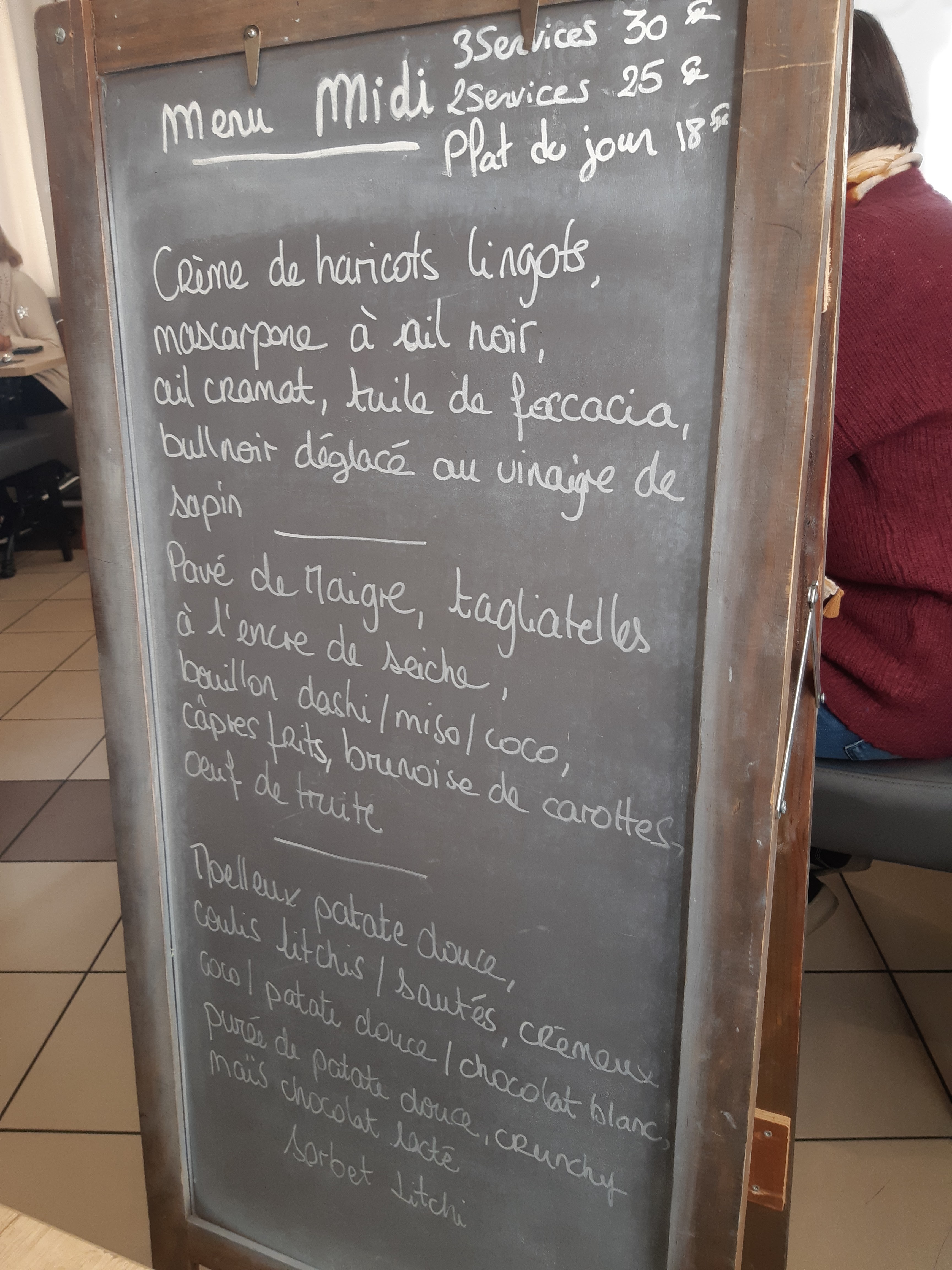 Menu unique le midi . Mais c'est hyper bon et très bien présenté . Le service est au petit soin malgré le monde et la demande qui peut être plus importante car c'est un service du midi . Pour une première fois ,je suis enchantée et je n'hésiterai pas à y aller le soir . La carte semble vraiment délicieuse . Merci pour ce beau moment de découverte 🙋