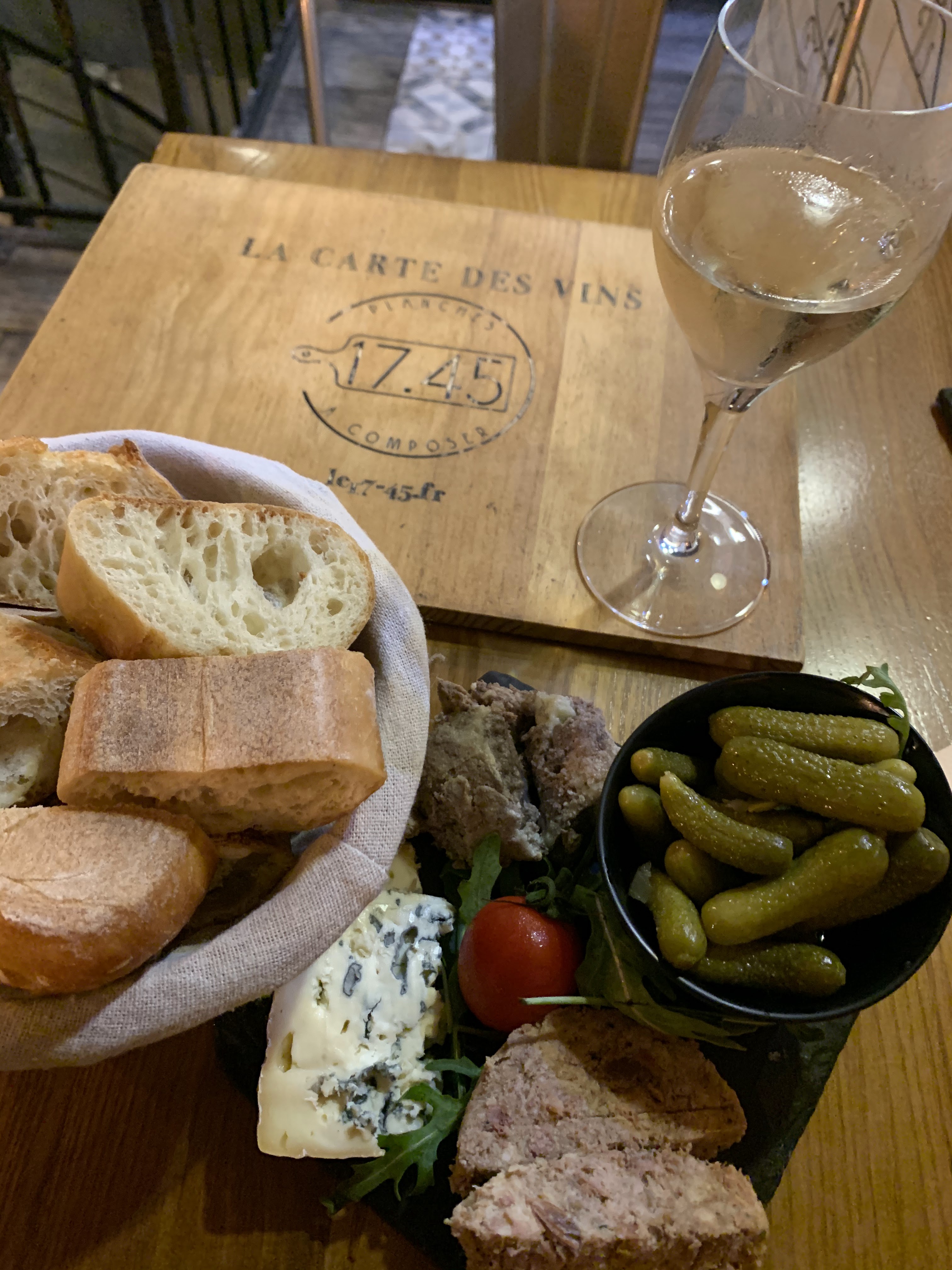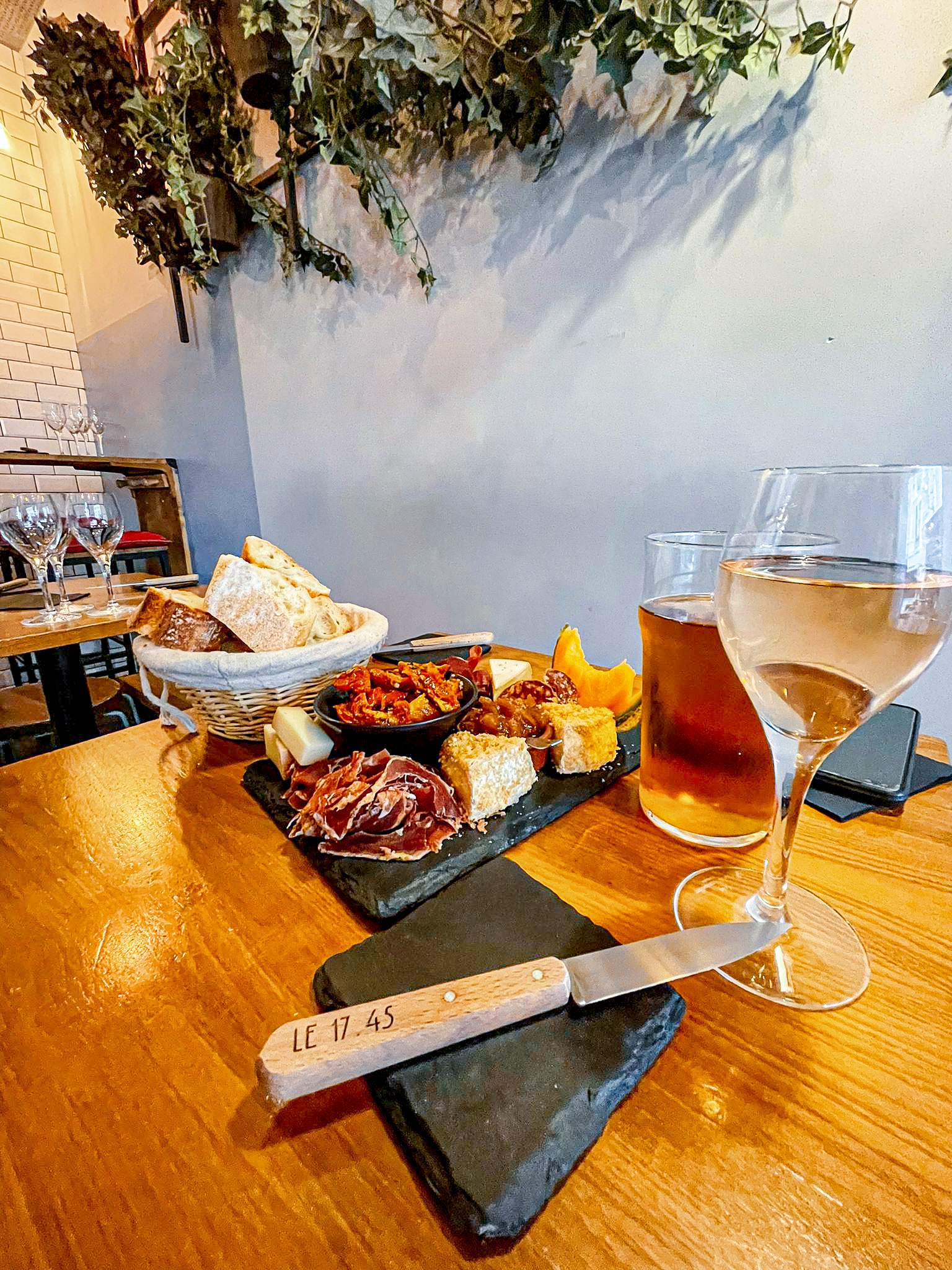 composer sa planche, un jeu d’enfant? Et bien non! Car tout a l’air délicieux et tout est délicieux Alors se dire qu’il faut être raisonnable et ne choisir que 3 à 5 produits sur 40 c’est de la torture! Heureusement le 17.45 a tout compris et vous donne la permission de vous faire plaisir : chez nous le gras c’est la vie! Moi j’écoute toujours les consignes alors hop commandons! Planche copieuse sur la table et vin dans les verres nous nous sommes régalés Le service était parfait Rien à redire mais une chose à dire : allez-y!!!