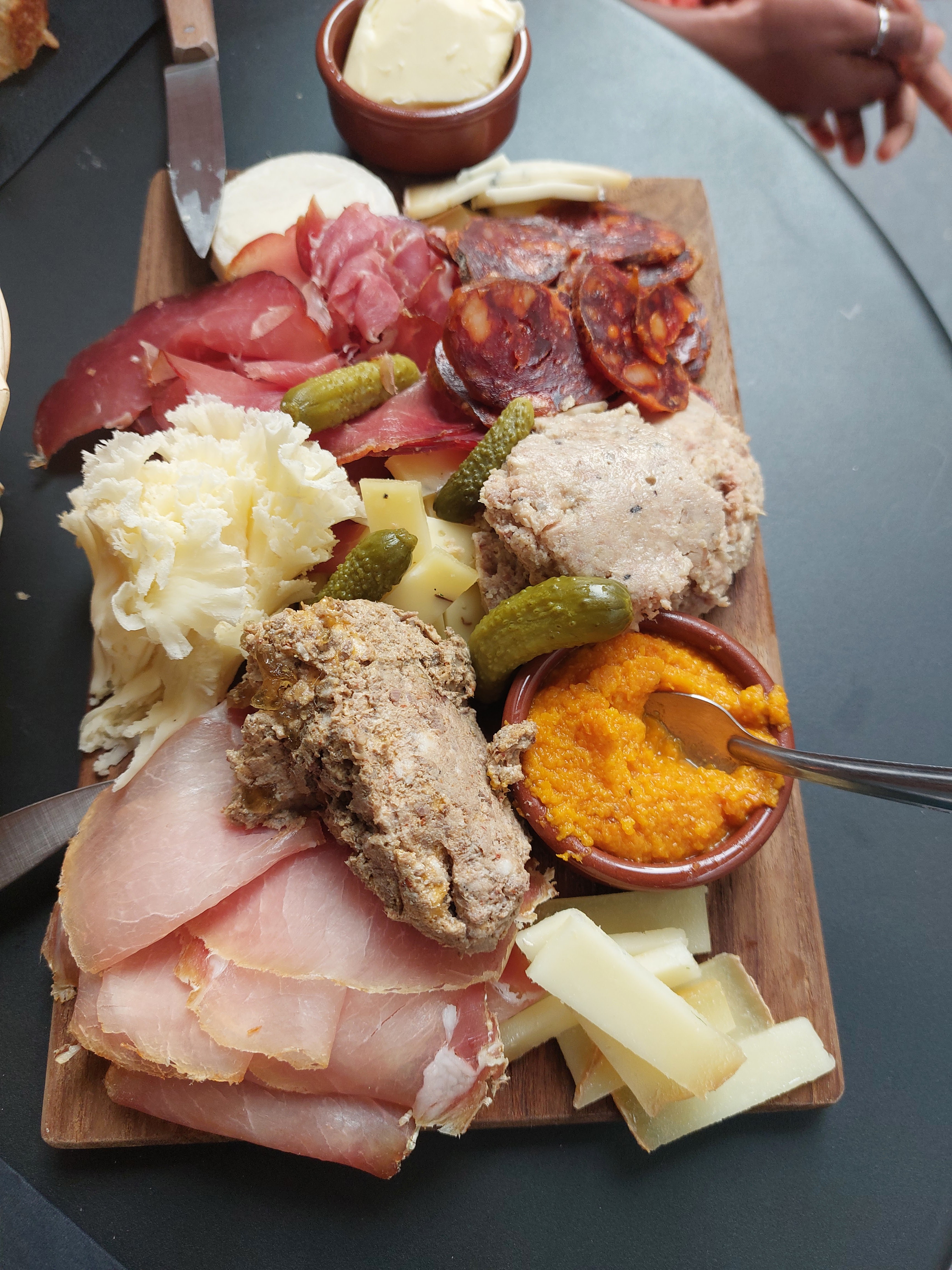 Bon, je n'enleverai pas d'étoile parce que c'est quasi impossible de se garer dans ce quartier. Non, non, un super accueil, une planche totalement à la dimension de notre appétit, des tomates confites et une touche de verdure avec du concombre frais. Belle et généreuse charcut' et bons fromages Ravis quoi ☝️😁