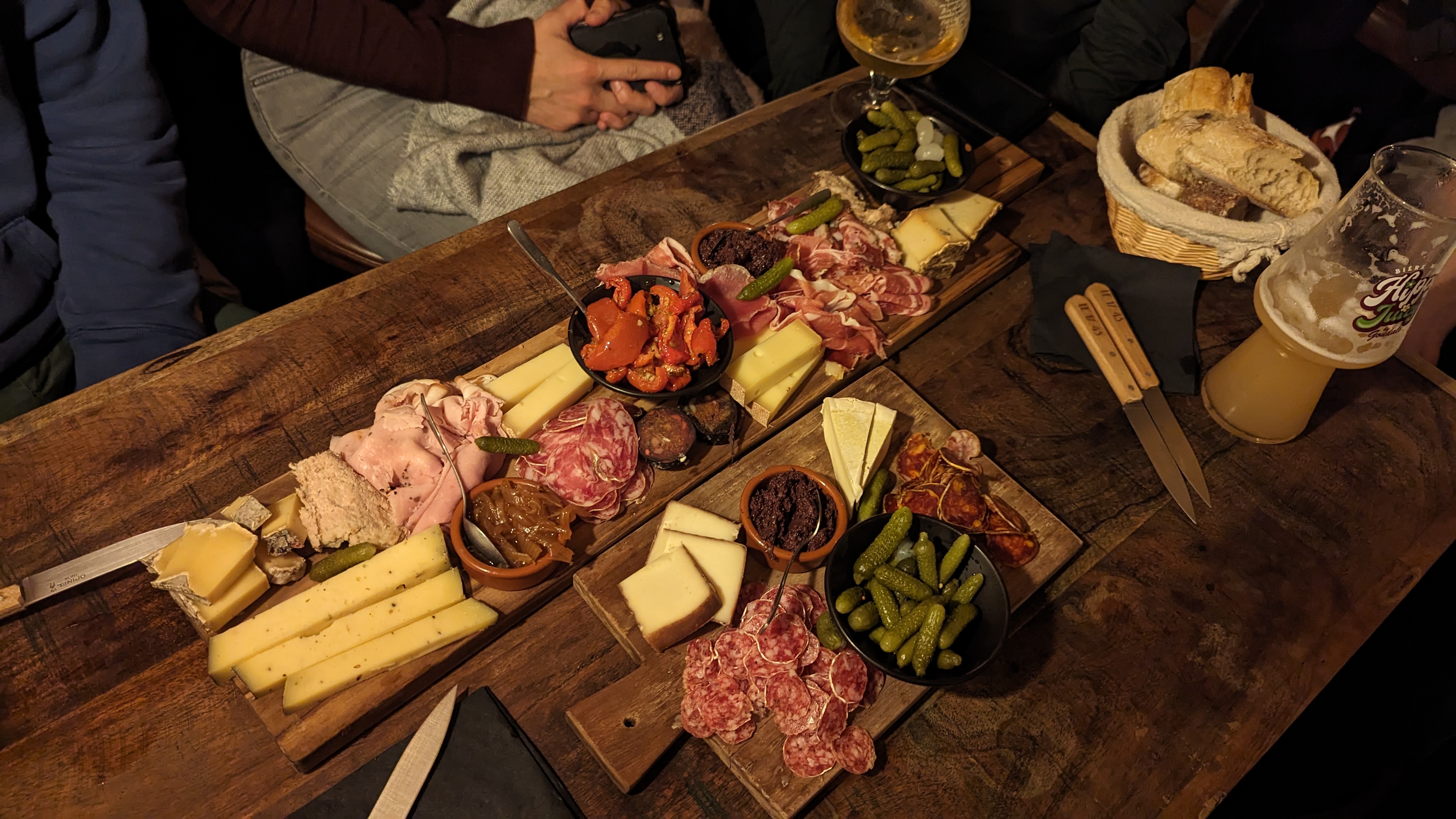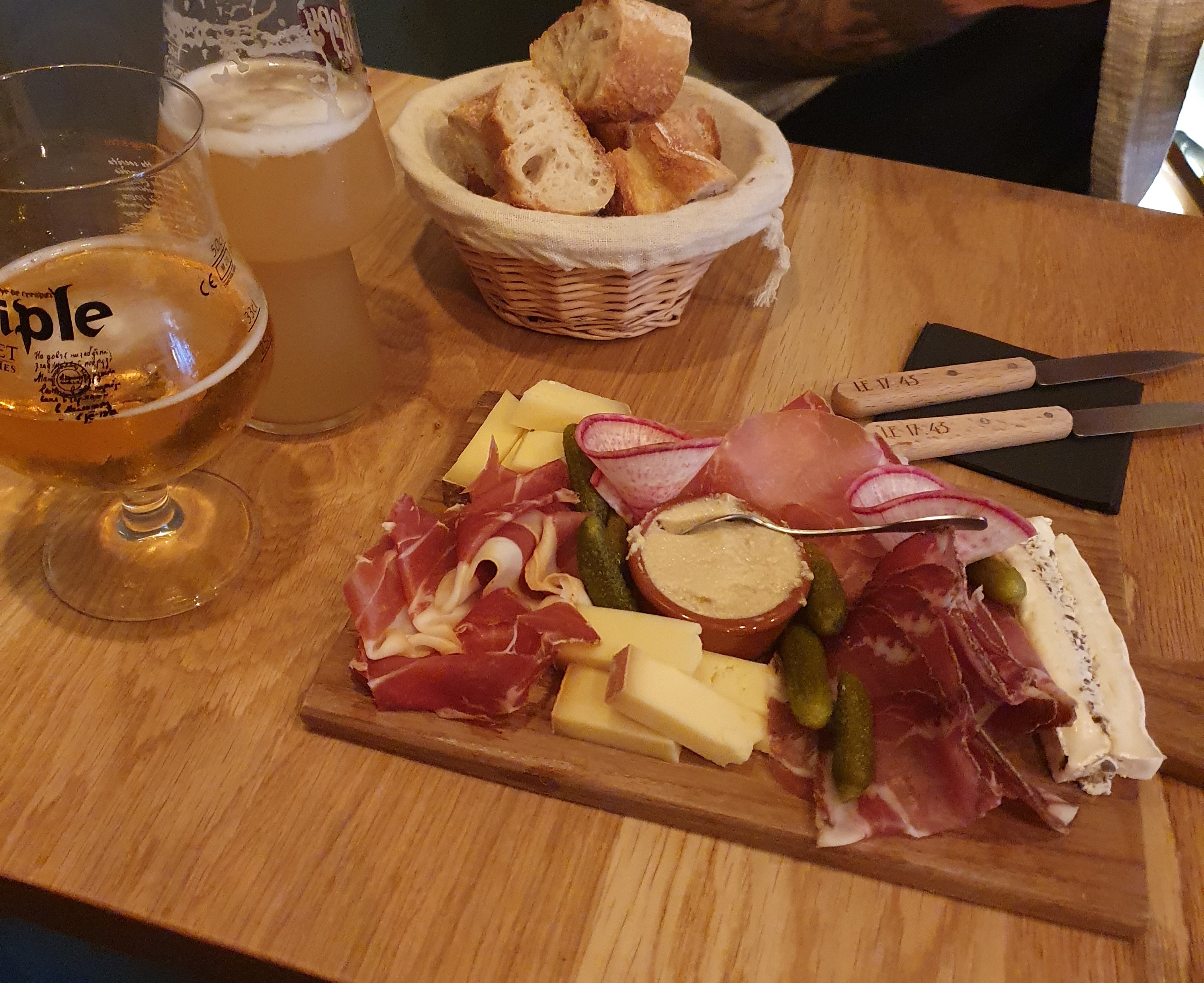 La vraie ambiance lilloise avec des boissons et des planches de fromage et charcuterie