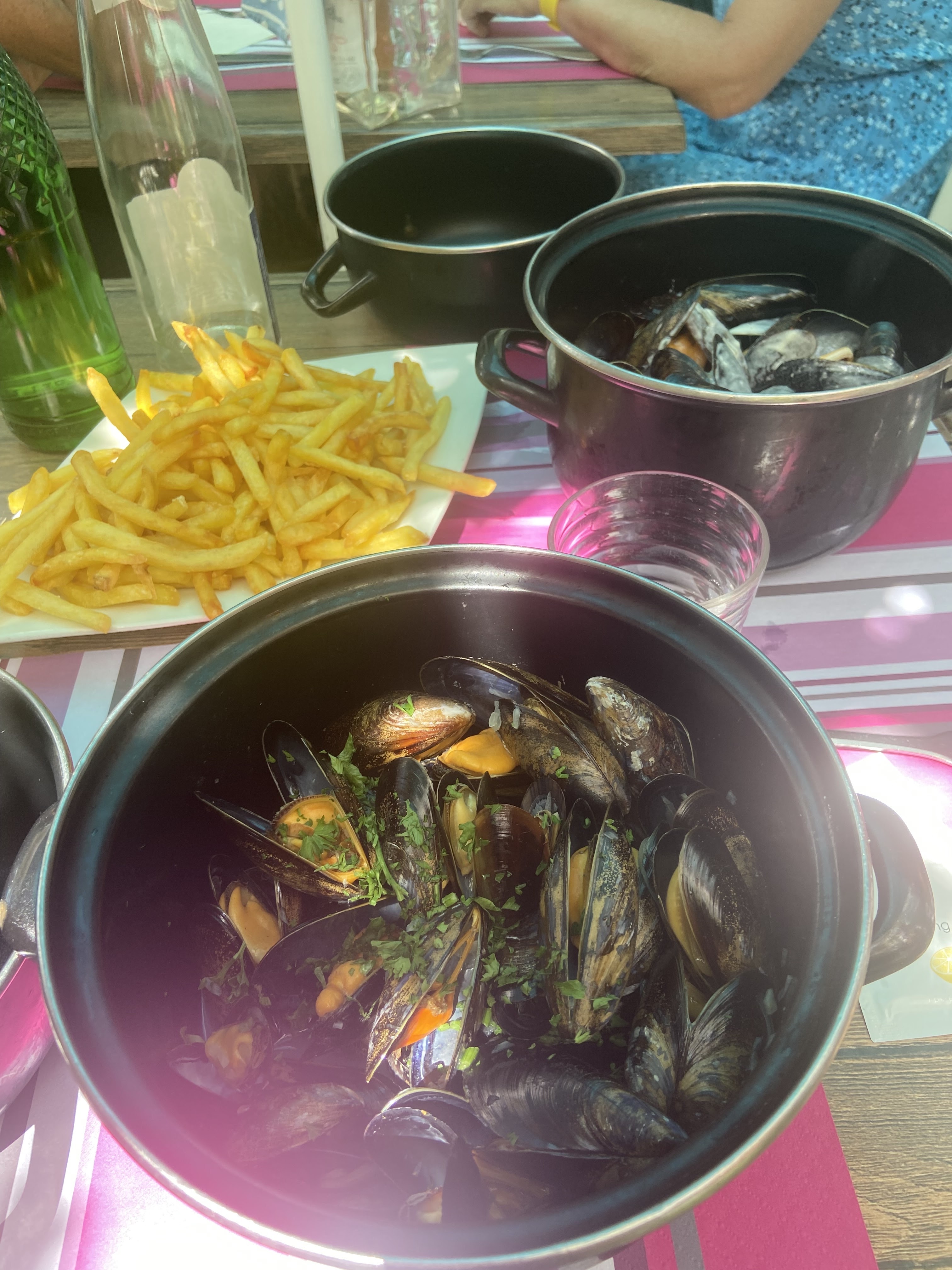 Dégustation de moules frites entre amis sur terrasse atypique et ombragée. Première visite dans ce restaurant et très agréable surprise.